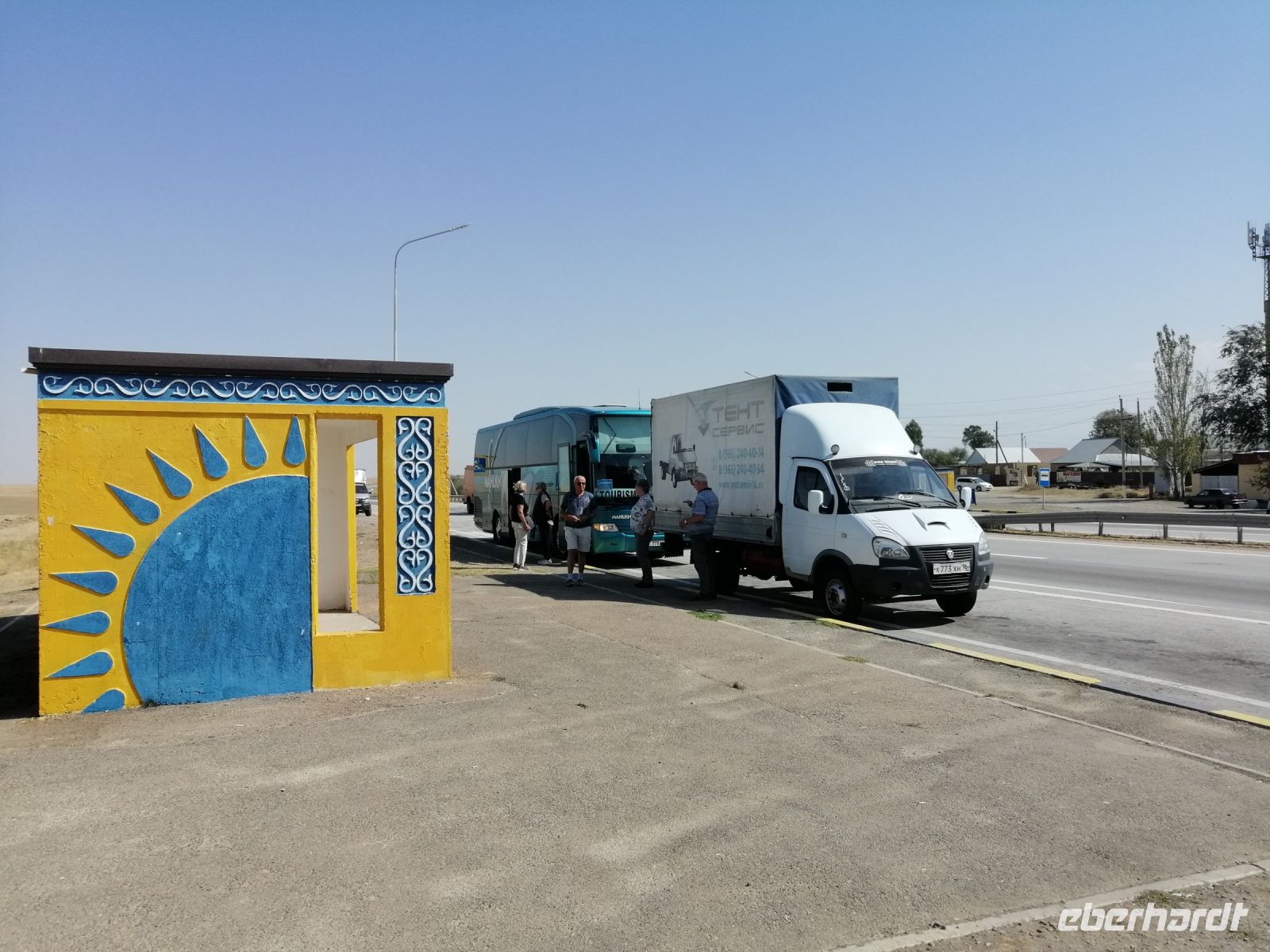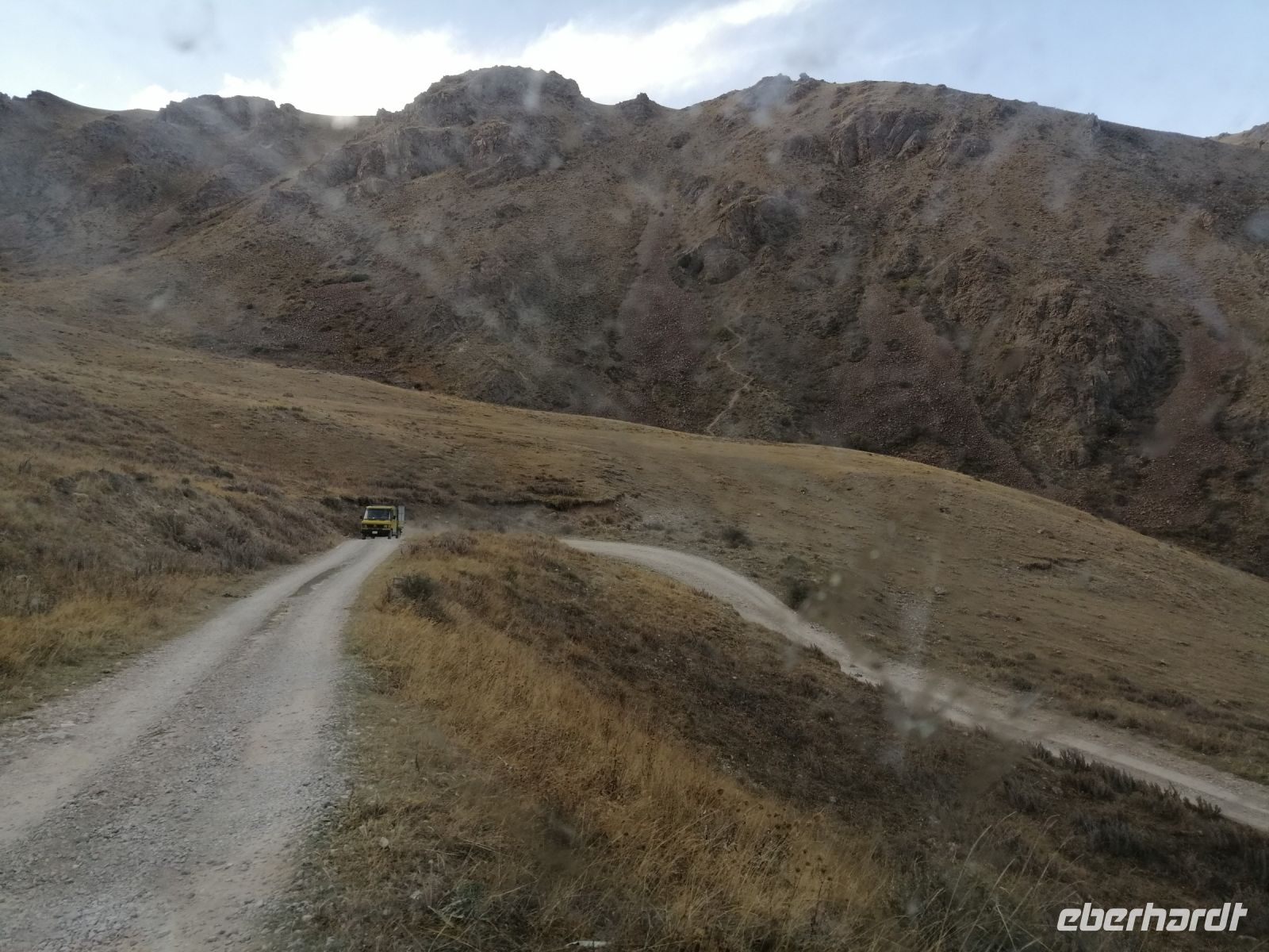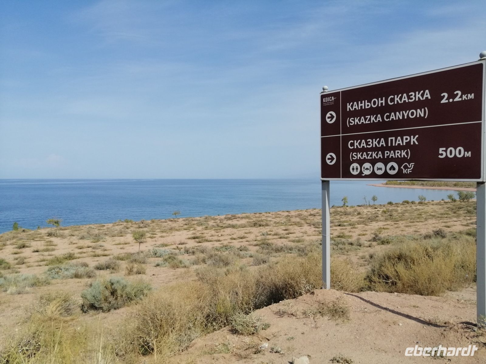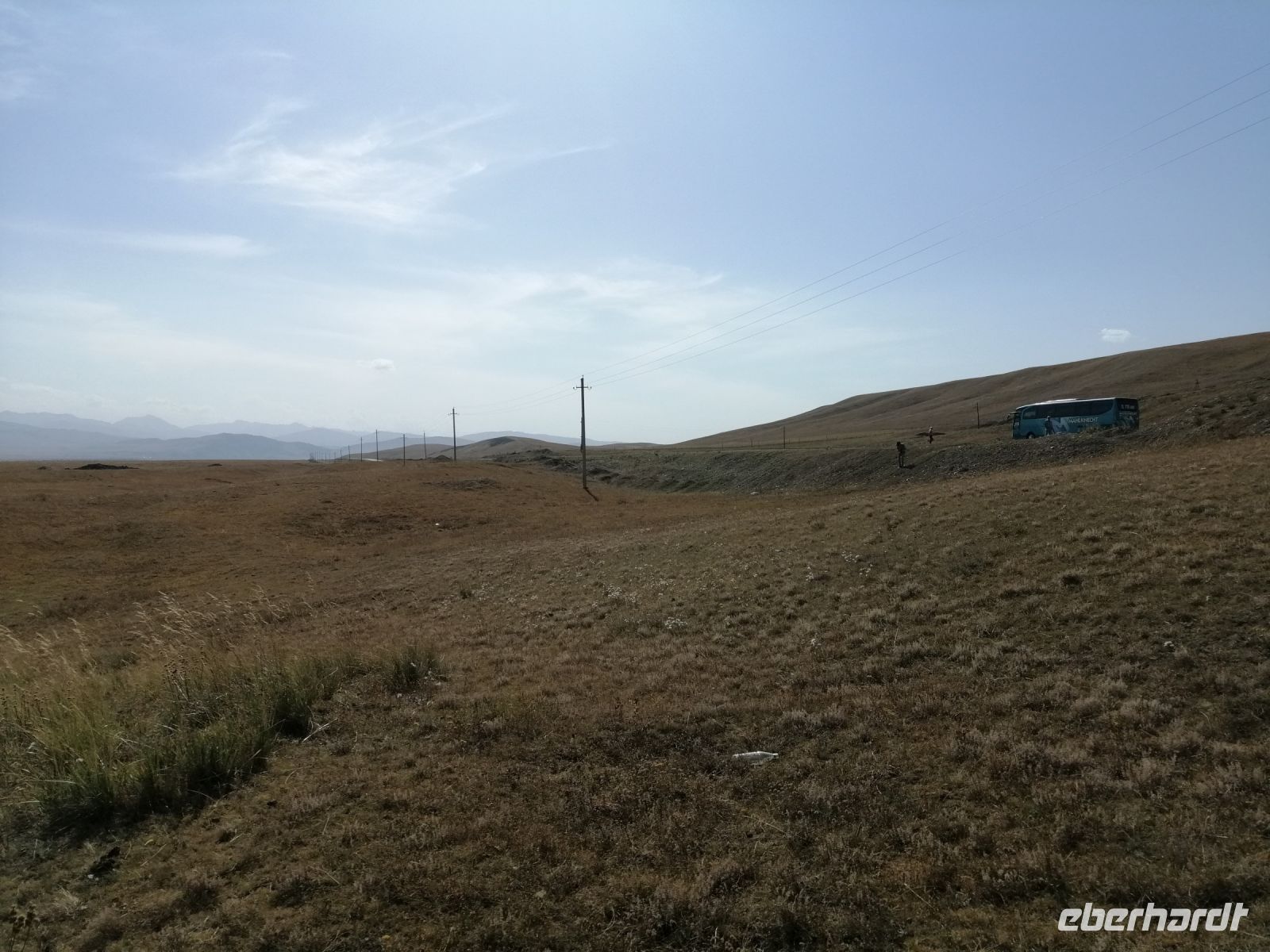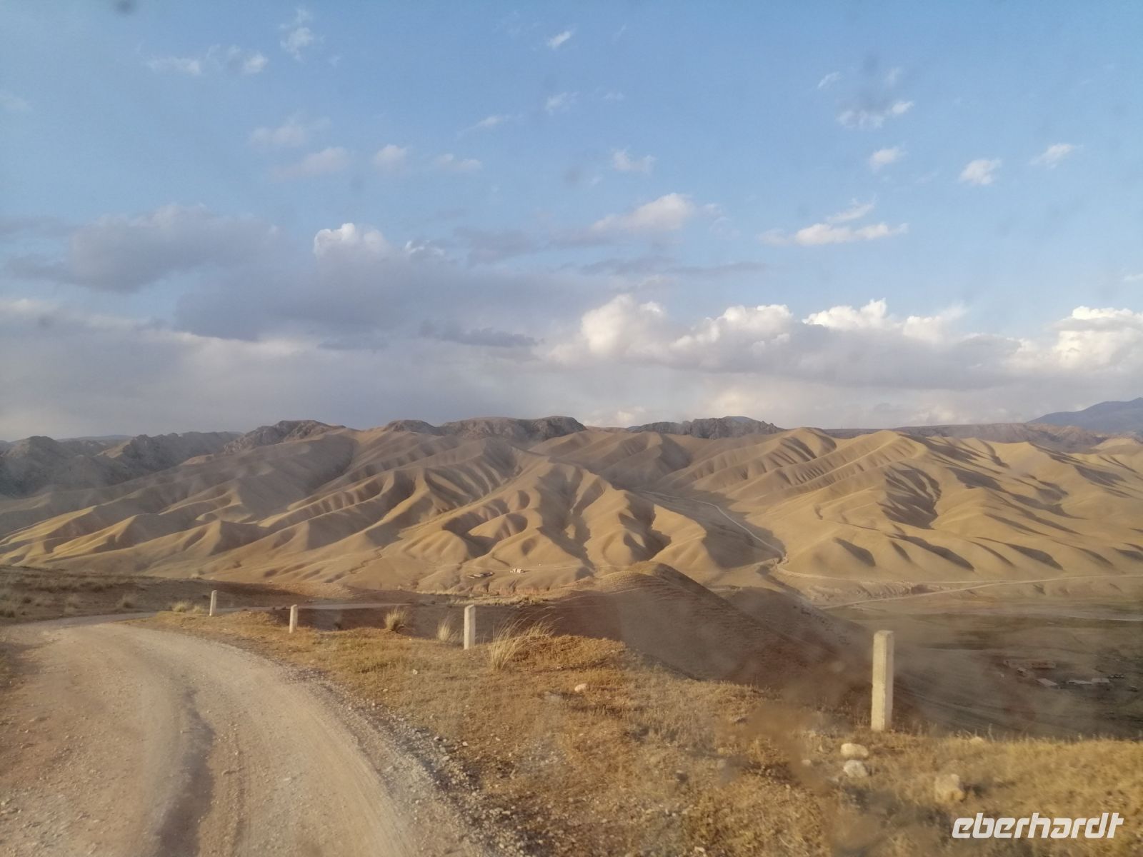 Fast die ganze Straße am Südufer des Issyk Kul-Sees wurde neu gebaut: die Freude für künftige Reisegruppen, motivierte uns die Strapazen der Fahrt nicht ernst zu nehmen. Mit einer kurzen Zwischen-Pause an der Ortotokoi-Talsperre, erreichten wir gegen 12 Uhr die Stadt Kotschkor, wo wir in kleinere Mercedes-Sprinter umstiegen und Richtung Kalmak-Aschuu-Pass starteten.