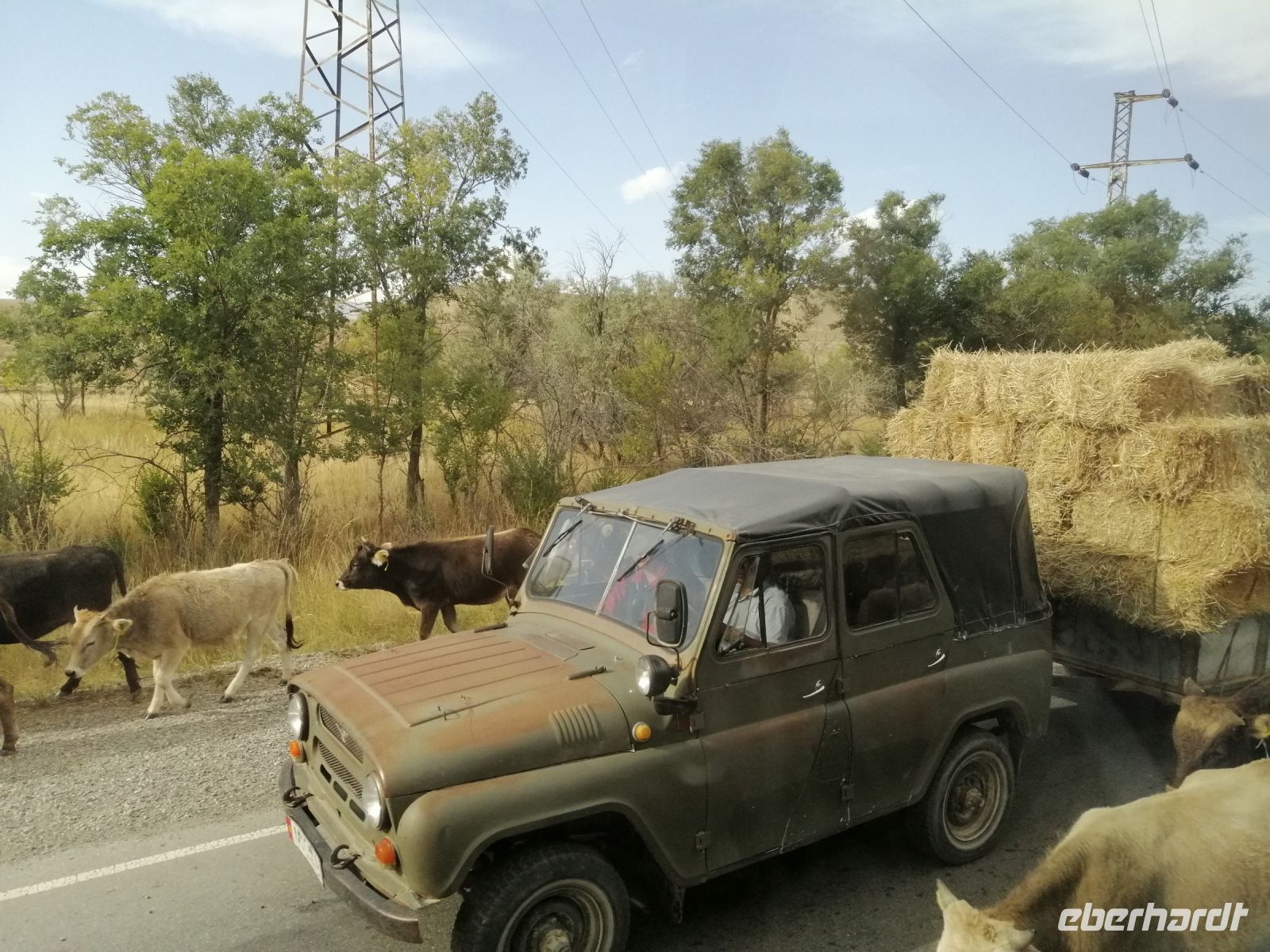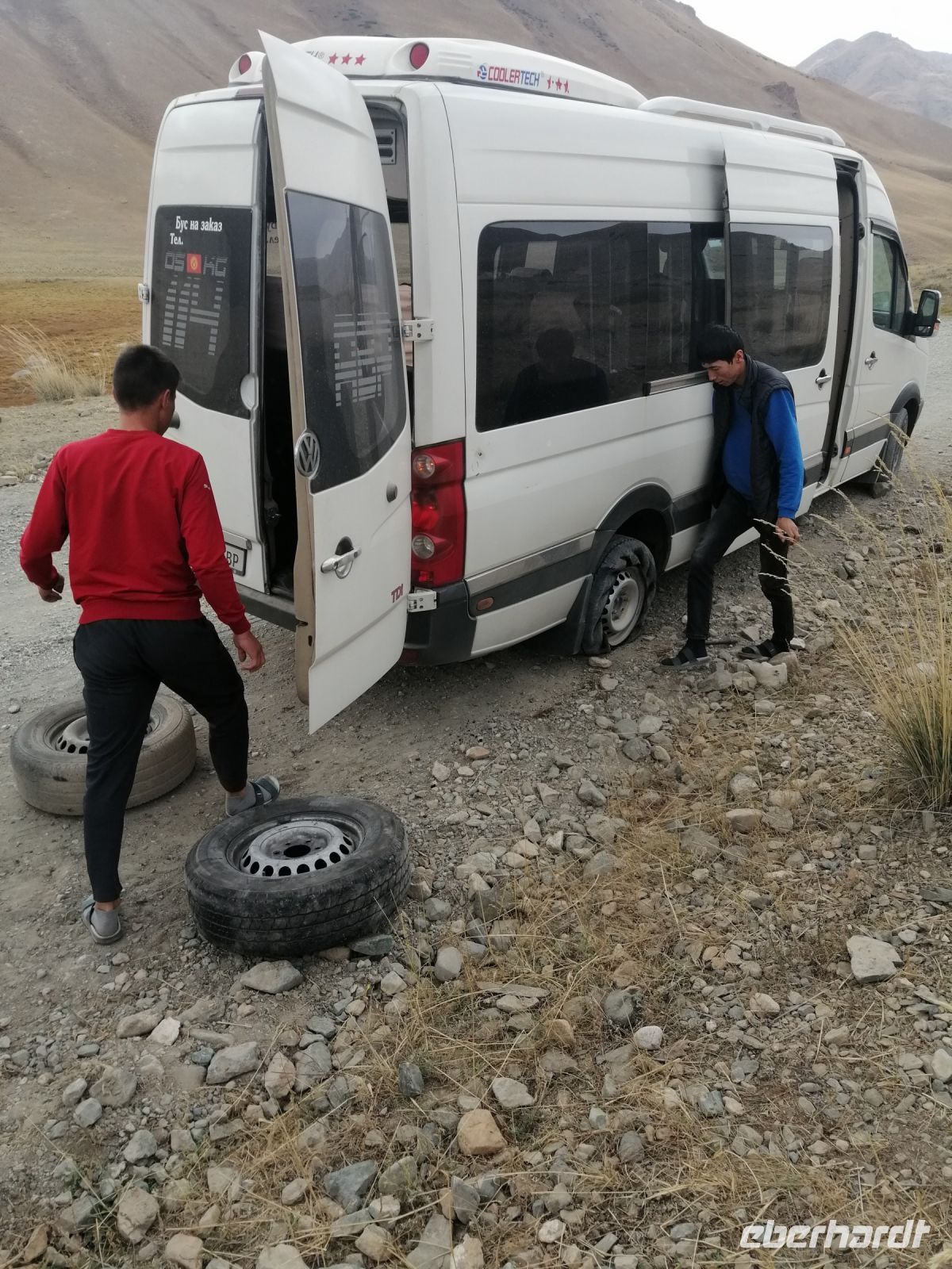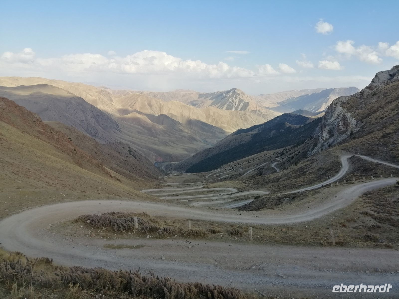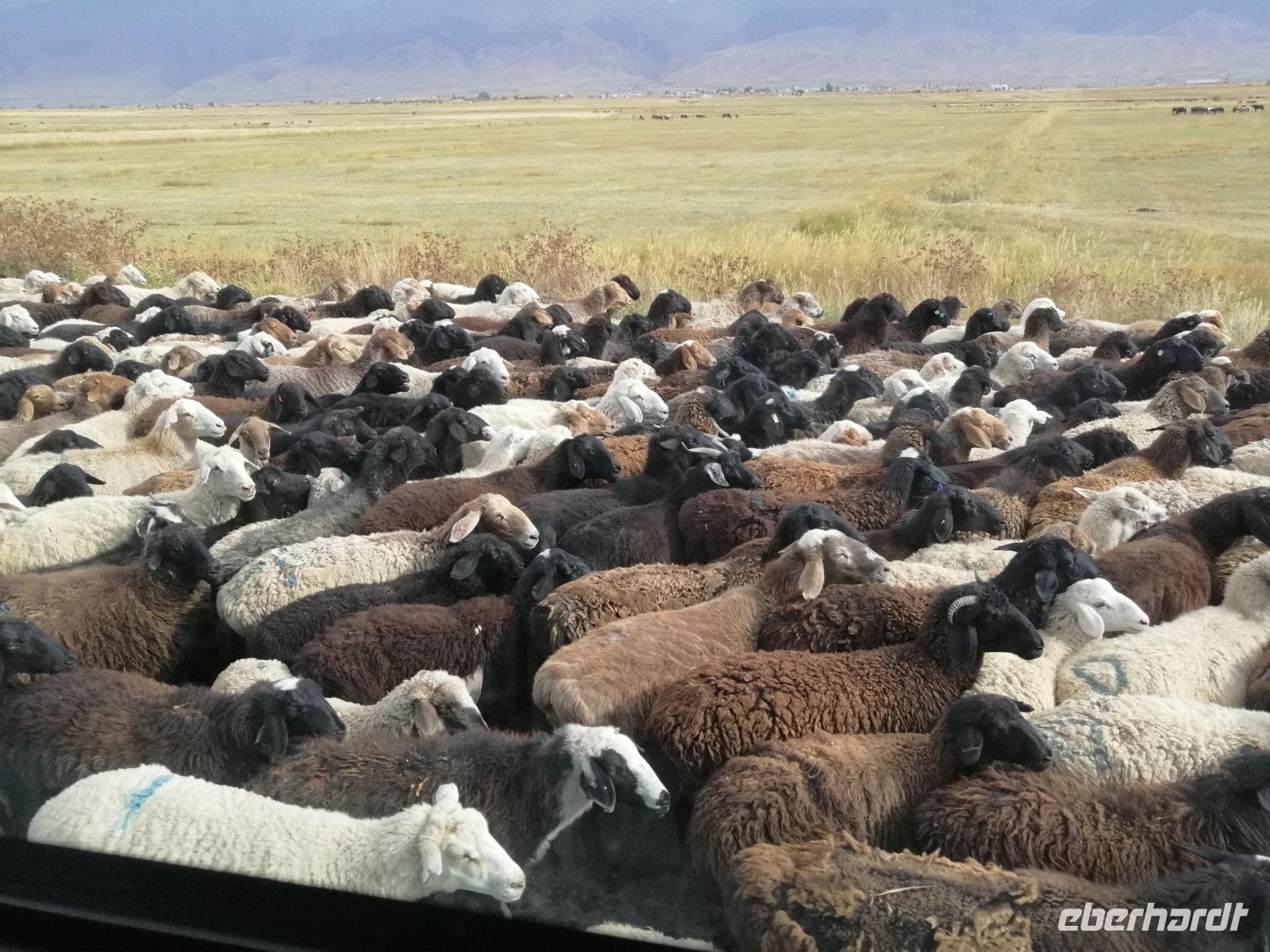 Fast die ganze Straße am Südufer des Issyk Kul-Sees wurde neu gebaut: die Freude für künftige Reisegruppen, motivierte uns die Strapazen der Fahrt nicht ernst zu nehmen. Mit einer kurzen Zwischen-Pause an der Ortotokoi-Talsperre, erreichten wir gegen 12 Uhr die Stadt Kotschkor, wo wir in kleinere Mercedes-Sprinter umstiegen und Richtung Kalmak-Aschuu-Pass starteten.