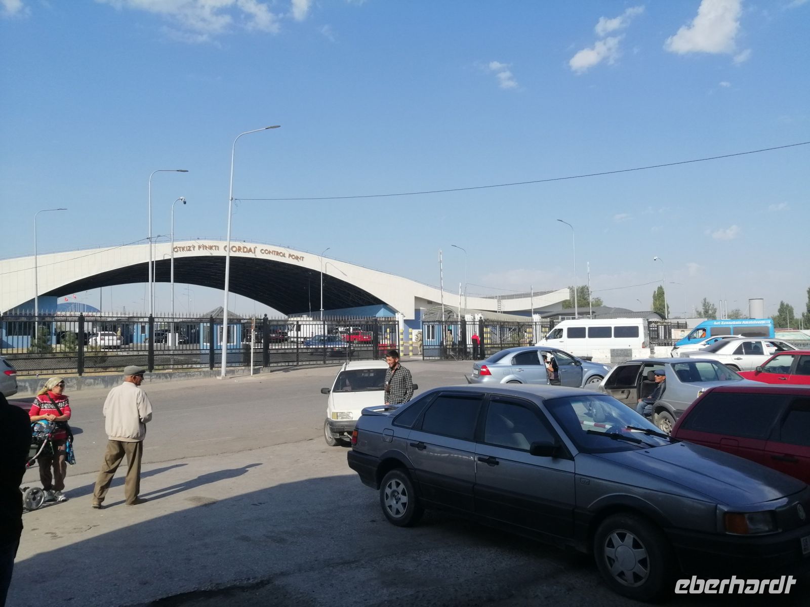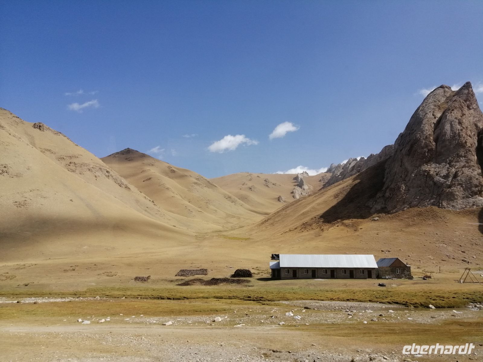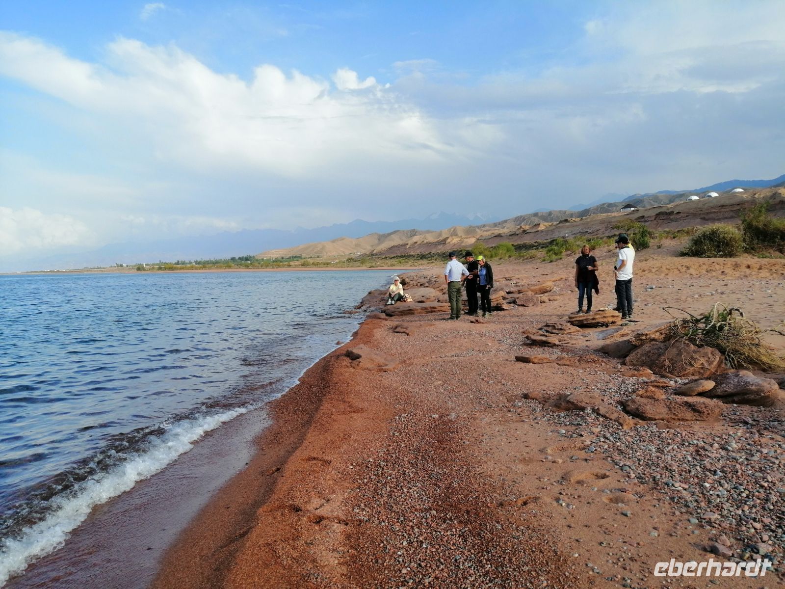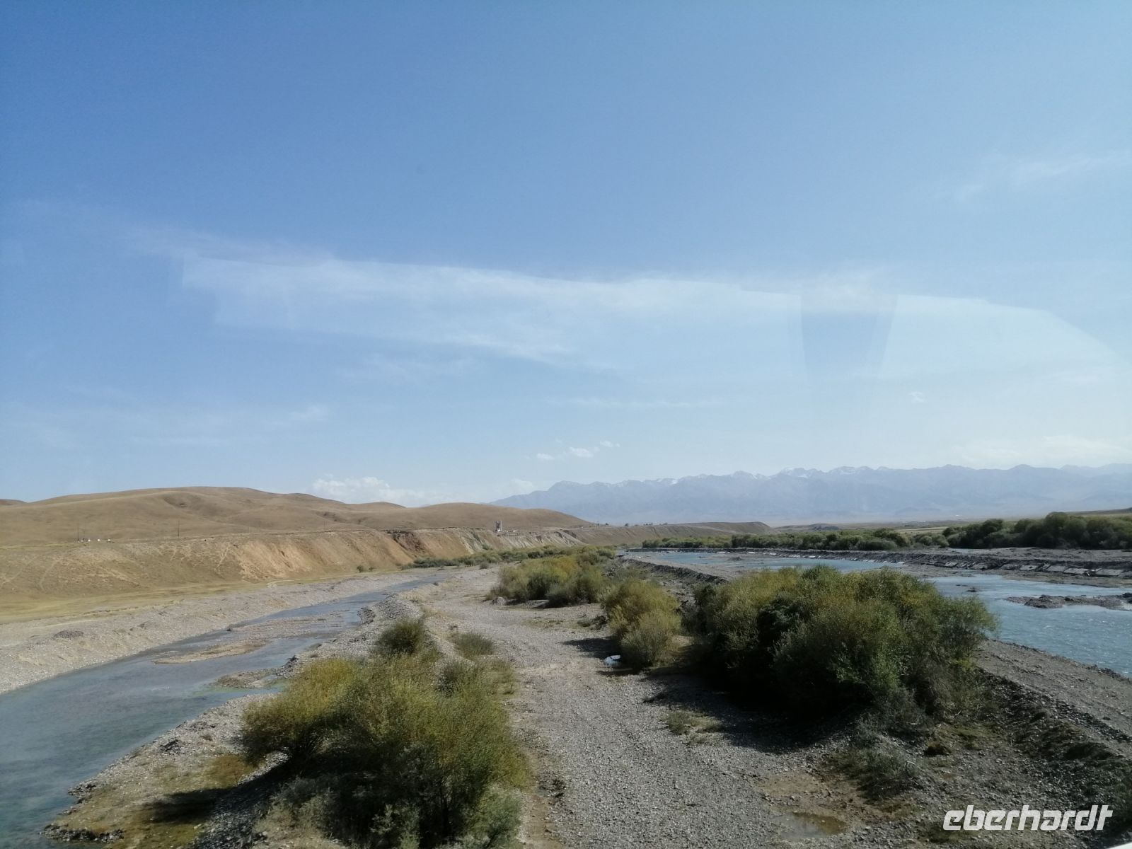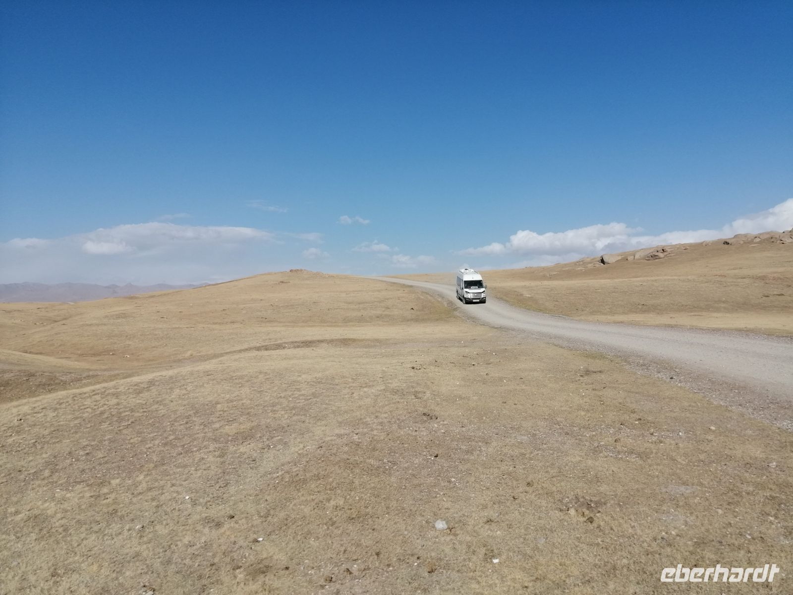 Fast die ganze Straße am Südufer des Issyk Kul-Sees wurde neu gebaut: die Freude für künftige Reisegruppen, motivierte uns die Strapazen der Fahrt nicht ernst zu nehmen. Mit einer kurzen Zwischen-Pause an der Ortotokoi-Talsperre, erreichten wir gegen 12 Uhr die Stadt Kotschkor, wo wir in kleinere Mercedes-Sprinter umstiegen und Richtung Kalmak-Aschuu-Pass starteten.