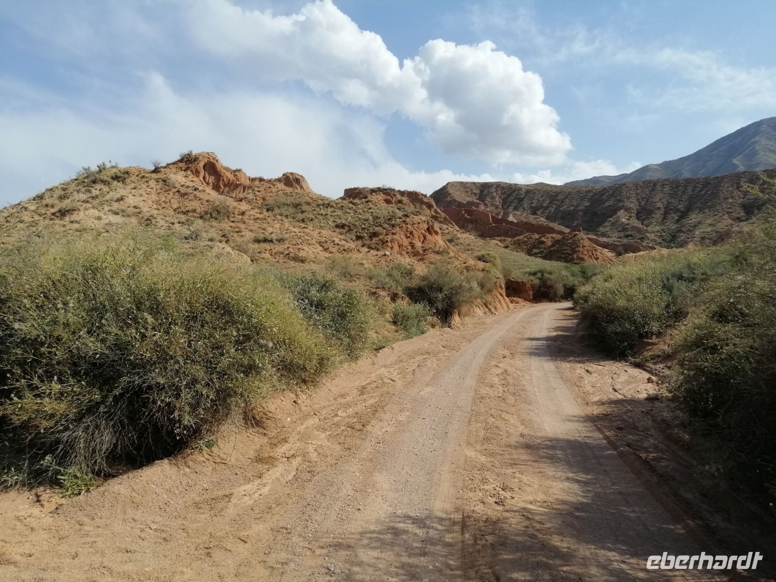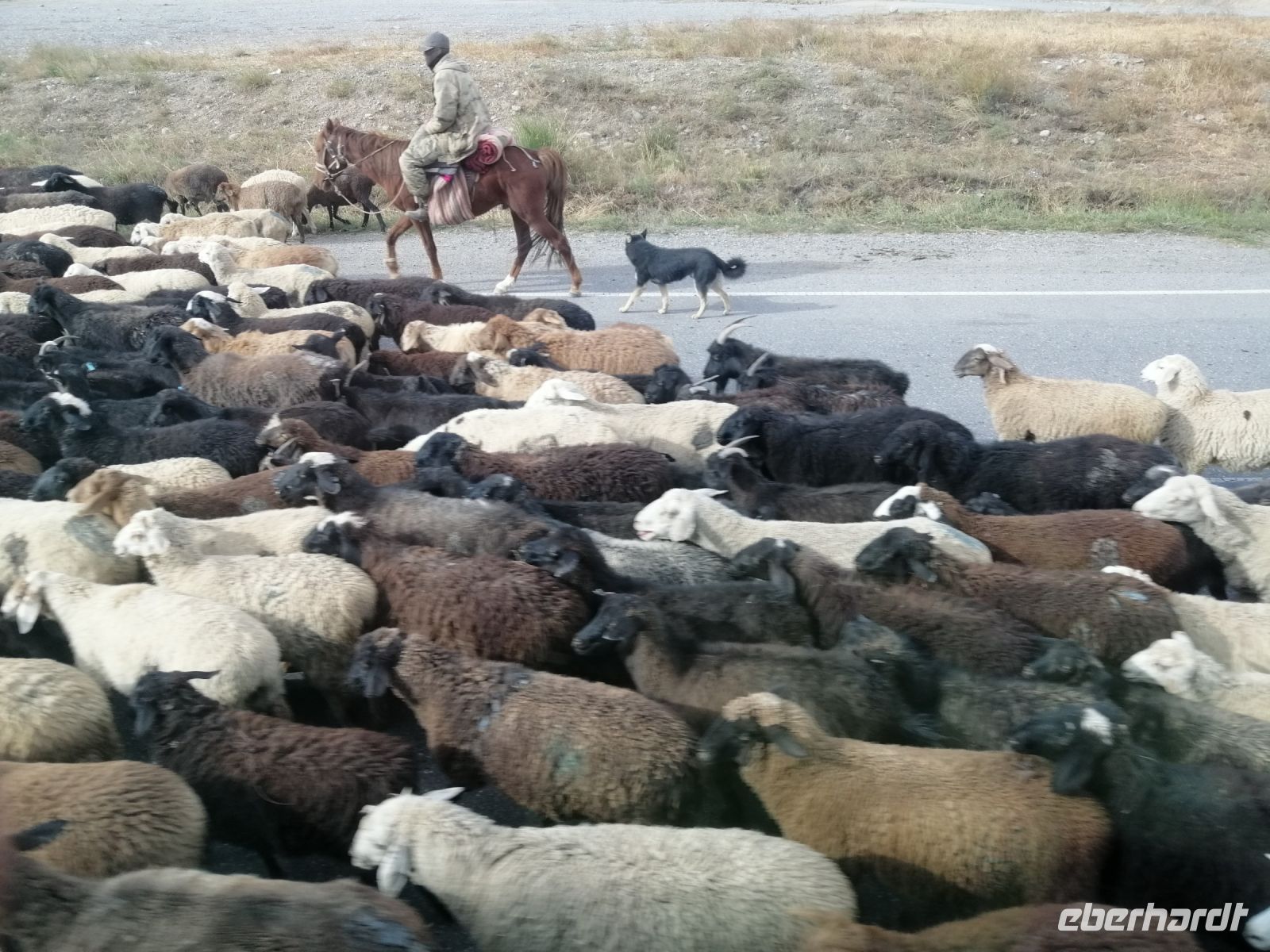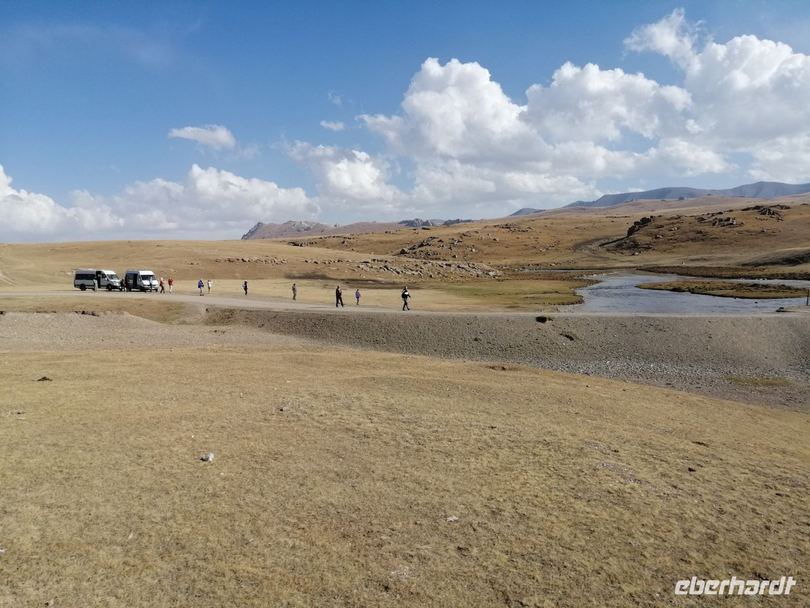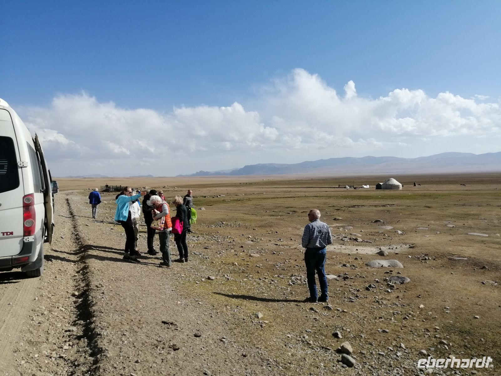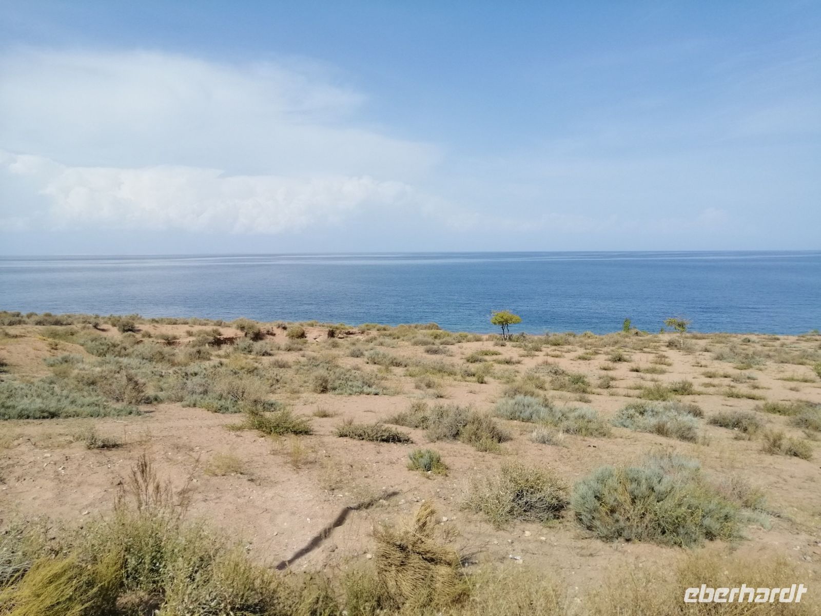 Fast die ganze Straße am Südufer des Issyk Kul-Sees wurde neu gebaut: die Freude für künftige Reisegruppen, motivierte uns die Strapazen der Fahrt nicht ernst zu nehmen. Mit einer kurzen Zwischen-Pause an der Ortotokoi-Talsperre, erreichten wir gegen 12 Uhr die Stadt Kotschkor, wo wir in kleinere Mercedes-Sprinter umstiegen und Richtung Kalmak-Aschuu-Pass starteten.