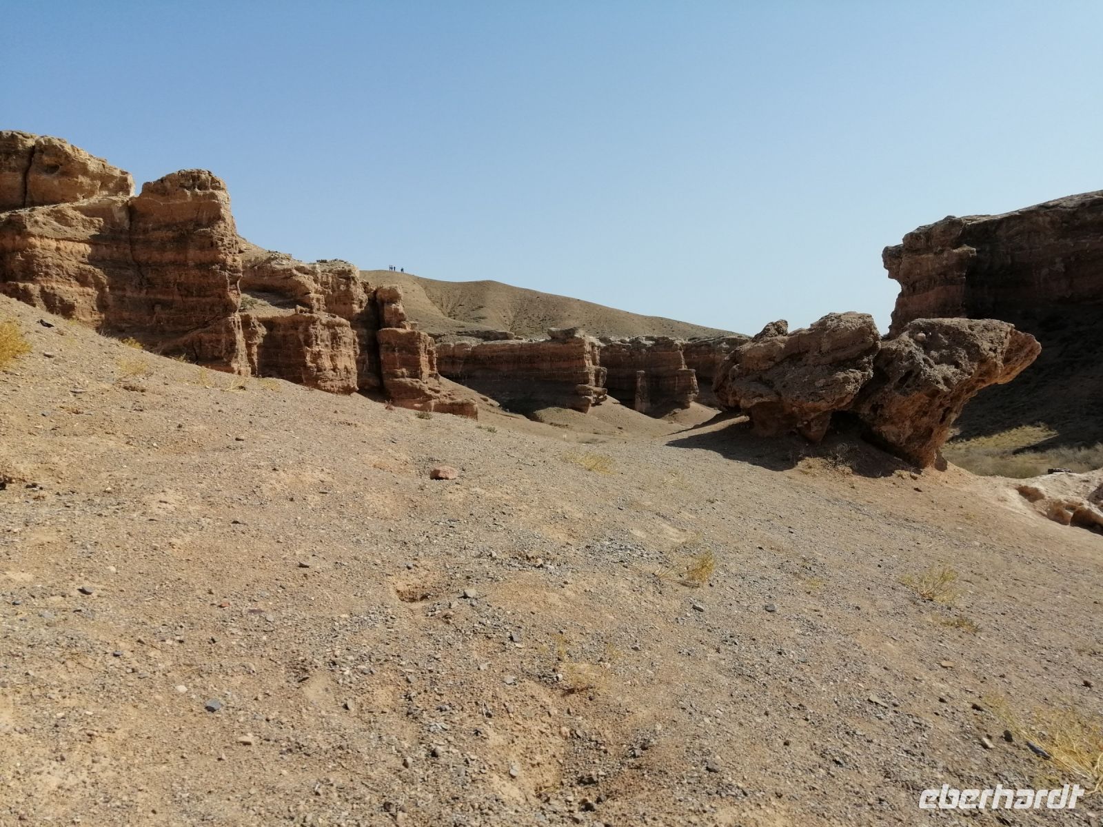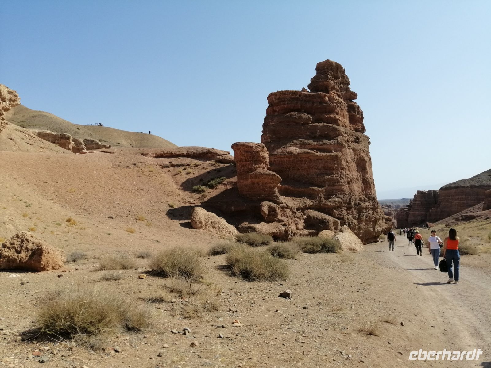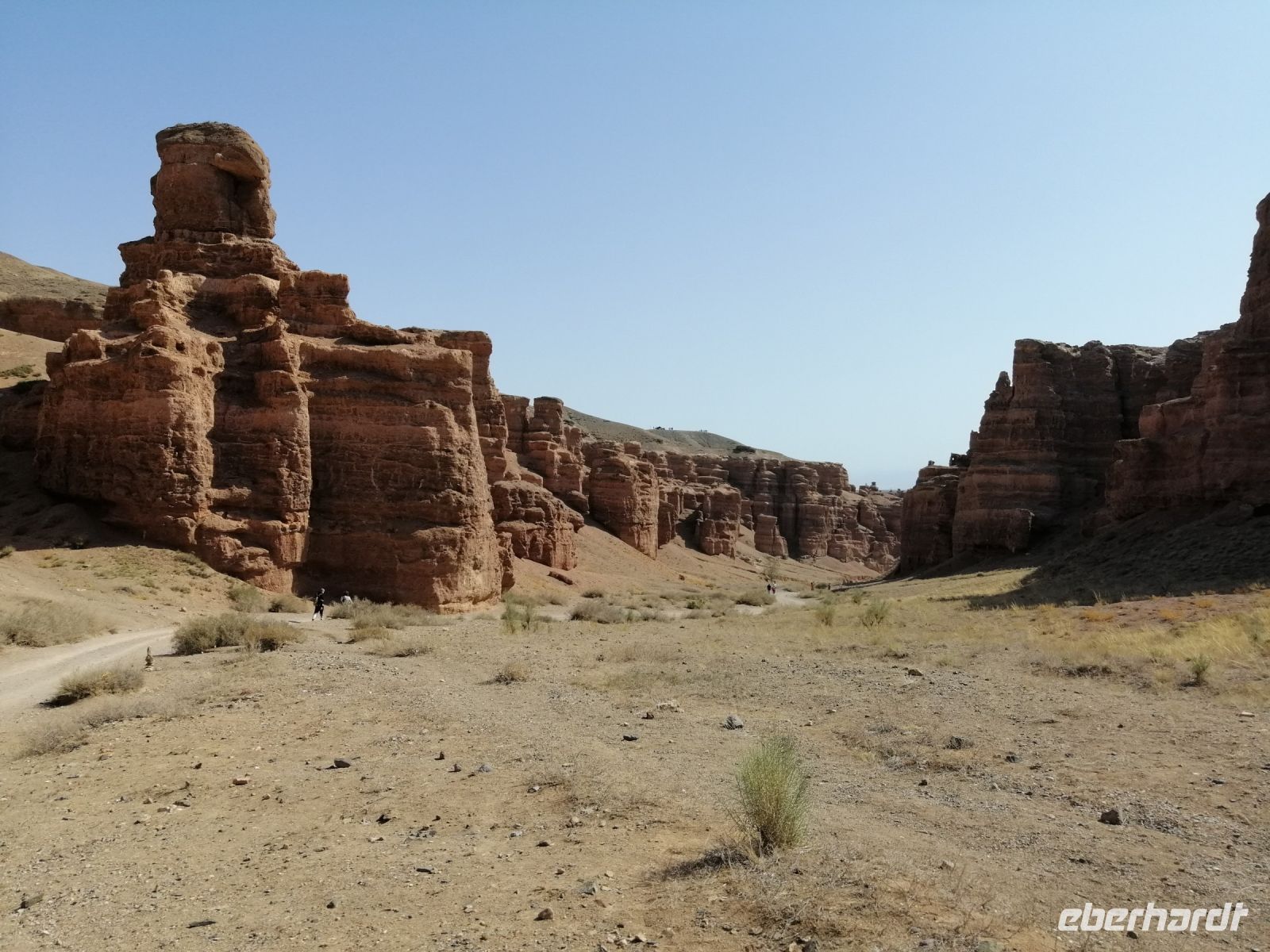 Im Charyn-Canyon angekommen, unternahmen wir eine kurze Wanderung durch den Canyon und bewunderten die Felsformationen. Hier hat die Mutter Natur im Lauf der Zeit aus dem rotbraunen Gestein spektakuläre Skulpturen gebildet. Manche dieser Skulpturen erinnern an Ruinen von alten Schlössern, Türmen und Burgen, Gesichtern von Riesen und Silhouetten von mysteriösen Tieren. In den Tiefen des Tals hatten wir das Gefühl, dass wir uns in einer fantastischen Stadt befinden, wo es hinter jeder Ecke eine neue Entdeckung gibt.