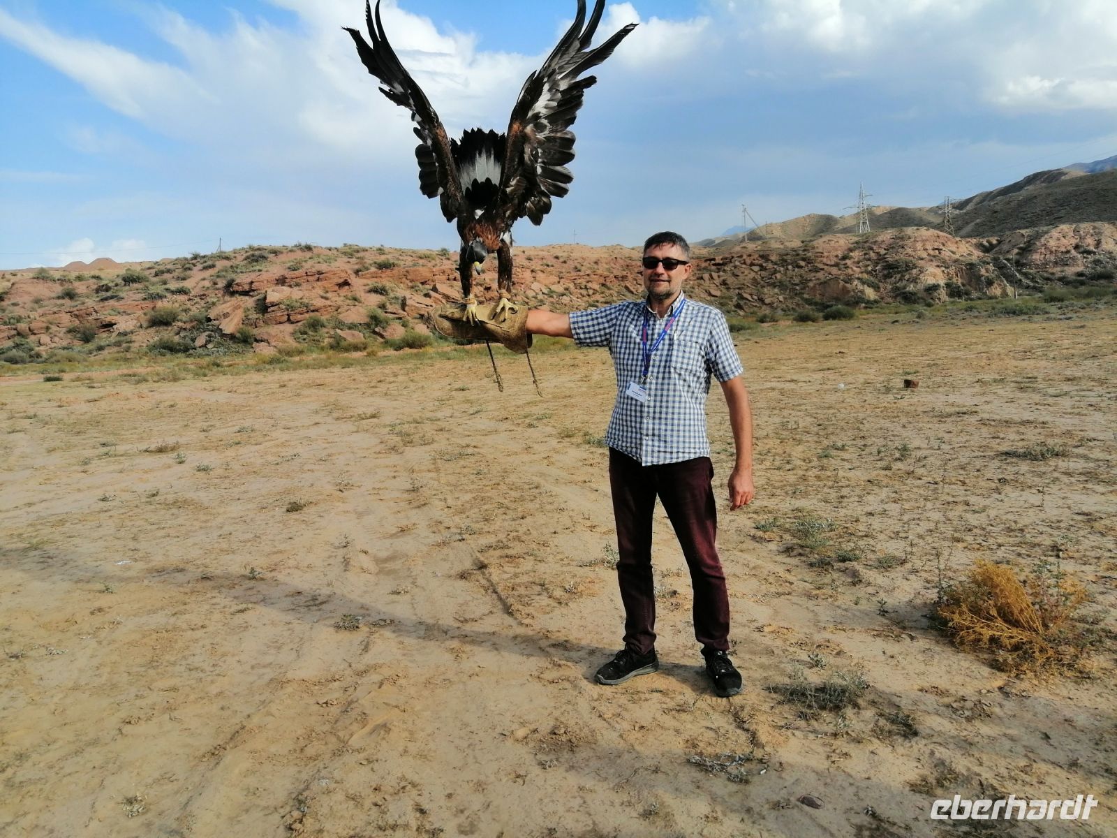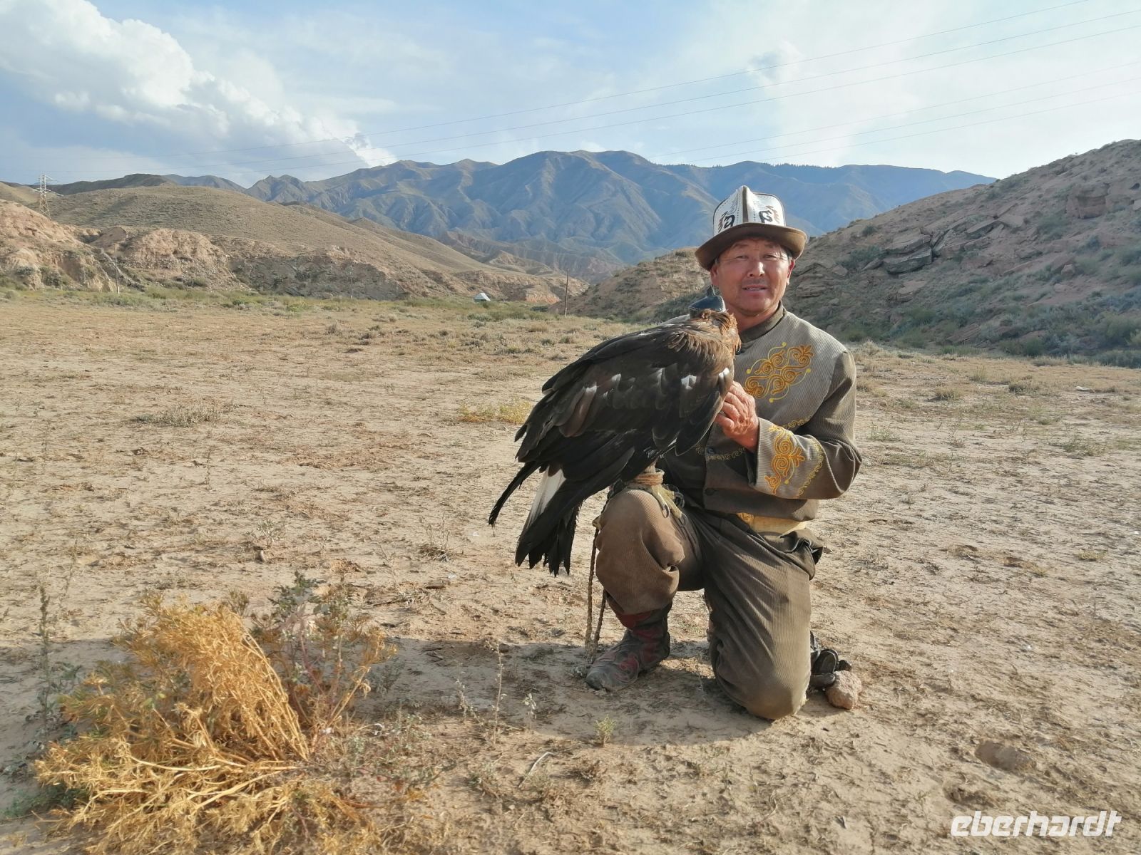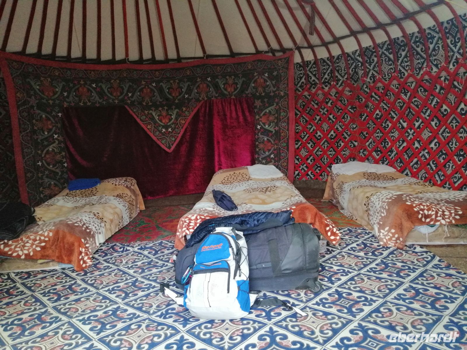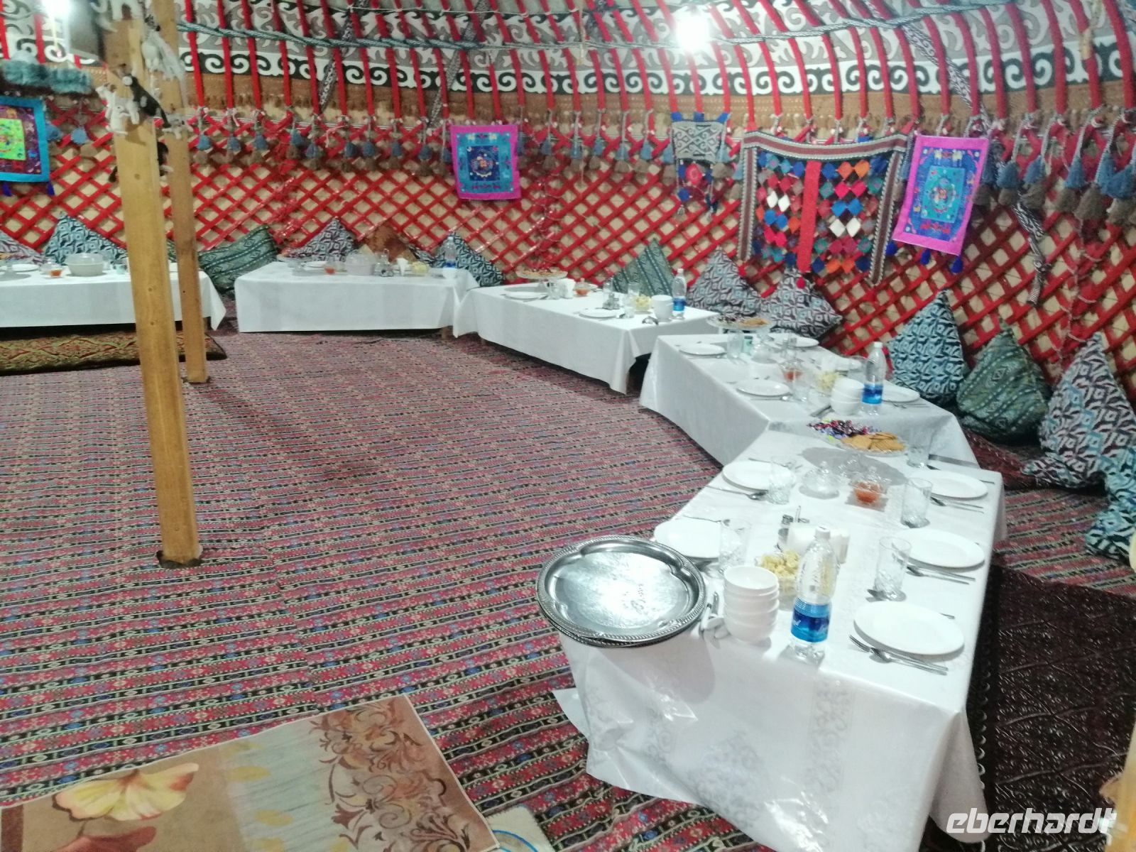 Nach der Wanderung erwartete uns eine tolle Vorführung mit einem echten Steinadler! Ein einheimischer Berkuttsch zeigte uns mit seinem Sohn die uralte Kunst der Vogelabrichtung und der Jagd mit solchen Vögeln. Nach dem anschließenden Picknick direkt am Issyk Kul-See und der Badepause fuhren wir dann weiter und erreichten gegen 18 Uhr das Jurtencamp Almaluu. Das Abendessen heute bat uns gute Gelegenheit für eine kurze Vorstellungsrunde. Wir übernachteten direkt in einer typisch kirgisischen Jurte. Für uns wurden zwar die Holzöfen vorbereitet aber es gab so viele Decken, Kissen und Schlafmatrazen, dass wir nachts nicht gefroren haben.