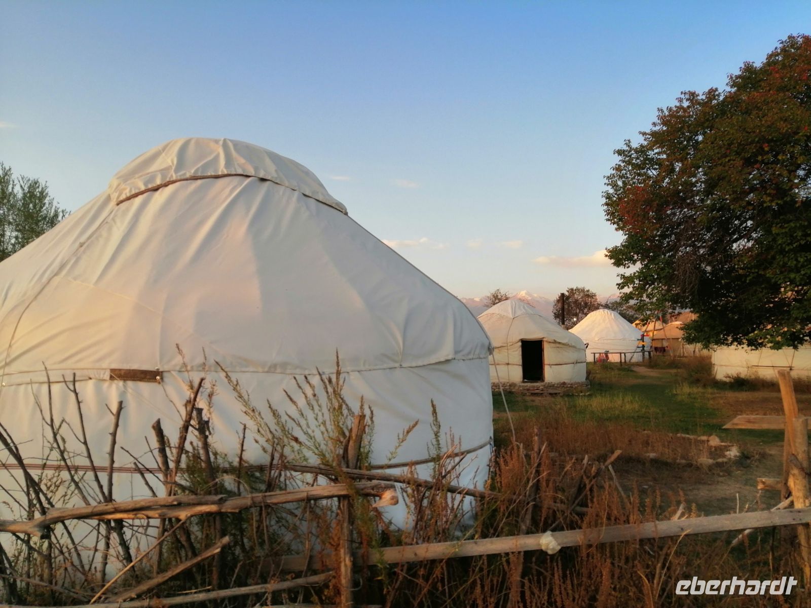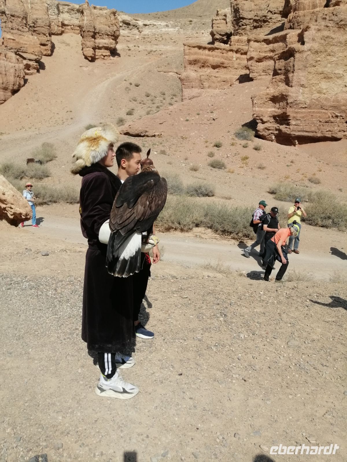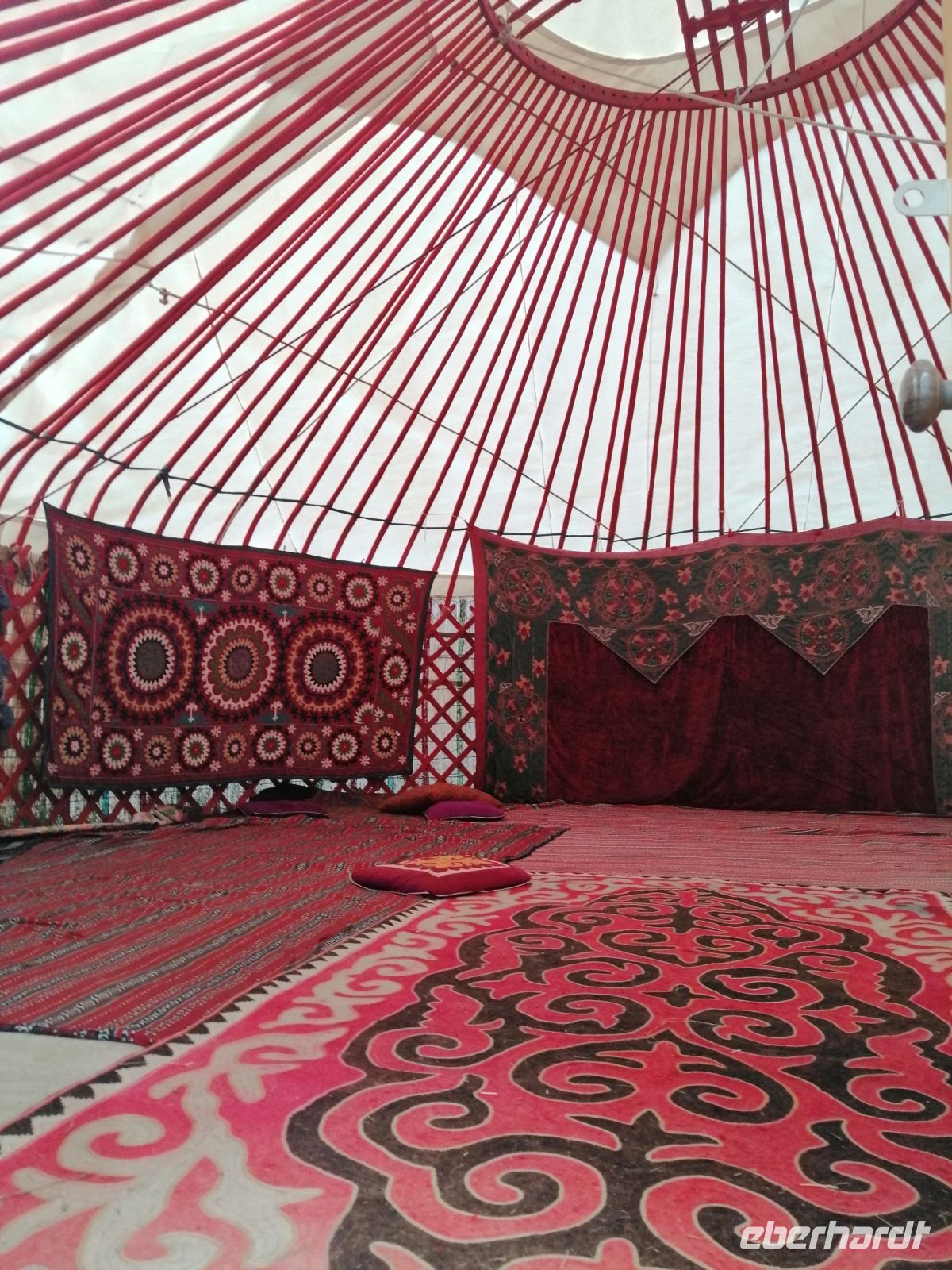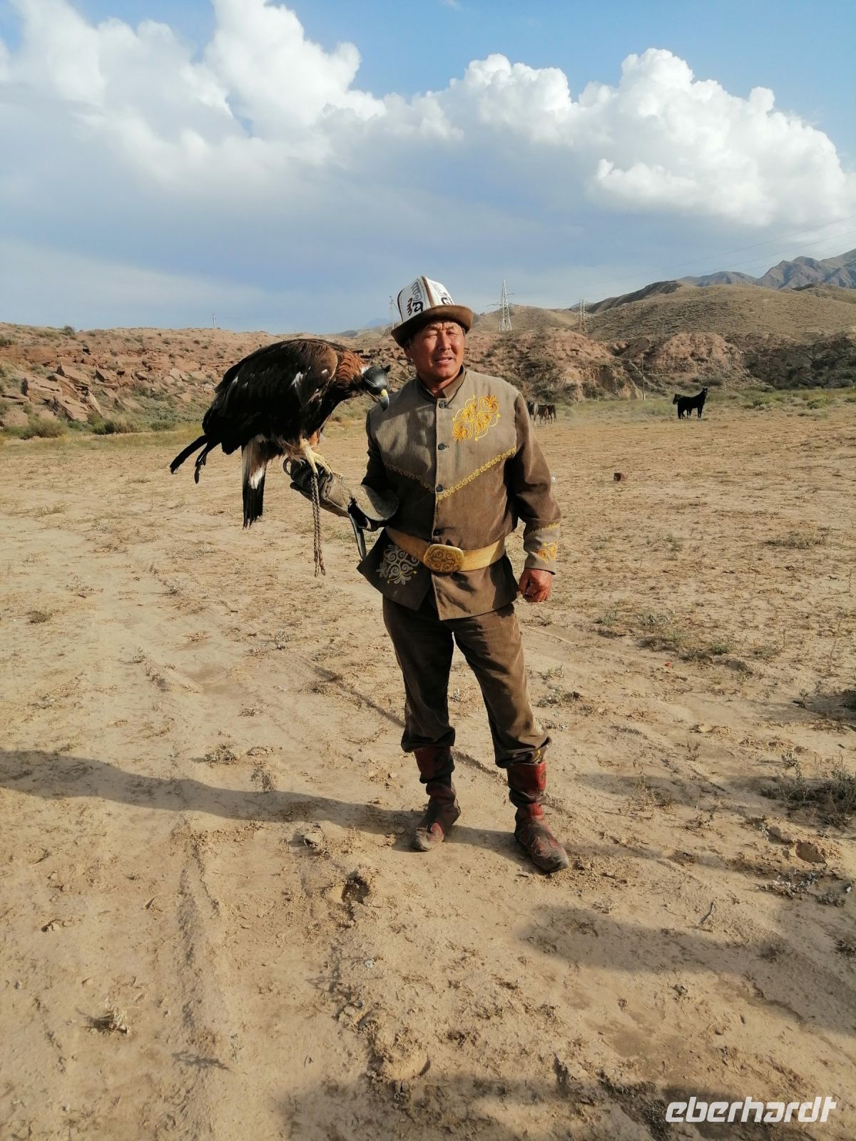 Nach der Wanderung erwartete uns eine tolle Vorführung mit einem echten Steinadler! Ein einheimischer Berkuttsch zeigte uns mit seinem Sohn die uralte Kunst der Vogelabrichtung und der Jagd mit solchen Vögeln. Nach dem anschließenden Picknick direkt am Issyk Kul-See und der Badepause fuhren wir dann weiter und erreichten gegen 18 Uhr das Jurtencamp Almaluu. Das Abendessen heute bat uns gute Gelegenheit für eine kurze Vorstellungsrunde. Wir übernachteten direkt in einer typisch kirgisischen Jurte. Für uns wurden zwar die Holzöfen vorbereitet aber es gab so viele Decken, Kissen und Schlafmatrazen, dass wir nachts nicht gefroren haben.