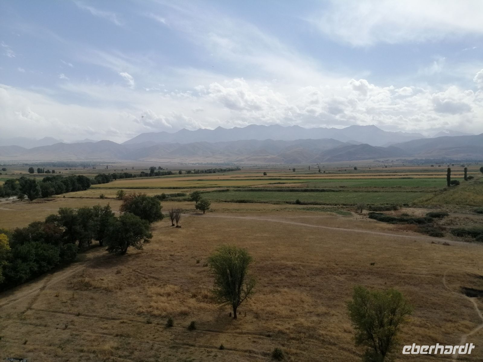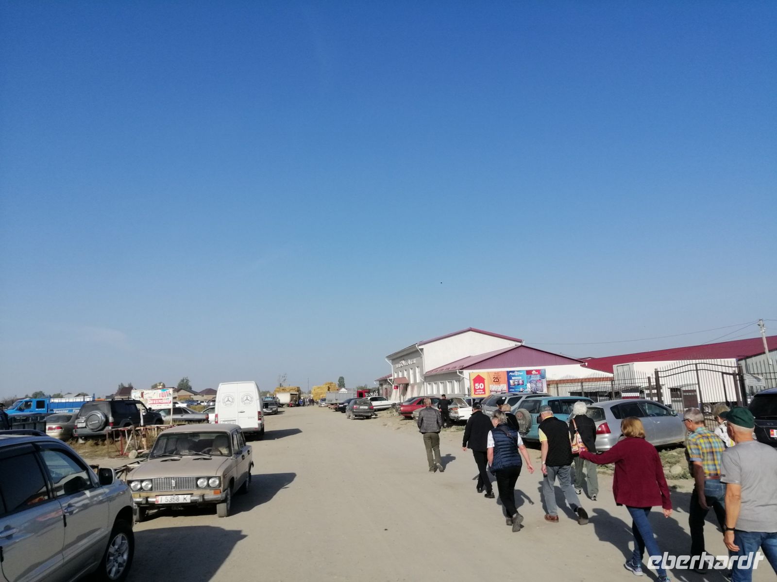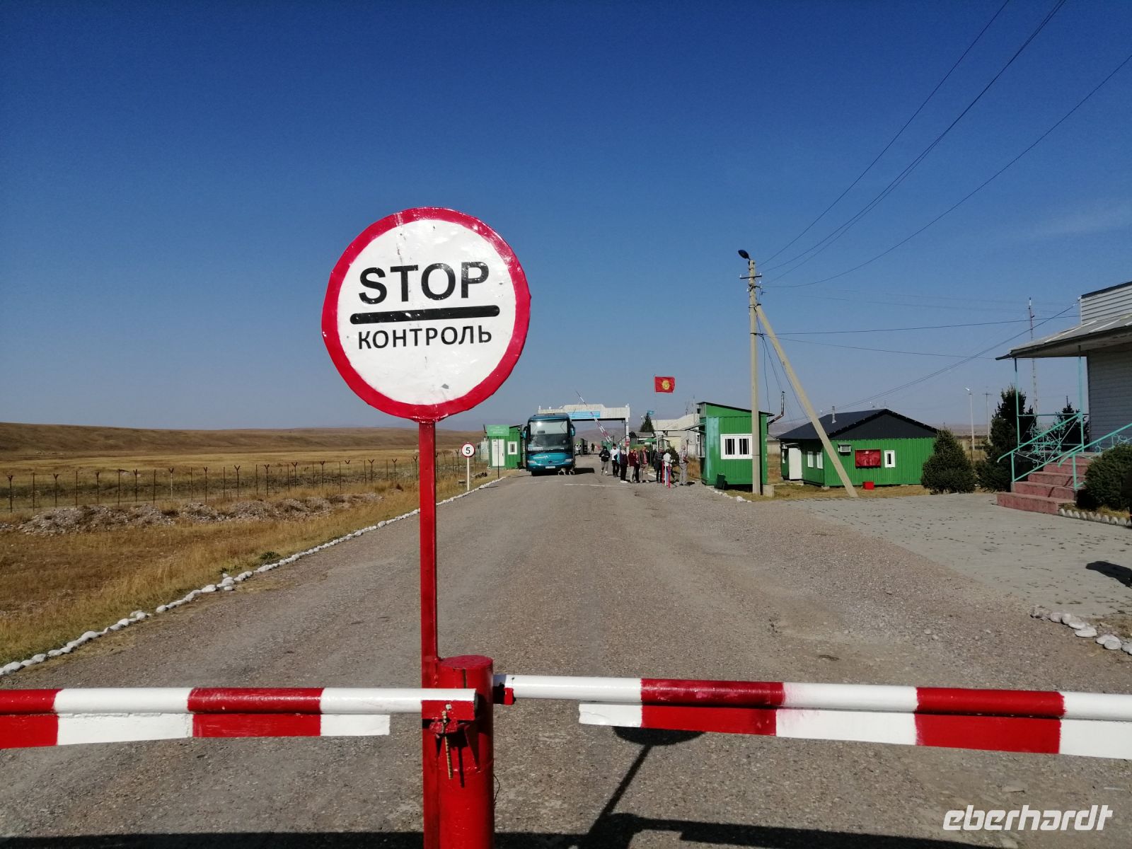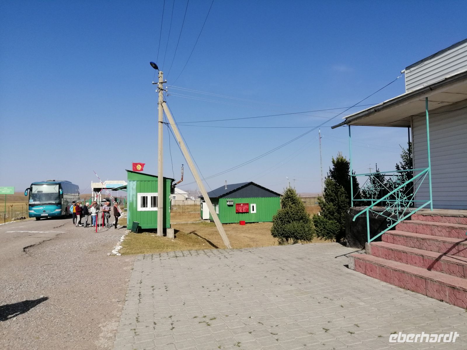 Nach dem leckeren Picknick setzten wir unsere Busfahrt Richtung kirgisische Grenze fort. Die gut befestigte aber nicht asphaltiere Straße verleite unserer Fahrt eine besondere Note an Abenteuer! Gegen 15 Uhr erreichten wir die Grenze. Außer unsere Reisegruppe und eine Bike-Gruppe aus Moskau gab es niemanden mehr und so, überquerten wir ohne große Wartezeit und keinerlei Probleme die kasachisch-kirgisische Grenze. Die freundlichen Grenzsoldaten wünschten uns gute Weiterfahrt! Auf dem Weg nach Karakol, den wir gegen 18 Uhr erreicht haben, beobachteten wir aus dem Bus die große Kartoffelernte in dieser Region.