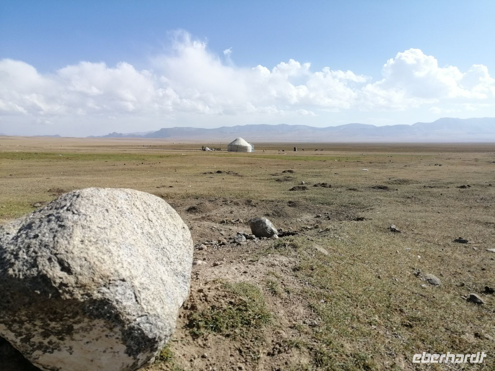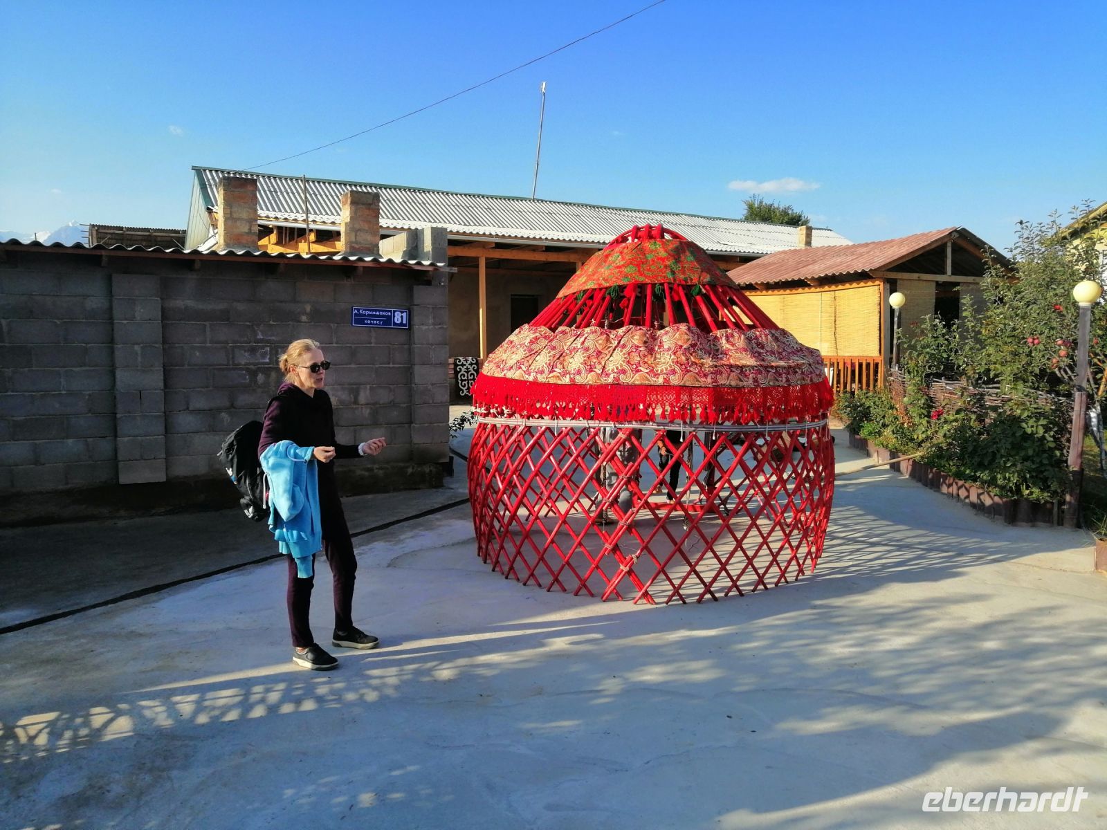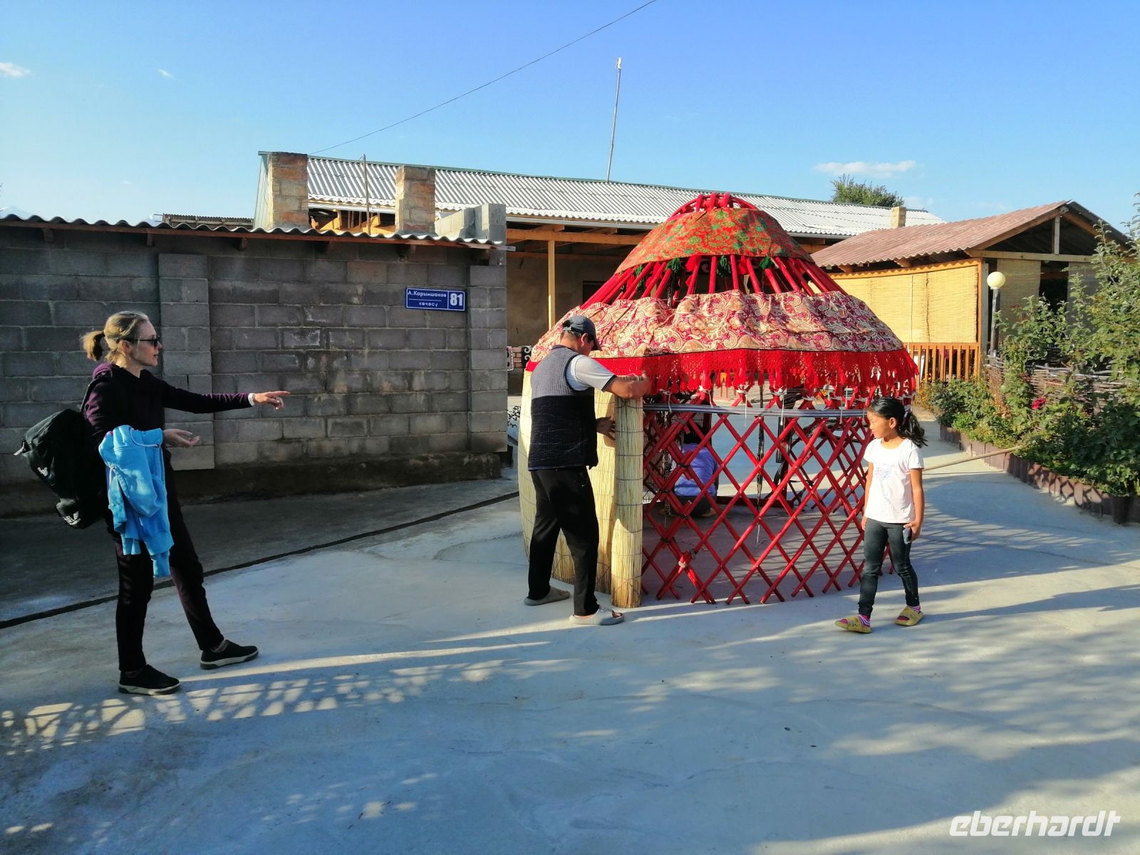 Nach dem Frühstück verließen wir das Jurtencamp Almaluu und schauten uns im benachbarten Dorf wie eine Jurte aufgestellt wird an. Neben der neu aufgebauten Jurte gratulierten wir Thomas, unserem ersten Geburtstagskind auf der Tour, zu seinem Geburtstag :-)