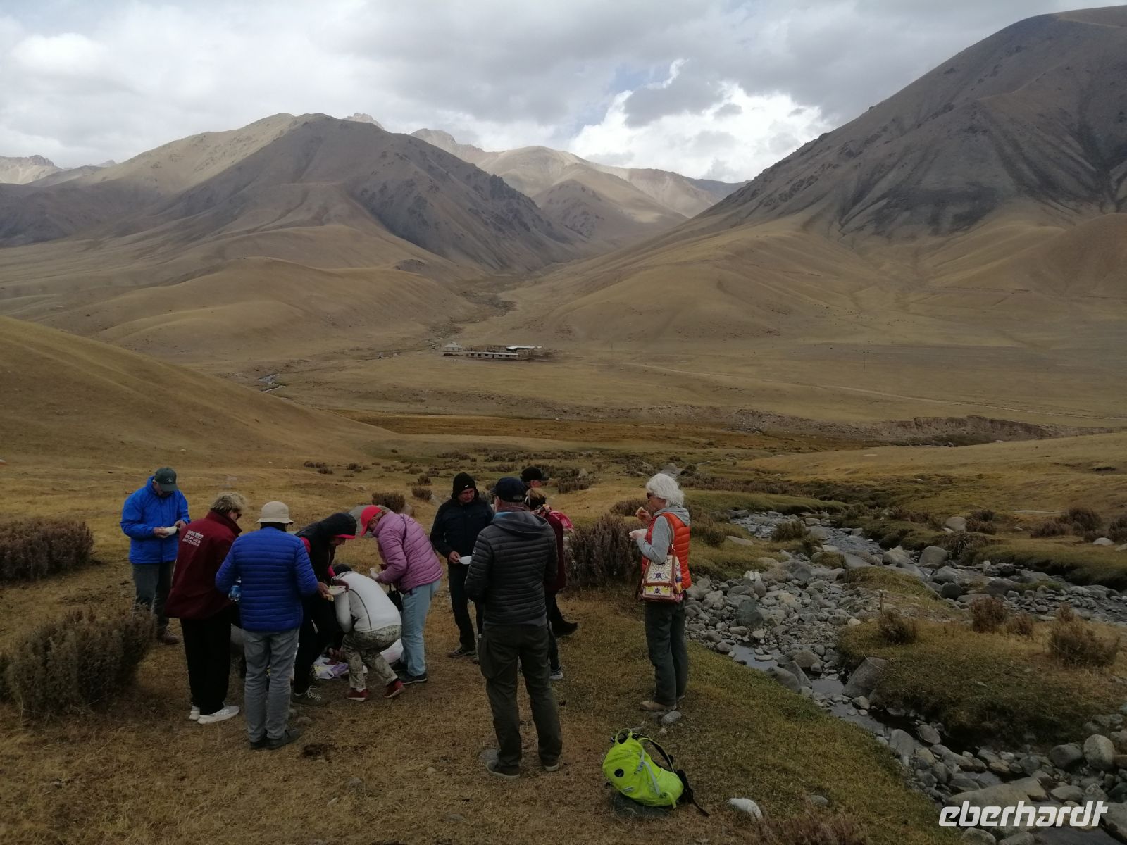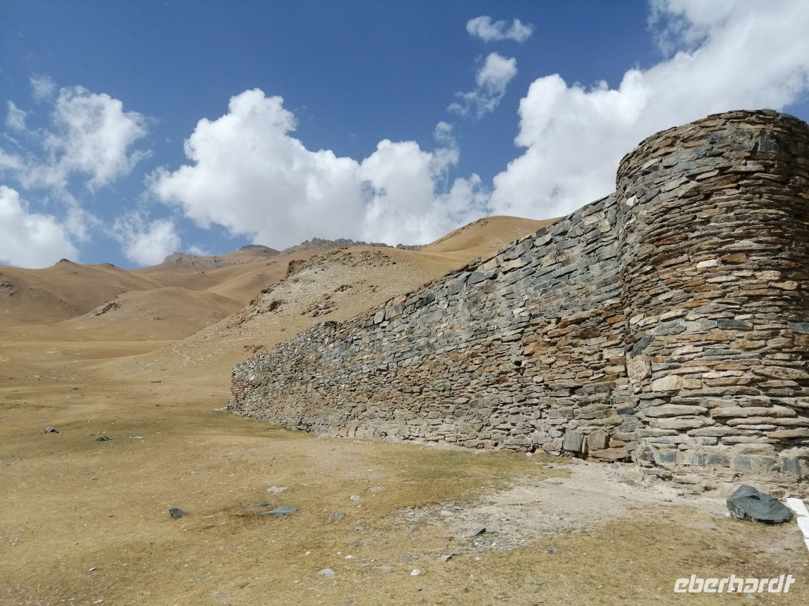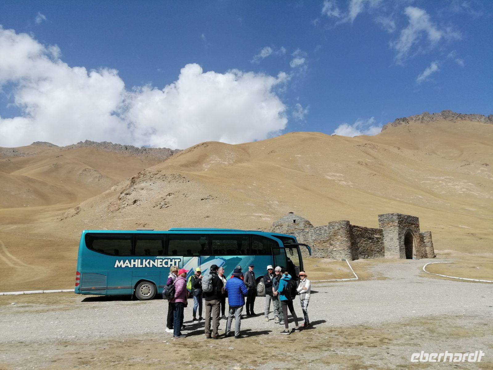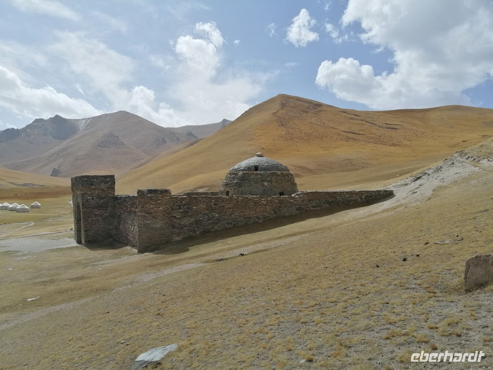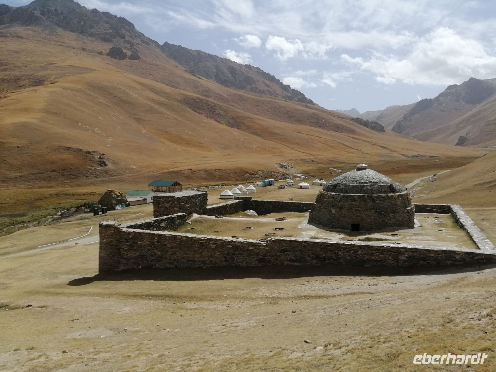 Bevor wir gegen 12 Uhr in Tasch-Rabat ankamen, hielten wir am Fluß At-Baschi und machten dort eine Fotopause. Vor der Führung durch die alte Festung Tasch-Rabat, gratulierten wir unserem zweiten Geburtstagskind, der Brigitte und wünschten ihr Alles erdenklich Gute zu ihrem besonderen Geburtstag, mitten im Tien-Schan-Gebirge! Währen der Führung durch die alte Burganlage erfuhren wir von der Elena die Geschichte dieser Festung. Tasch-Rabat ist ein einzigartiges Baudenkmal des frühen Mittelalters. In jener fernen Zeit, als die Straßen der Großen Seidenstraße noch geschäftige Handelskarawanen waren, diente die Festung auf einer von ihnen als Karawanserei, das heißt, im modernen Sinne war sie ein mittelalterliches Gasthof, eine ständige Herberge für Kaufleute und Reisende, eine Festung. Die Burganlage liegt direkt am Ufer des gewundenen Flußes „Tasch-Rabat“, an der Handelsroute, die damals die Täler Chui und Fergana mit Kaschgar verband.