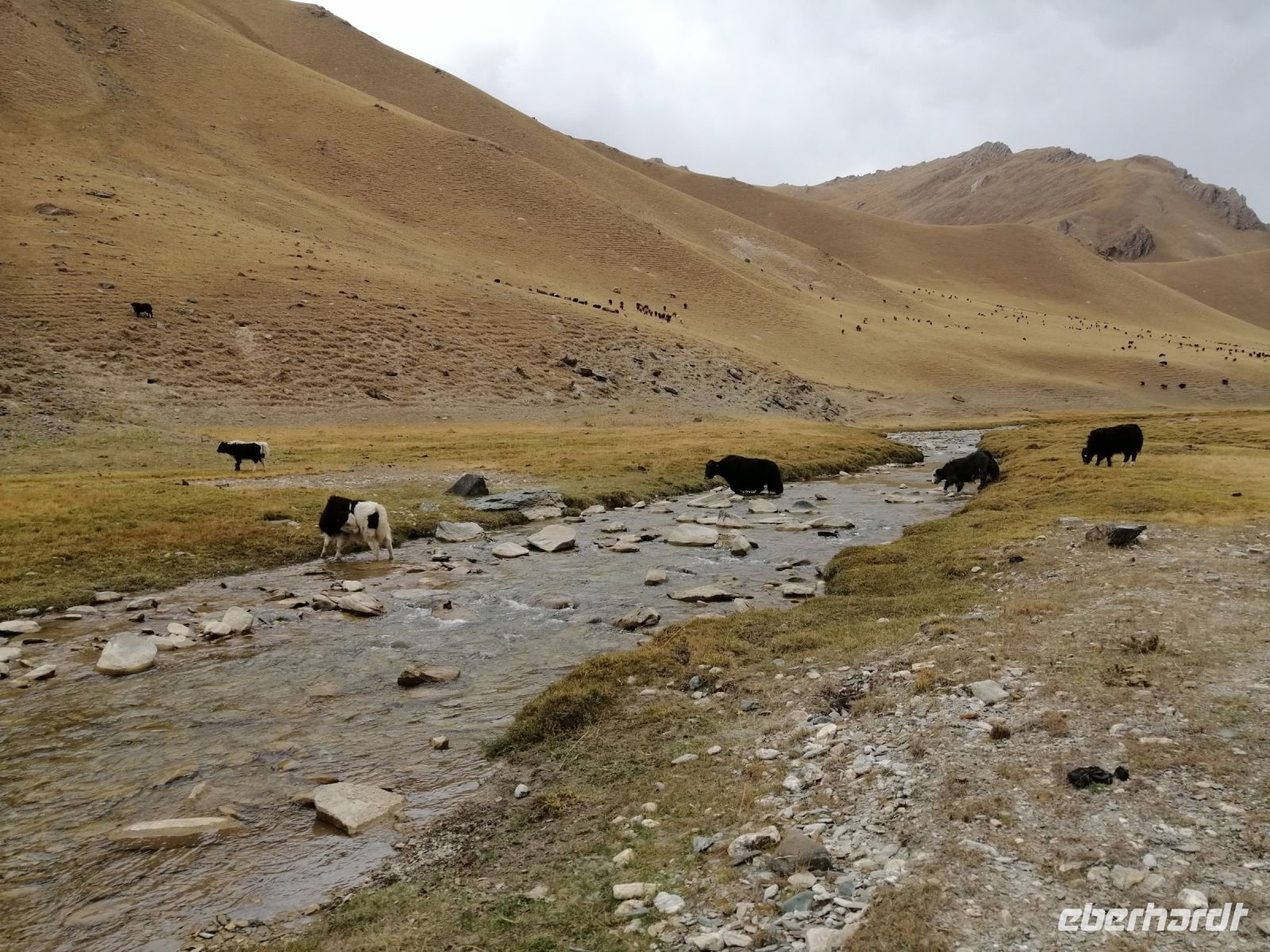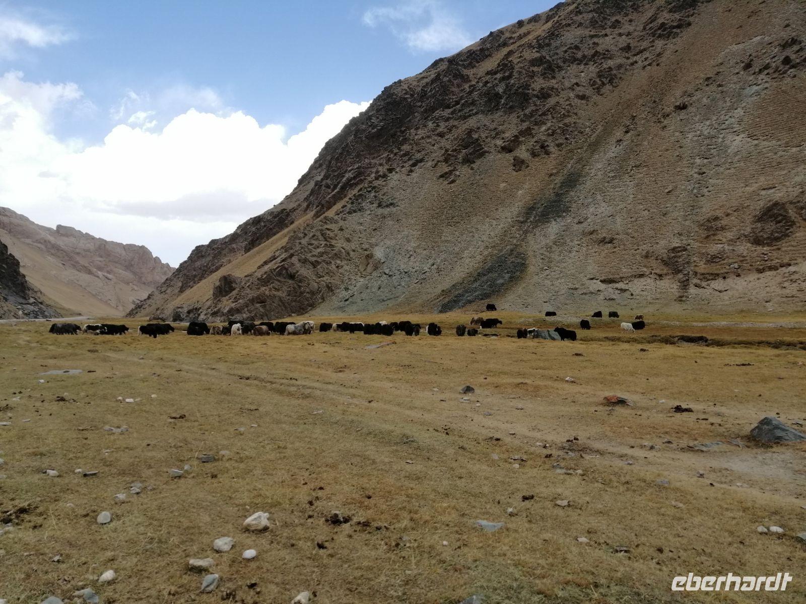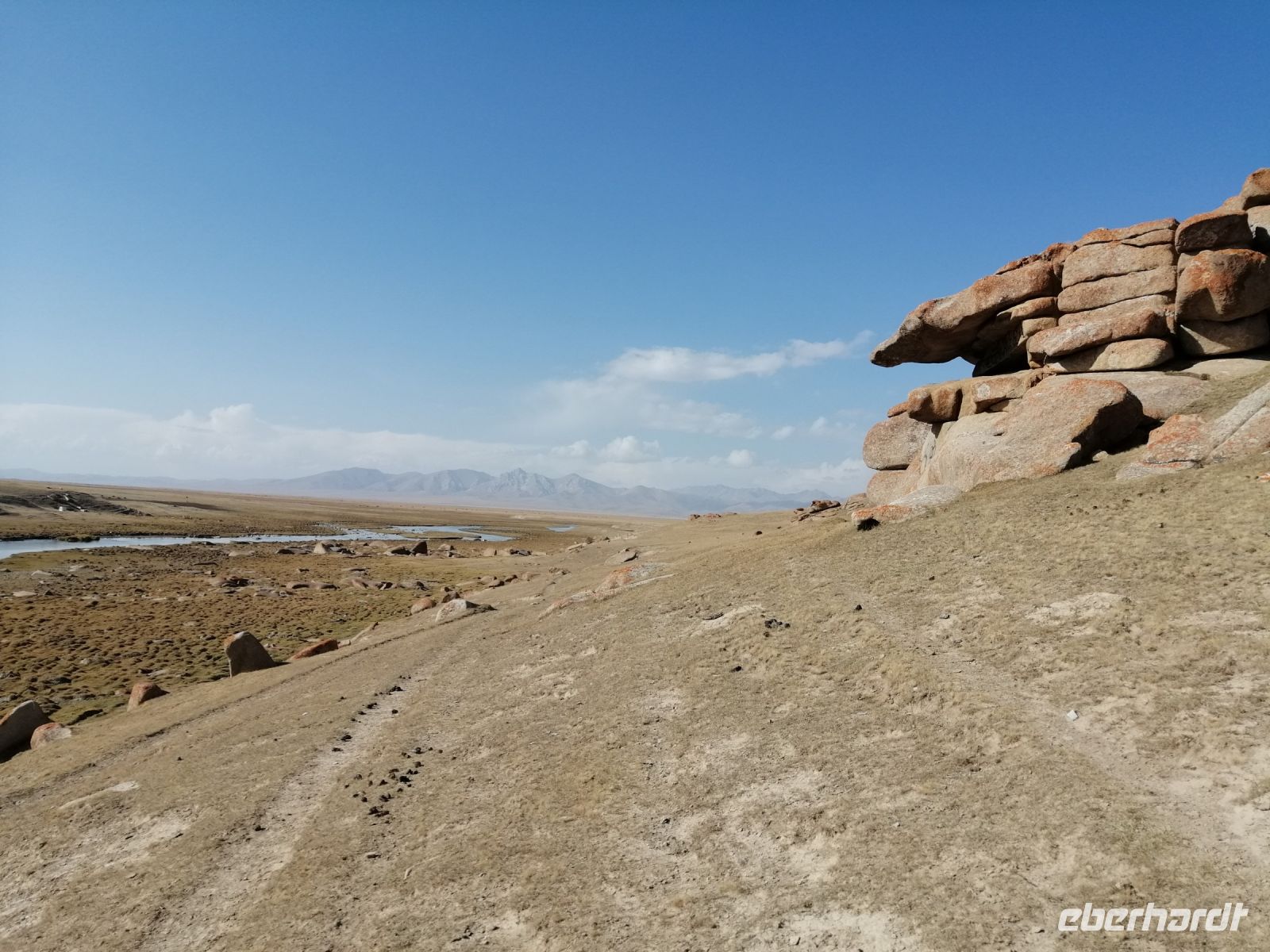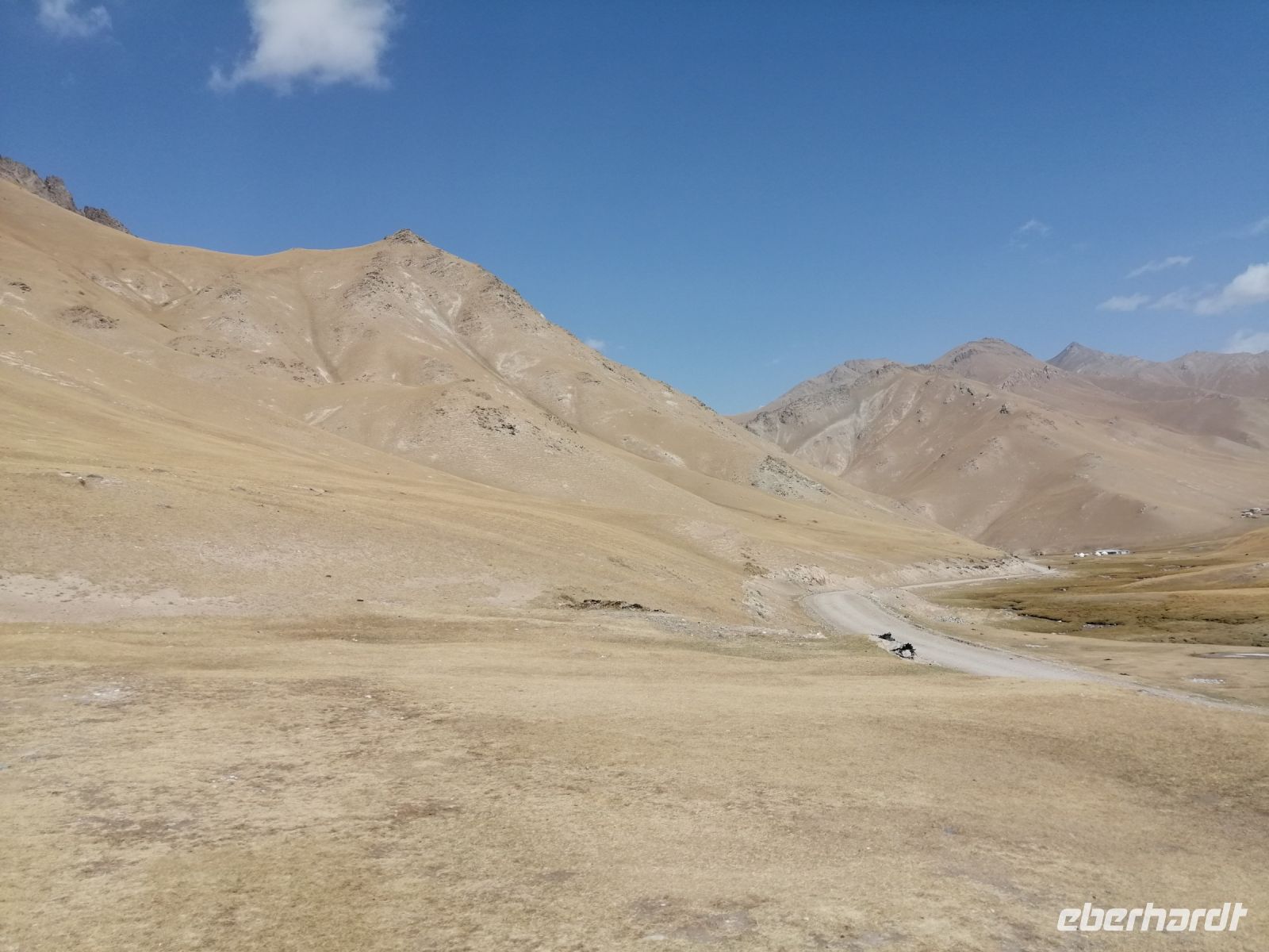 Nach der abenteuerlichen Fahrt durch die Berglandschaften und einer Reifenpanne, erreichten wir kurz vor 15 Uhr den Kalmak-Aschuu-Pass in 3.446 Meter Höhe. Groß war die Überraschung, als wir hier eine Fahrradgruppe aus Kanada getroffen haben. Nach dem kurzen Gespräch mit Kanadier ging es dann Richtung Sonkul-See weiter. Der Bergsee befindet sich auf 3016 m Höhe, zwischen dem Sonkoltau und dem Moldotau. Der Sonkul See ist 29 km lang und 18 km breit und erreicht eine Tiefe von 22 m. Er ist einer der größten Hochgebirgsseen und der größte natürliche Süßwasserspeicher Kirgisistans. Leider konnten wir aufgrund des sumpfigen Geländes nicht direkt zum Wasser gelangen.