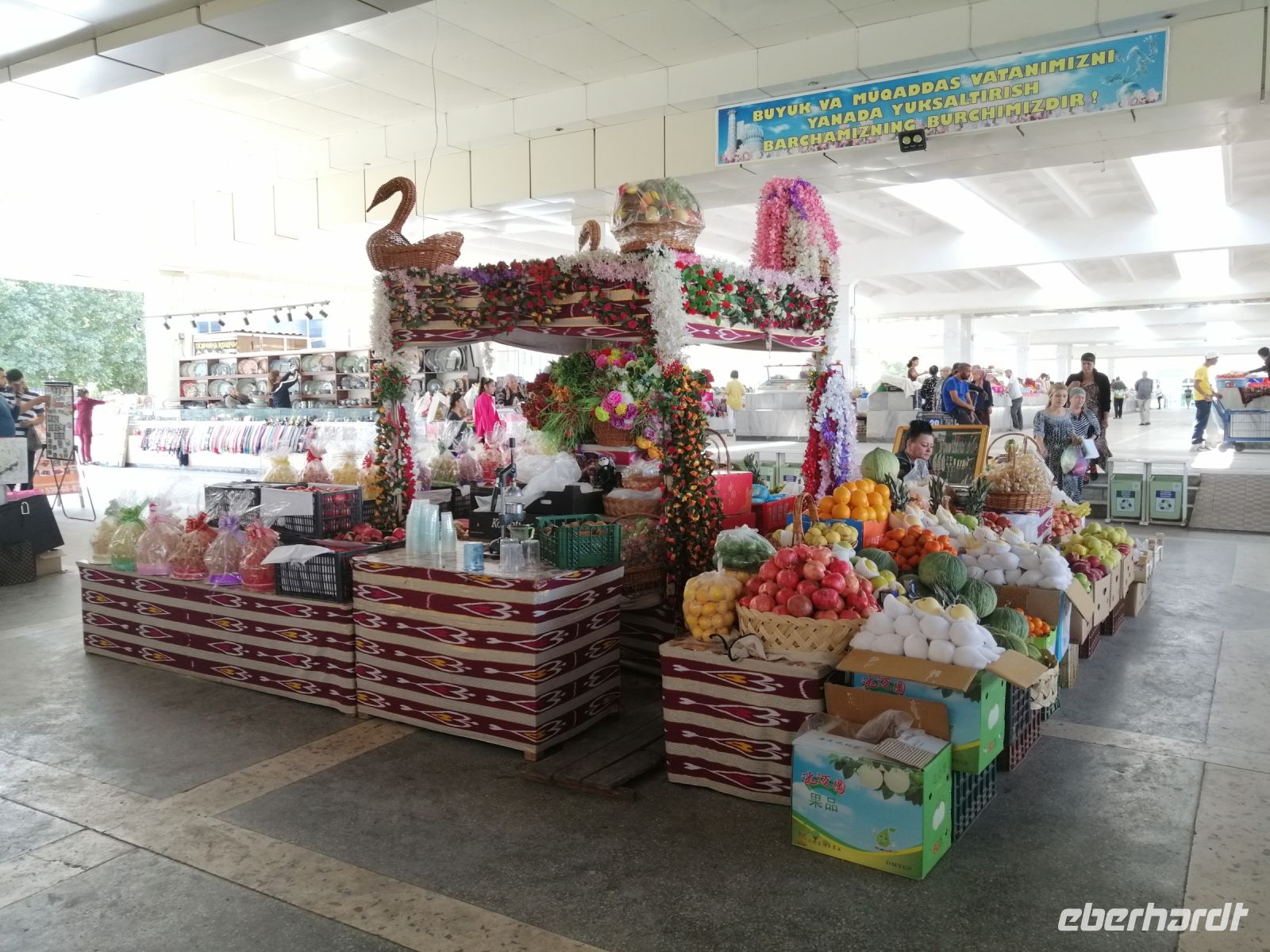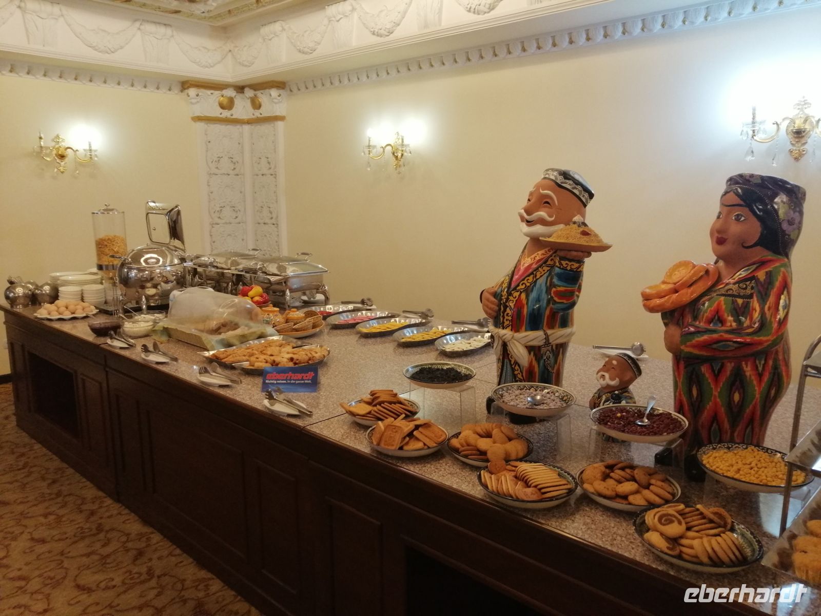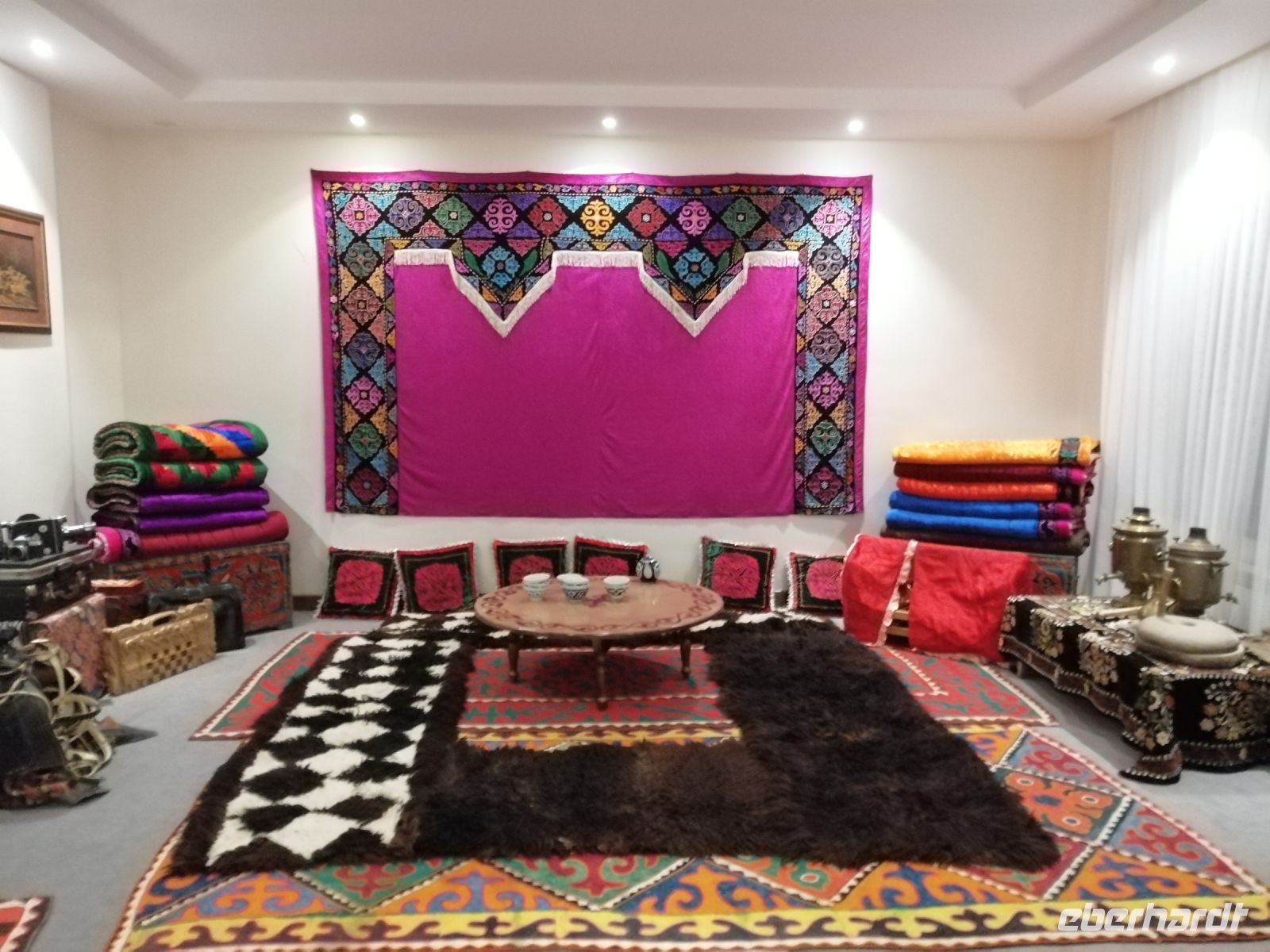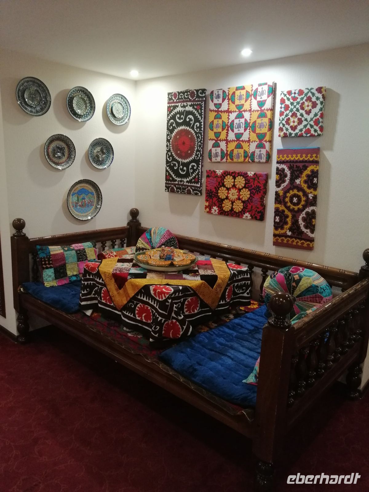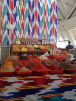 Ein weiterer Höhepunkt des Tages war der Chorsu-Basar: der Zentrale Markt der Stadt, mit unzähligen Ständen aus allen möglichen Lebensbereichen: Lebensmittel, Haushalt, Möbel, Kleidung usw. In einem gemütlichen Café aßen wir Pelmeni, Bortsch und Kuchen zu Mittag. Anschließend wollten sich einige Reisegäste im Hotel ausruhen und wir setzten unsere Erkundungstour fort und besuchten das interessante Museum für Angewandte Kunst. Dort erfuhren wir unter anderem was „Suzane“ bedeutet: großformatige, mit Seiden- oder Wollstickereien verzierte Baumwollstoffe.