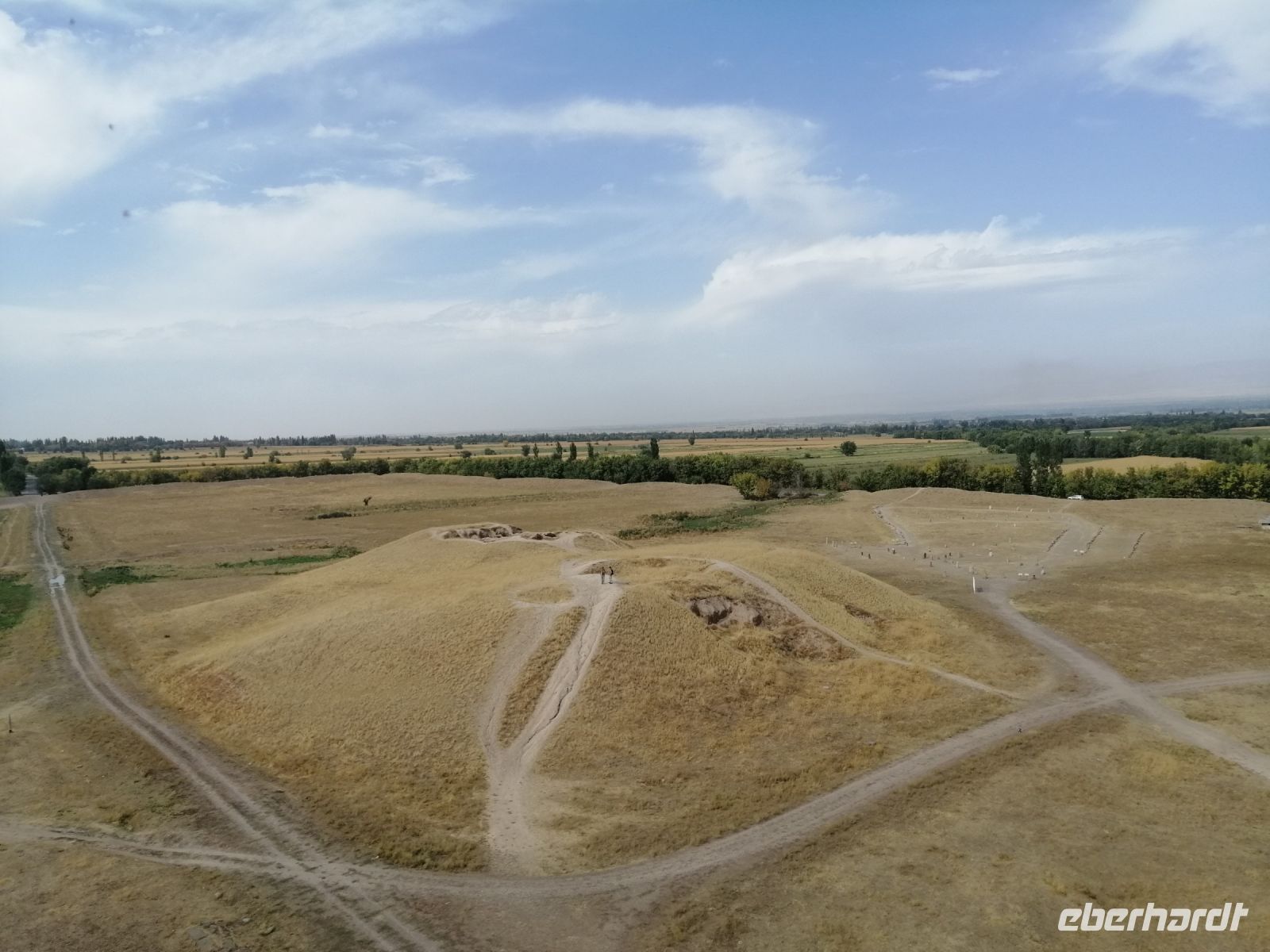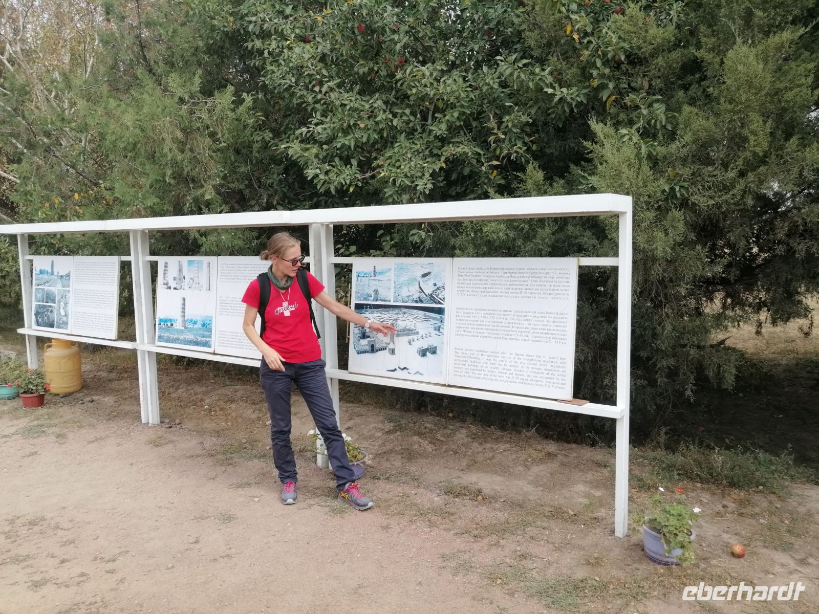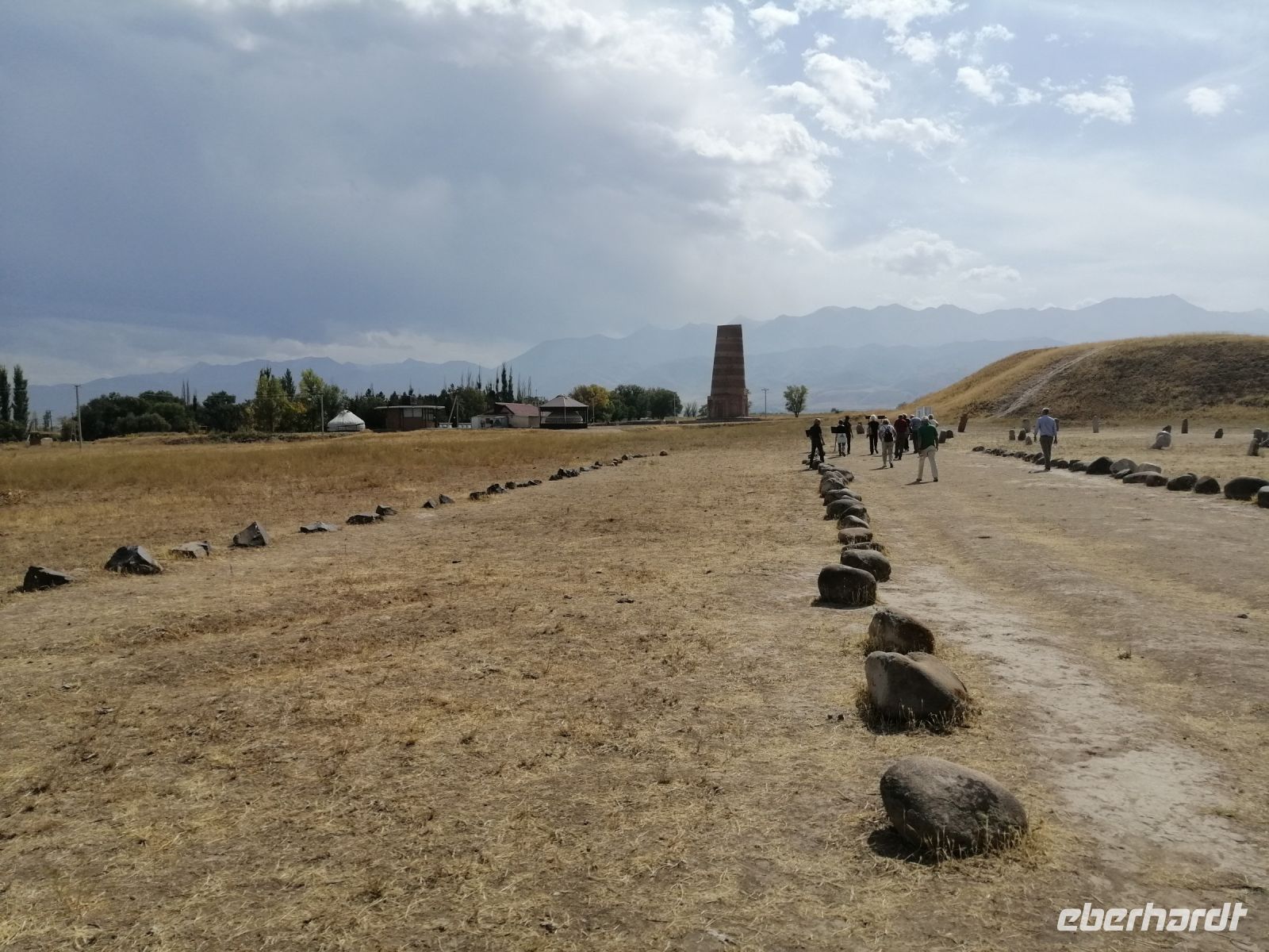 Gegen 13 Uhr erreichten wir unser Zwischen-Ziel des heutigen Tages: das Freilichtmuseum mit dem Burana-Turm in der ehemaligen antiken Stadt Balasagun. Wir tauchten in die Geschichte des Königreiches der Kara-Kitai aus der Zeit von X – XIV Jh. ein. Balasagun wurde wahrscheinlich Ende des 9. Jh. von den iranisch-stämmigen Sogdiern gegründet und später durch die turk-stämmigen Karachaniden erobert. Nachdem die Mongolen Dschingis Khans die Stadt um 1217 eingenommen haben, begann auch ihr Niedergang. Balasagun galt einst als eine der wichtigsten Handelsstätten an der Seidenstraße in Zentralasien. Heute ist nur noch der Burana-Turm (UNESCO), der einst als Minarett für eine Moschee diente, übrig geblieben sowie ein Ausgrabungsfeld mit Mauerresten und Ruinen einiger Mausoleen.