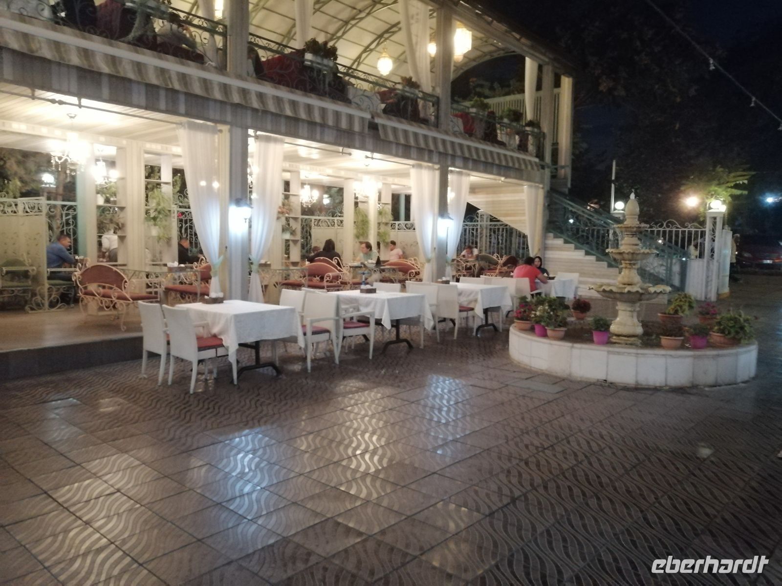 Während der Weiterfahrt beleuchtete Elena die Covid-Situation in Kasachstan und informierte uns über die statistischen Daten der John Hopkins Universität zu diesem Thema. Gegen 19 Uhr kamen wir in Turkestan an. Nach dem Check-In im sehr schönen Hotel Khanaka, trafen wir uns eine Stunde später zum gemeinsamen Abendessen direkt im Hotel. Da heute der letzte Tag ist, an dem uns Elena begleitet, bedankten wir uns bei ihr für ihre tolle Betreuung und stoßen mit einem Cognac auf sie an! Anschließend unternahmen wir einen gemütlichen Spaziergang durch die Stadt und bewunderten die neu gebauten Springbrunnen, die mit wunderschöne Musik und Beleuchtung versehen wurden.