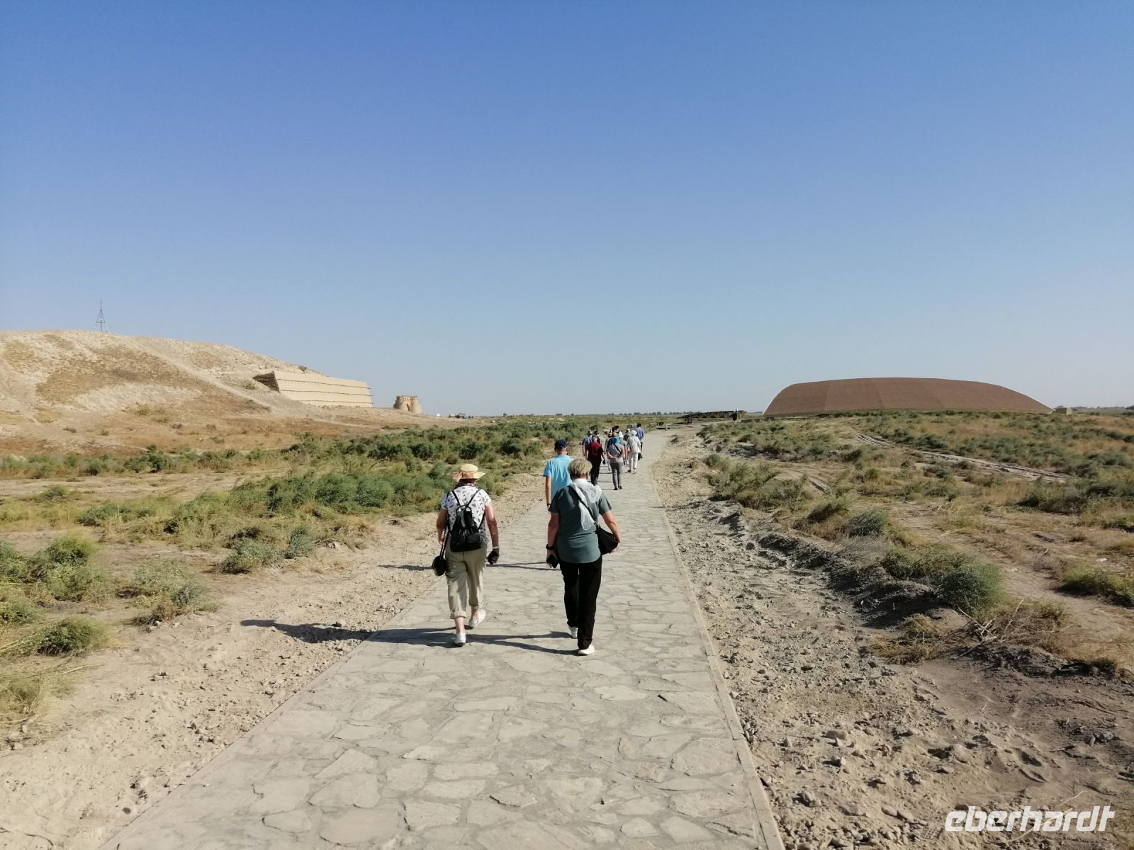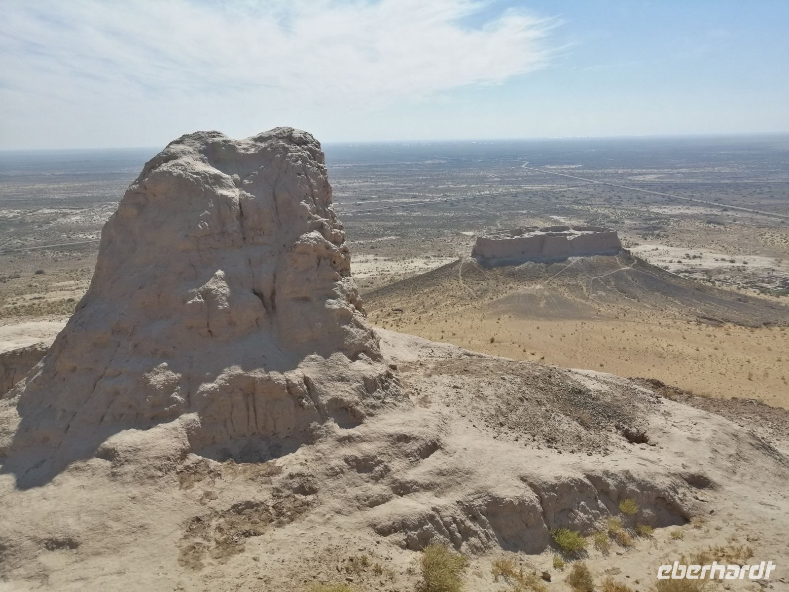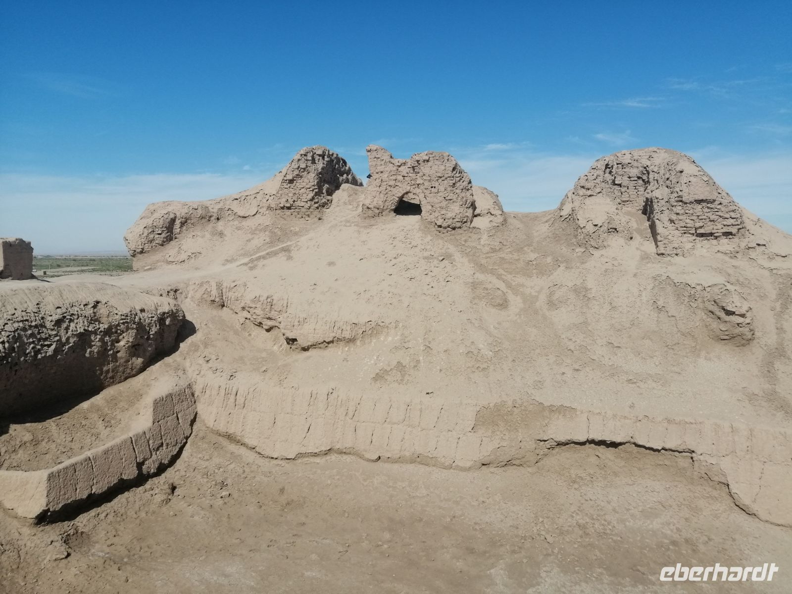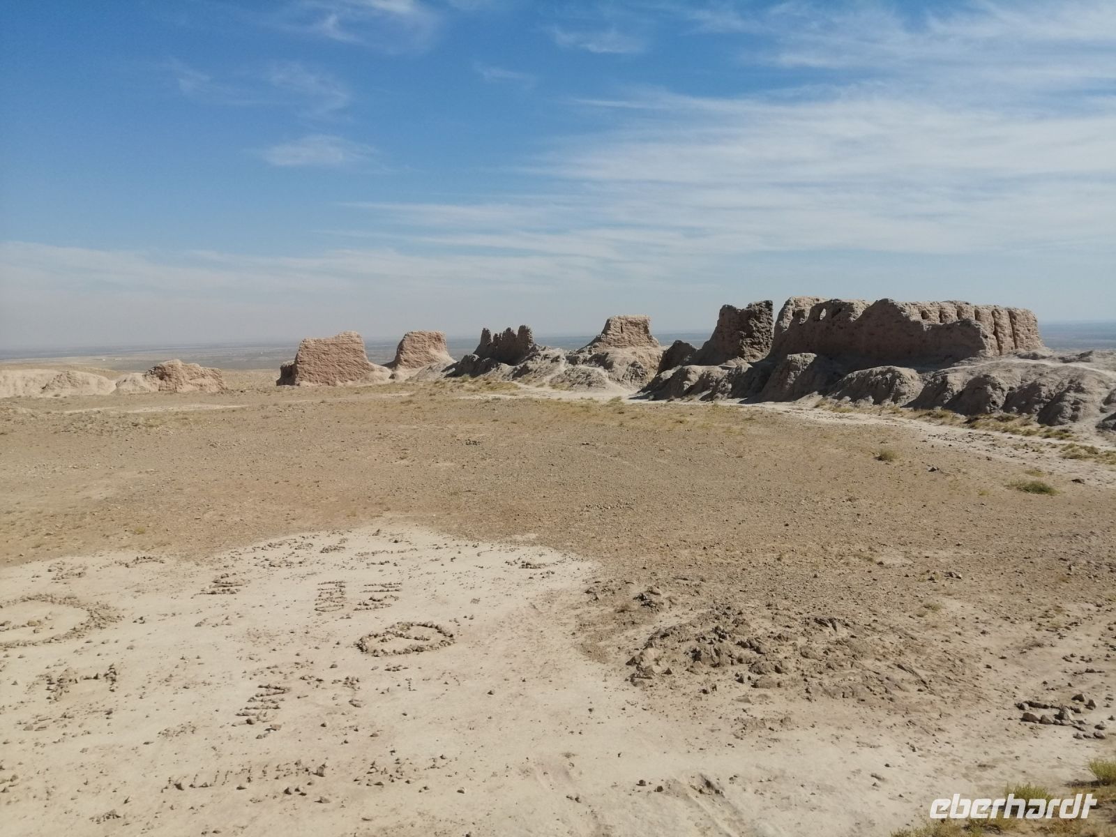 Heute steht auf unserem Programm die Erkundung der historischen Denkmäler des alten Choresmien und so starteten wir gegen 9:30 Uhr mit unserem Reisebus Richtung Kysylkum-Wüste. Zuerst machten wir einen kurzen Stopp an einer Modellaustellung der „50 Festungen“ (Miniaturausstellung) und bekamen von Gulnora eine Einführung in die Geschichte der antiken Siedlungen. Während der Weiterfahrt informierte uns Gulnora über Karakalpakstan, den westlichen Teil Usbekistans. Gegen 11:40 Uhr erreichten wir Toprak Kala und untersuchten das Gelände der antiken Festung. Der Name bedeutet übersetzt „staubige Festung“. Fast alle Gebäude in Toprak-Kala wurden aus luftgetrockneten Ziegeln gebaut. Gulnora erzählte uns, dass möglicherweise die Choresmier über ein einzigartiges Wissen im Bauwesen verfügten, wodurch sie in der Lage waren, äußerst haltbare Gebäude aus einfachem Lehm zu bauen, die man heute nach vielen Jahrhunderten noch sehen kann. Zur Verstärkung der Mauern verwendeten die Bauarbeiter damals kleine Steine, die in der Wüste gefunden wurden. Die Trockenheit im Inneren wurde durch den Flußsand erzeugt, da er die Feuchtigkeit gut aufnahm.