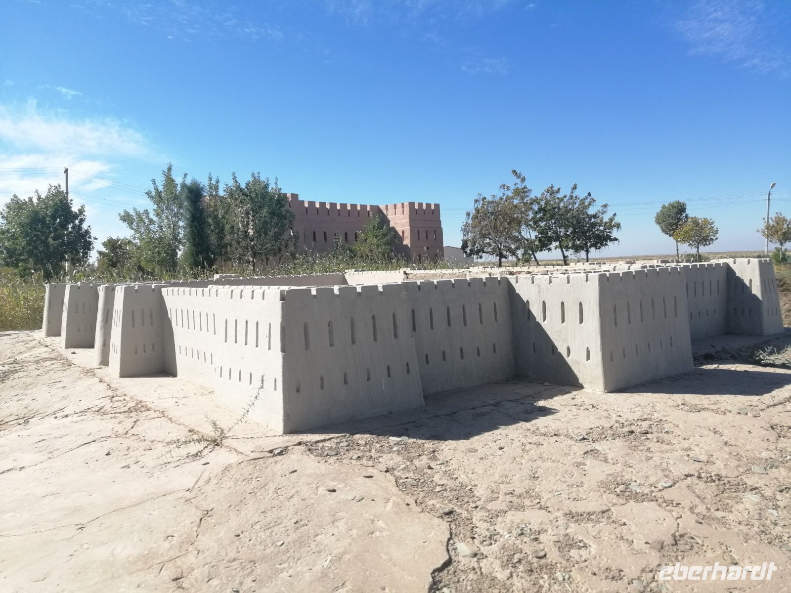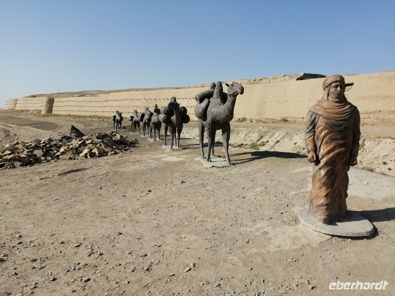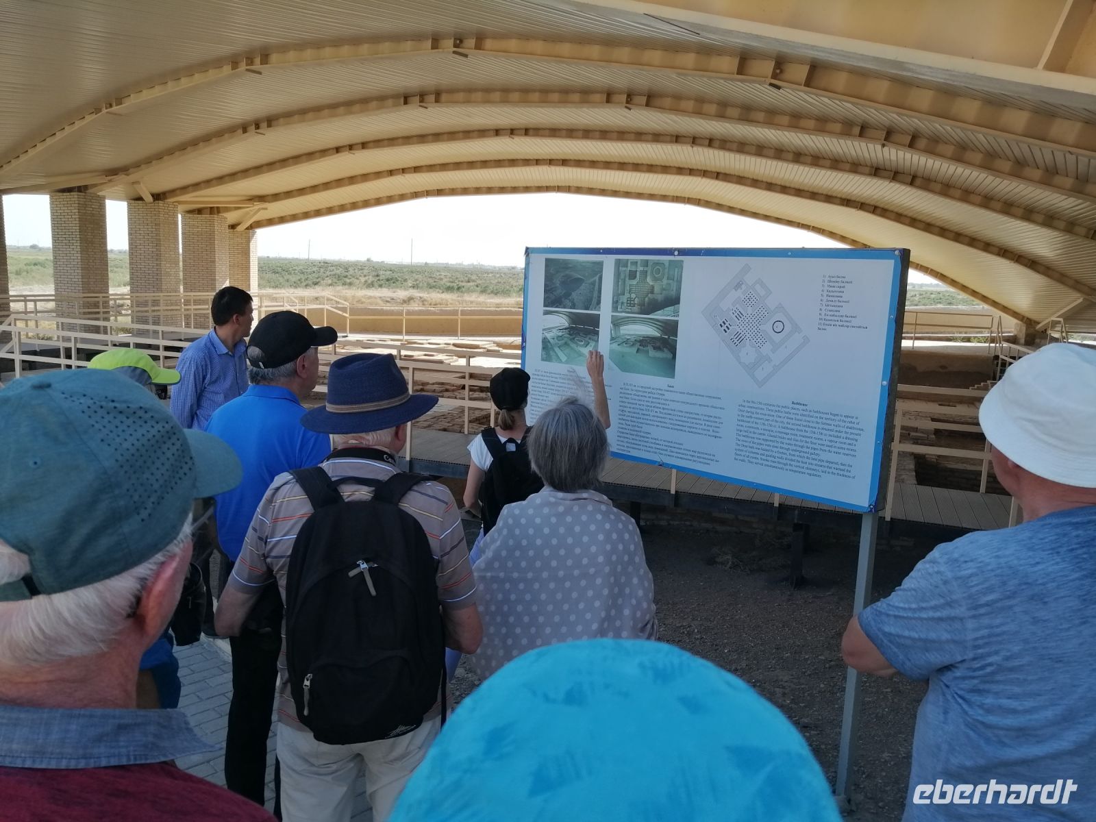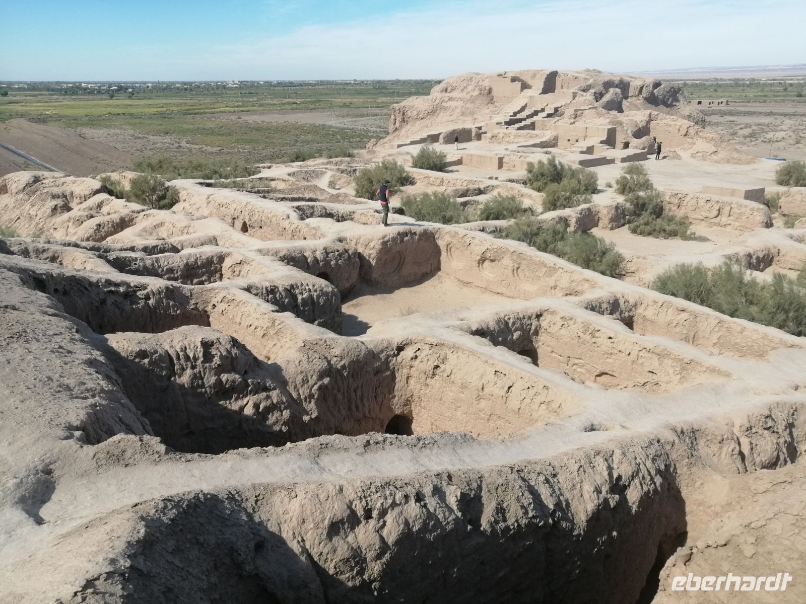 Heute steht auf unserem Programm die Erkundung der historischen Denkmäler des alten Choresmien und so starteten wir gegen 9:30 Uhr mit unserem Reisebus Richtung Kysylkum-Wüste. Zuerst machten wir einen kurzen Stopp an einer Modellaustellung der „50 Festungen“ (Miniaturausstellung) und bekamen von Gulnora eine Einführung in die Geschichte der antiken Siedlungen. Während der Weiterfahrt informierte uns Gulnora über Karakalpakstan, den westlichen Teil Usbekistans. Gegen 11:40 Uhr erreichten wir Toprak Kala und untersuchten das Gelände der antiken Festung. Der Name bedeutet übersetzt „staubige Festung“. Fast alle Gebäude in Toprak-Kala wurden aus luftgetrockneten Ziegeln gebaut. Gulnora erzählte uns, dass möglicherweise die Choresmier über ein einzigartiges Wissen im Bauwesen verfügten, wodurch sie in der Lage waren, äußerst haltbare Gebäude aus einfachem Lehm zu bauen, die man heute nach vielen Jahrhunderten noch sehen kann. Zur Verstärkung der Mauern verwendeten die Bauarbeiter damals kleine Steine, die in der Wüste gefunden wurden. Die Trockenheit im Inneren wurde durch den Flußsand erzeugt, da er die Feuchtigkeit gut aufnahm.