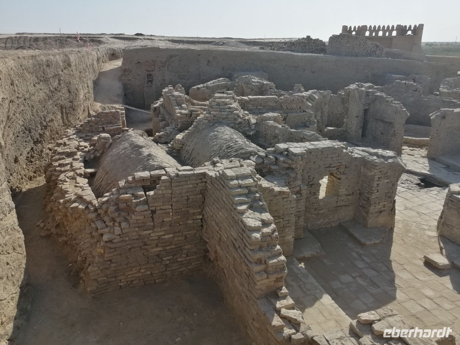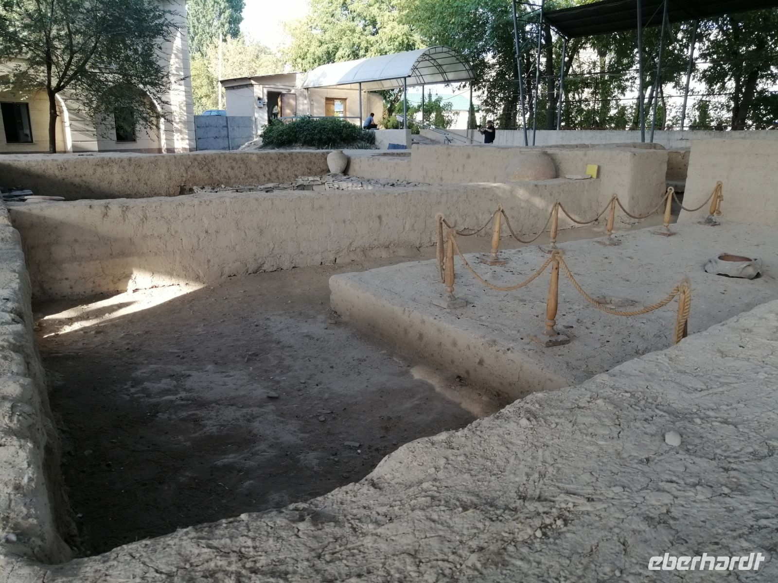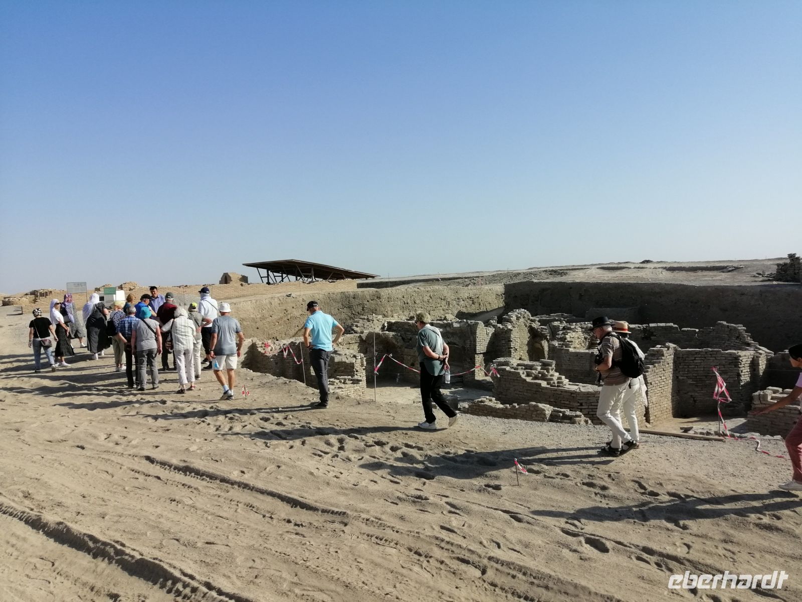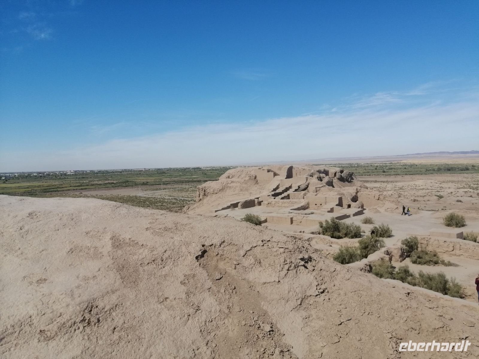 Heute steht auf unserem Programm die Erkundung der historischen Denkmäler des alten Choresmien und so starteten wir gegen 9:30 Uhr mit unserem Reisebus Richtung Kysylkum-Wüste. Zuerst machten wir einen kurzen Stopp an einer Modellaustellung der „50 Festungen“ (Miniaturausstellung) und bekamen von Gulnora eine Einführung in die Geschichte der antiken Siedlungen. Während der Weiterfahrt informierte uns Gulnora über Karakalpakstan, den westlichen Teil Usbekistans. Gegen 11:40 Uhr erreichten wir Toprak Kala und untersuchten das Gelände der antiken Festung. Der Name bedeutet übersetzt „staubige Festung“. Fast alle Gebäude in Toprak-Kala wurden aus luftgetrockneten Ziegeln gebaut. Gulnora erzählte uns, dass möglicherweise die Choresmier über ein einzigartiges Wissen im Bauwesen verfügten, wodurch sie in der Lage waren, äußerst haltbare Gebäude aus einfachem Lehm zu bauen, die man heute nach vielen Jahrhunderten noch sehen kann. Zur Verstärkung der Mauern verwendeten die Bauarbeiter damals kleine Steine, die in der Wüste gefunden wurden. Die Trockenheit im Inneren wurde durch den Flußsand erzeugt, da er die Feuchtigkeit gut aufnahm.