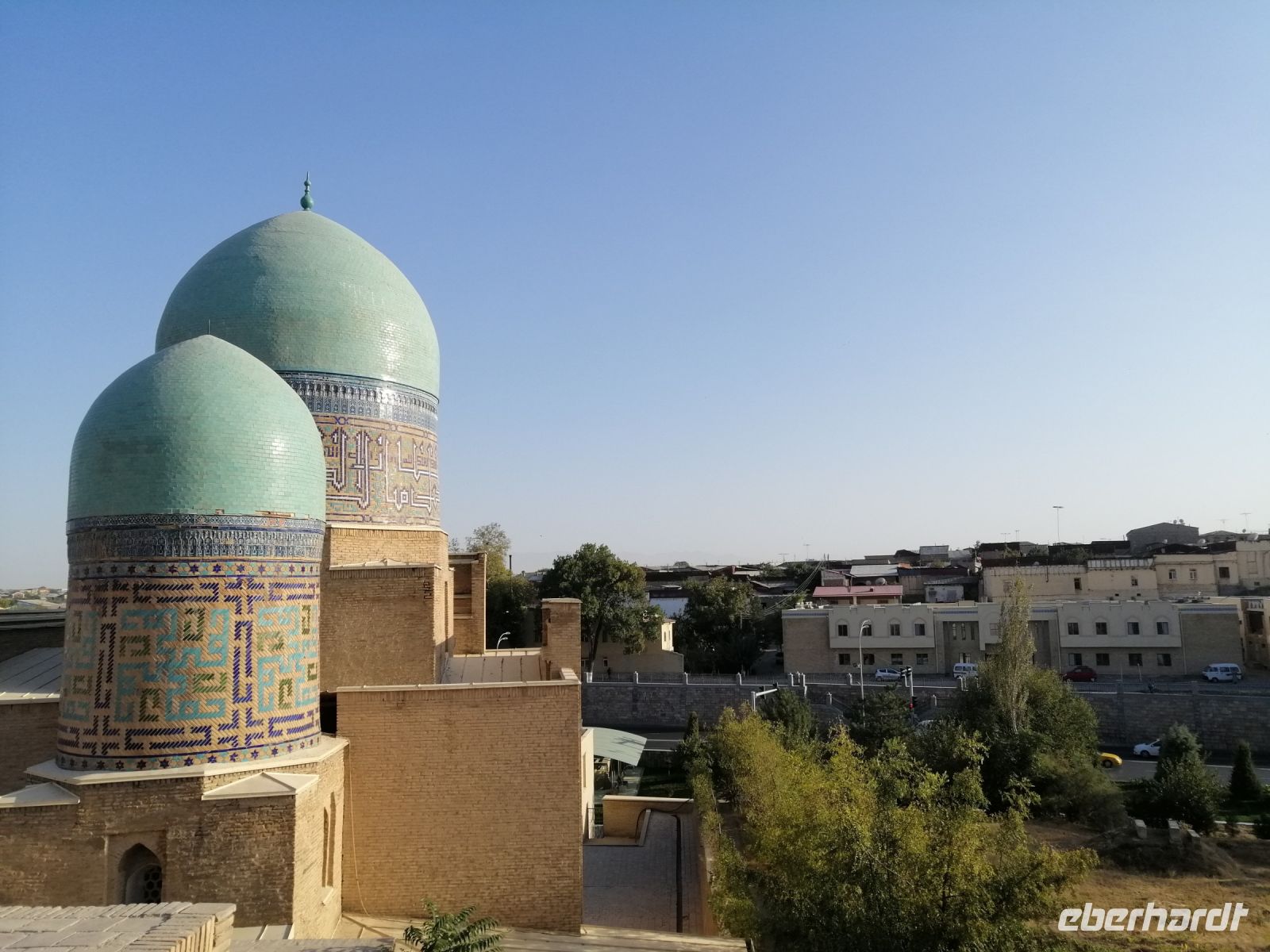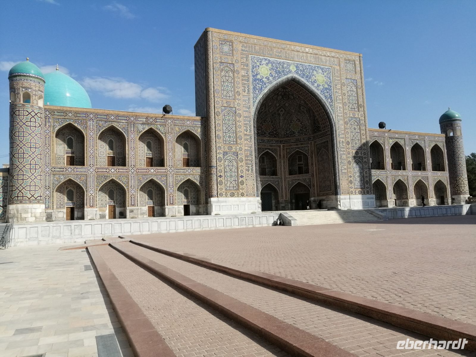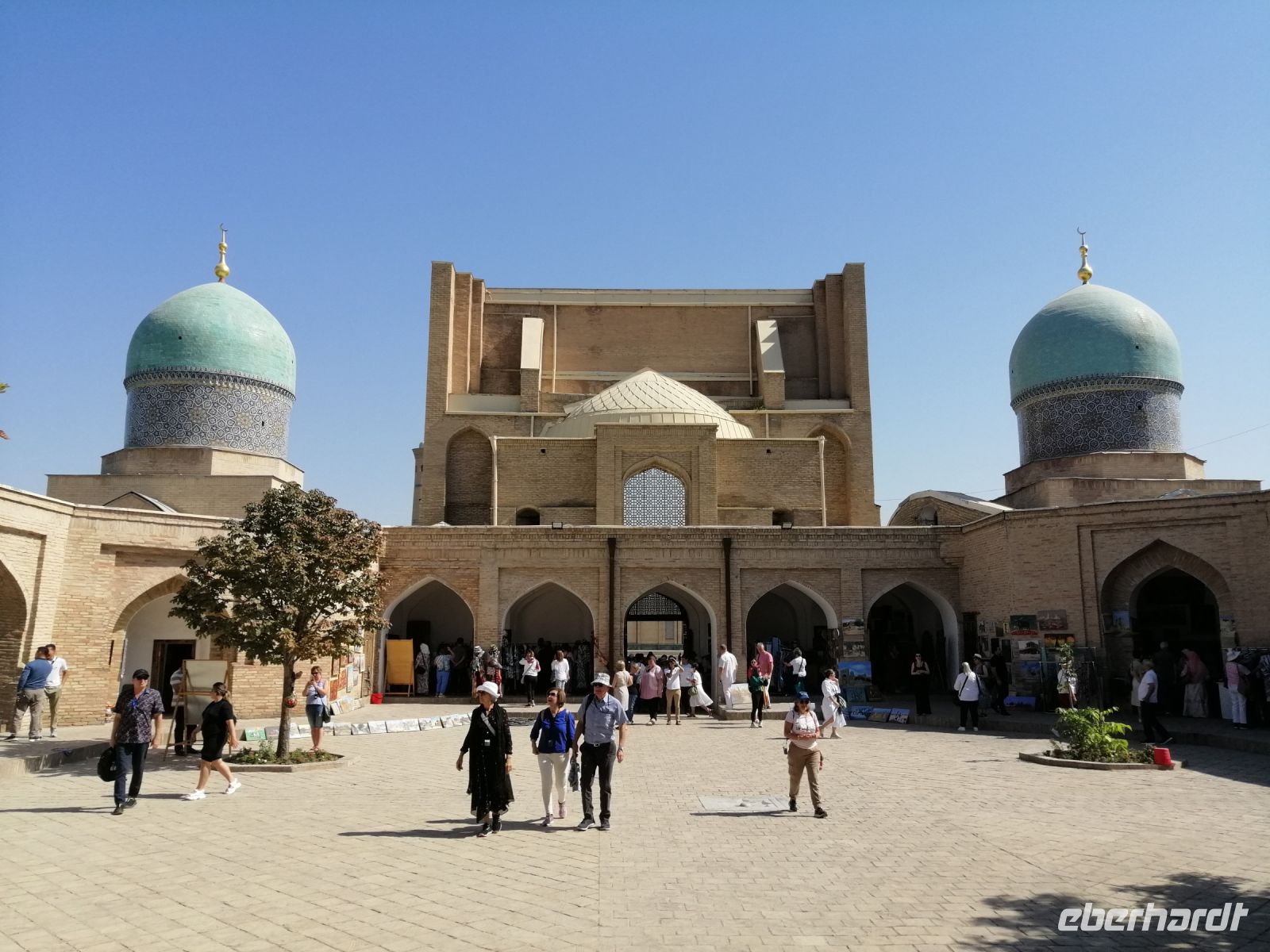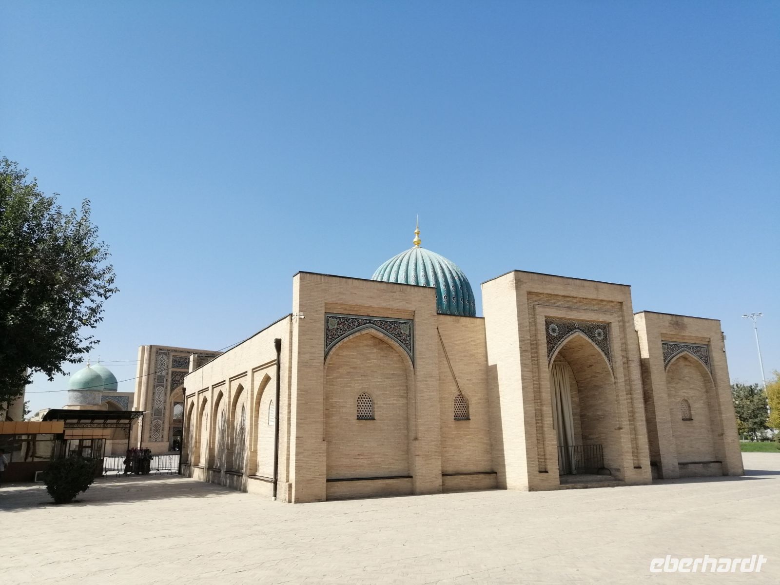Den Khasti-Imon-Komplex erreichten wir nach dem kurzen Spaziergang durch den kleinen Park. Dieses Komplex ist ein echter historischer Magnet der Stadt und besteht aus der wunderschönen Barak-Khan-Medrese, der Tillya-Sheikh-Moschee und dem Kaffal-Shashi-Mausoleum aus schlichtem Backsteinmauerwerk. In diesem Mausoleum schauten wir uns den Koran an, der vom dritten Kalifen Osman (644 – 656) handgeschriebenen wurde. Wir durften auch in die Moschee rein und den Raum von innen bewundern.