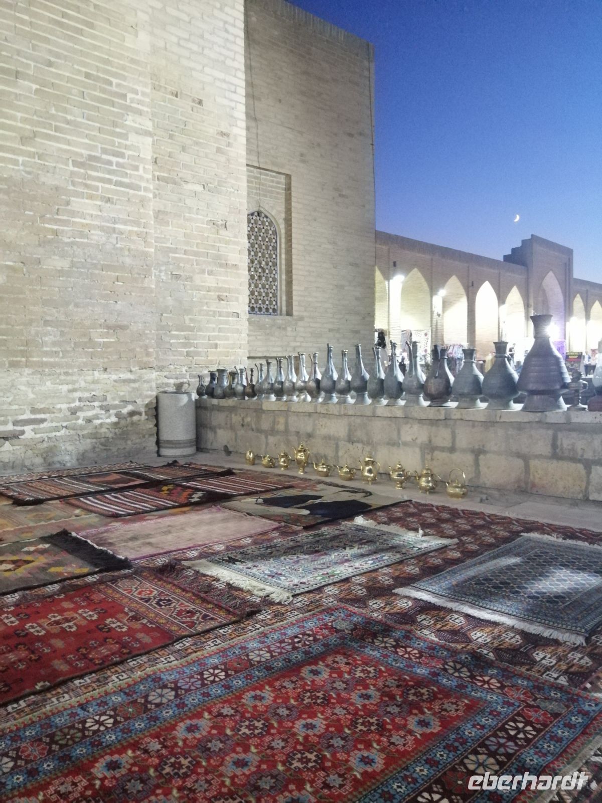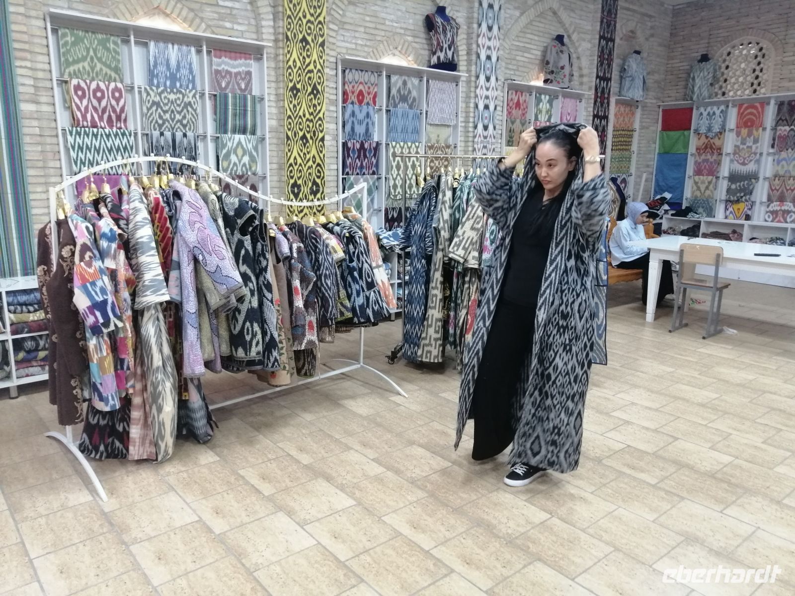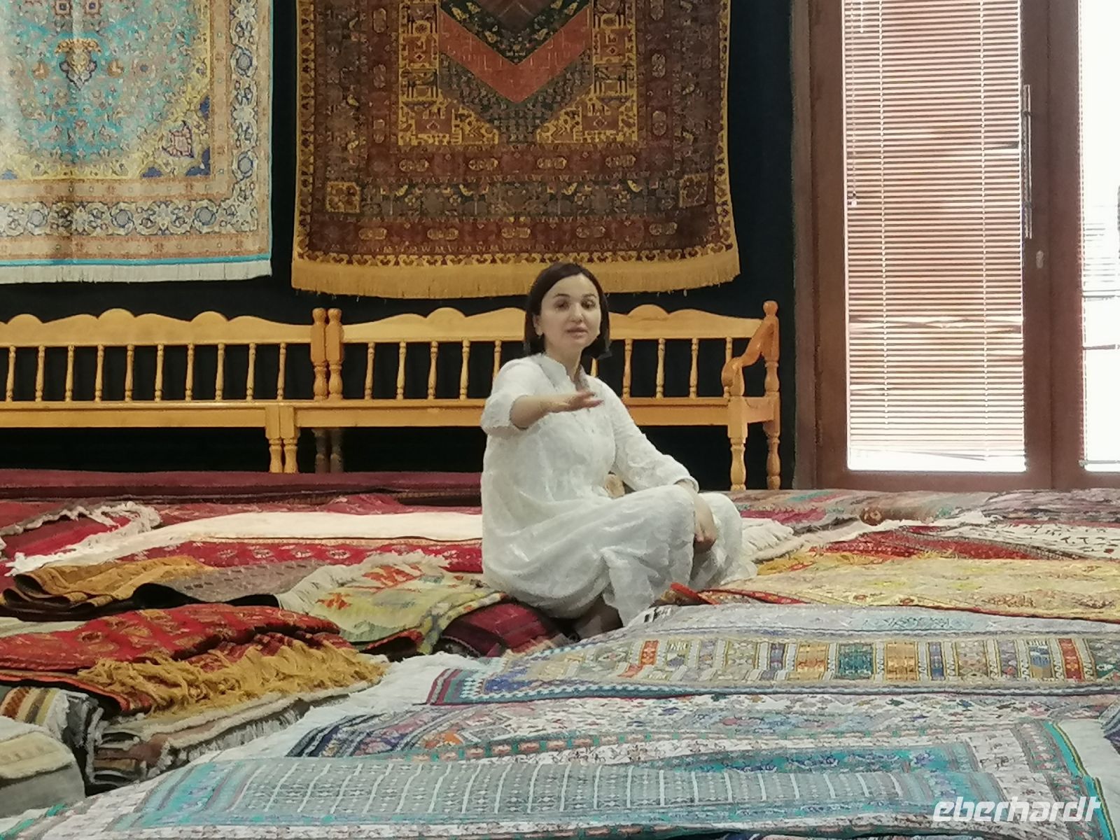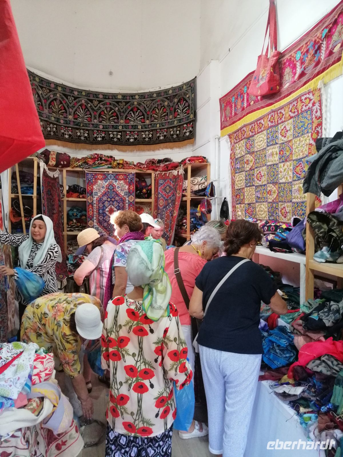 Nach der Besichtigung des Poi-Kalon-Ensembles erlebten wir zwei wunderbare Vorführungen in zwei Fachgeschäften und zwar einmal in einem Teppichladen, in dem uns die Managerin persönlich die Feinheiten des Teppich-Knüpfens beleuchtete (es gab auch ganz leckeren Grünen Tee mit orientalischen Süßigkeiten) und zum zweiten besuchten wir eine Kleider-Boutique, in der wir verschiedene hübsche Kleider aus Baumwolle und Seide bewunderten und kaufen konnten.