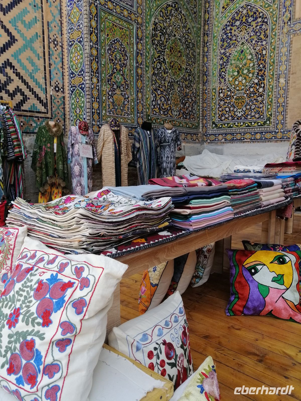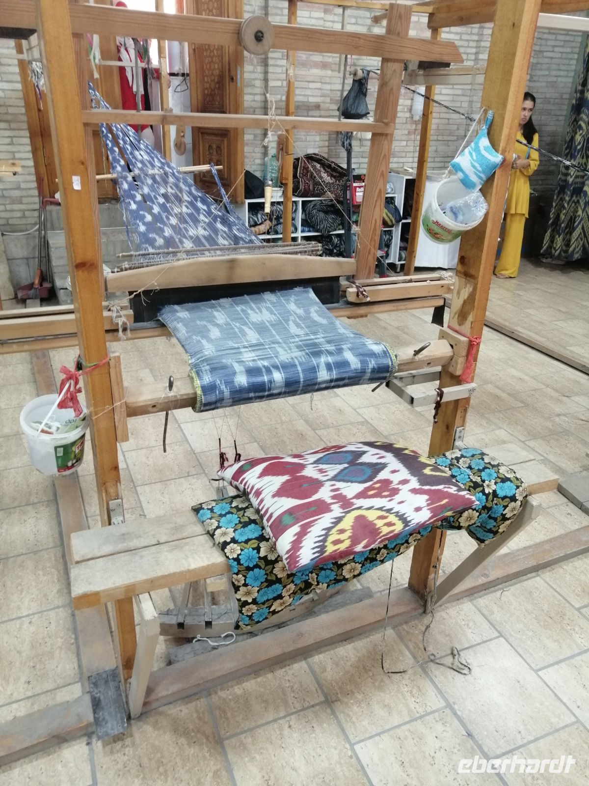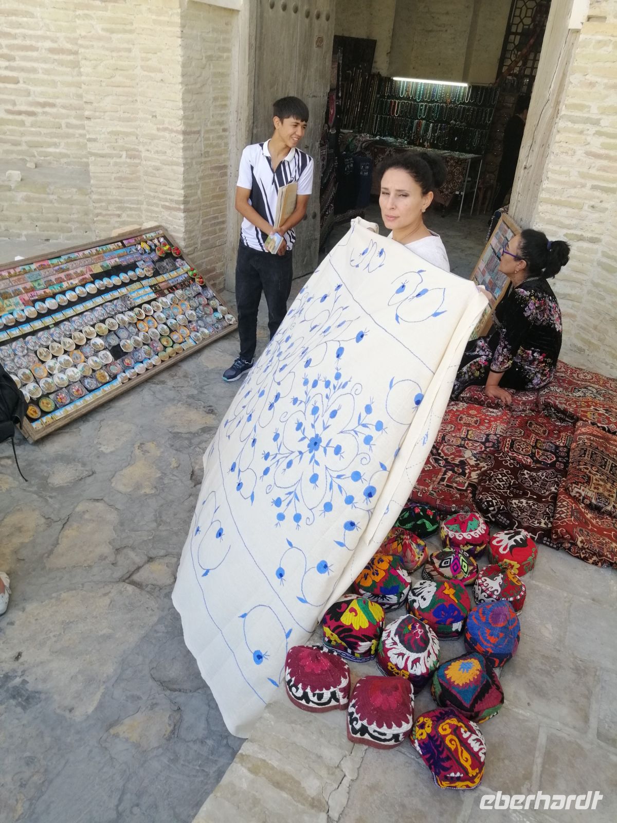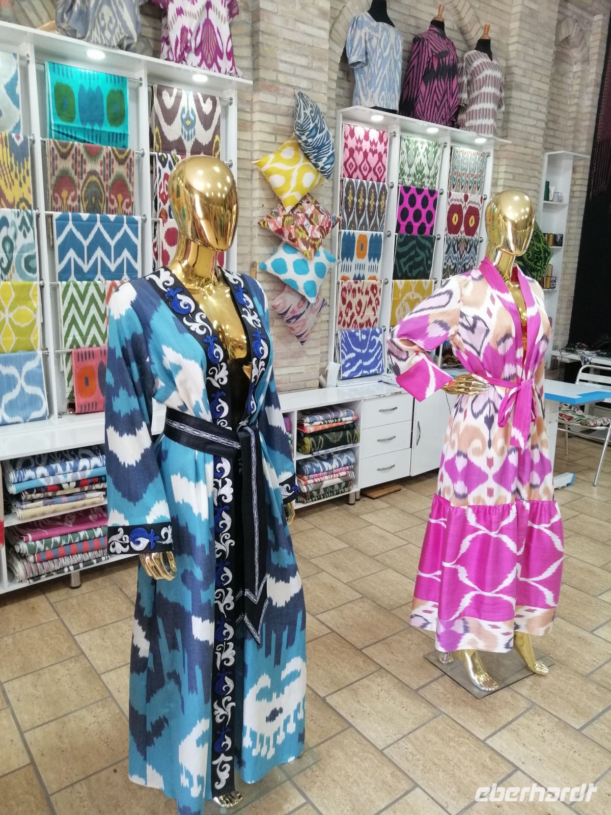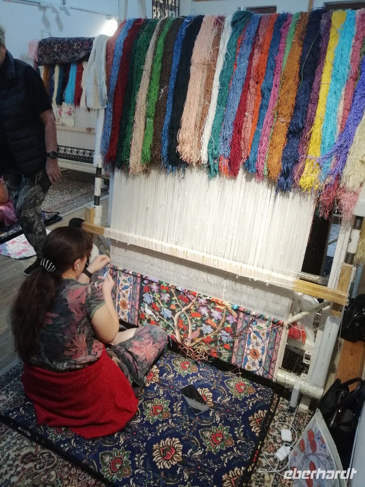 Nach der Besichtigung des Poi-Kalon-Ensembles erlebten wir zwei wunderbare Vorführungen in zwei Fachgeschäften und zwar einmal in einem Teppichladen, in dem uns die Managerin persönlich die Feinheiten des Teppich-Knüpfens beleuchtete (es gab auch ganz leckeren Grünen Tee mit orientalischen Süßigkeiten) und zum zweiten besuchten wir eine Kleider-Boutique, in der wir verschiedene hübsche Kleider aus Baumwolle und Seide bewunderten und kaufen konnten.