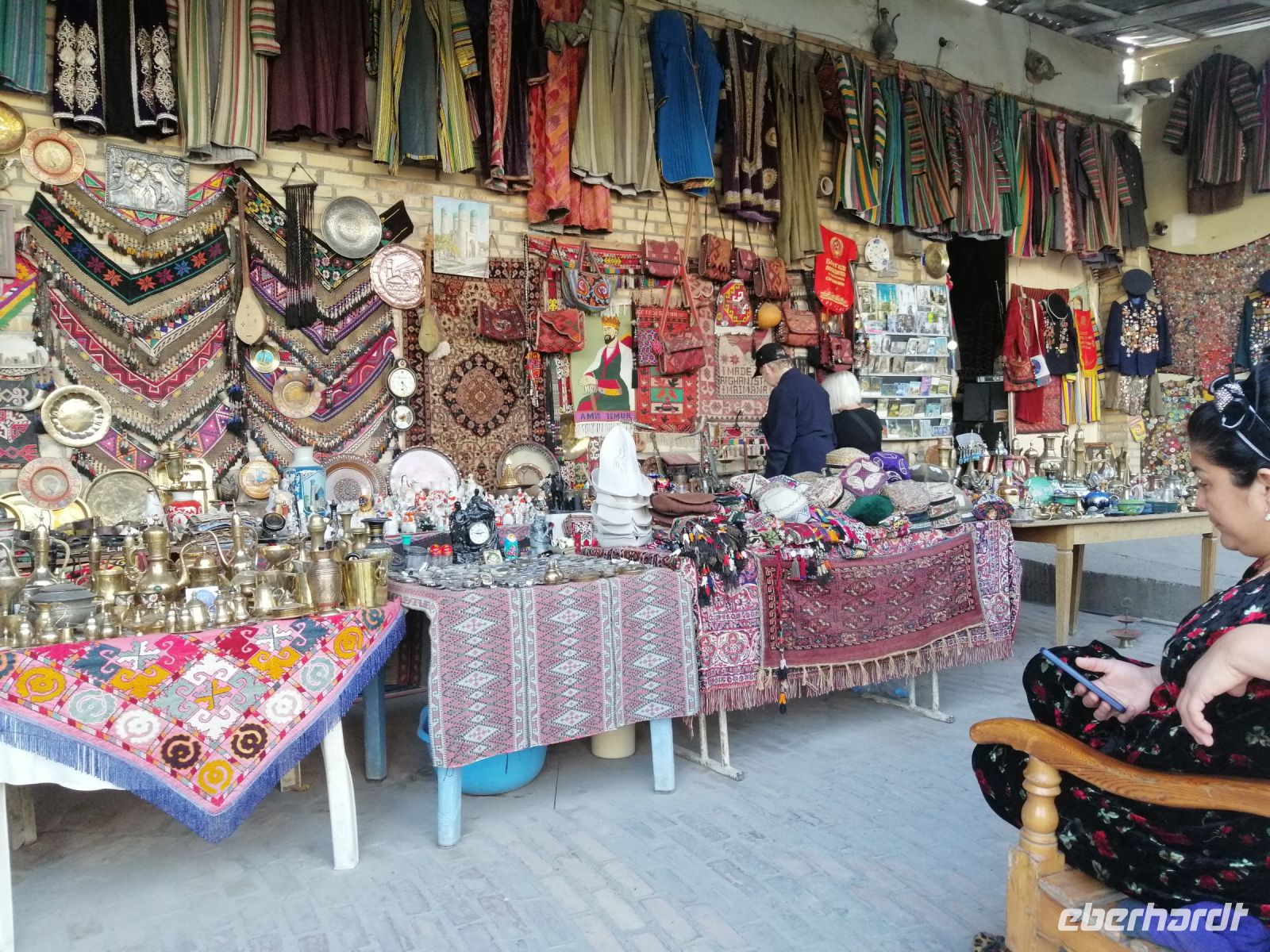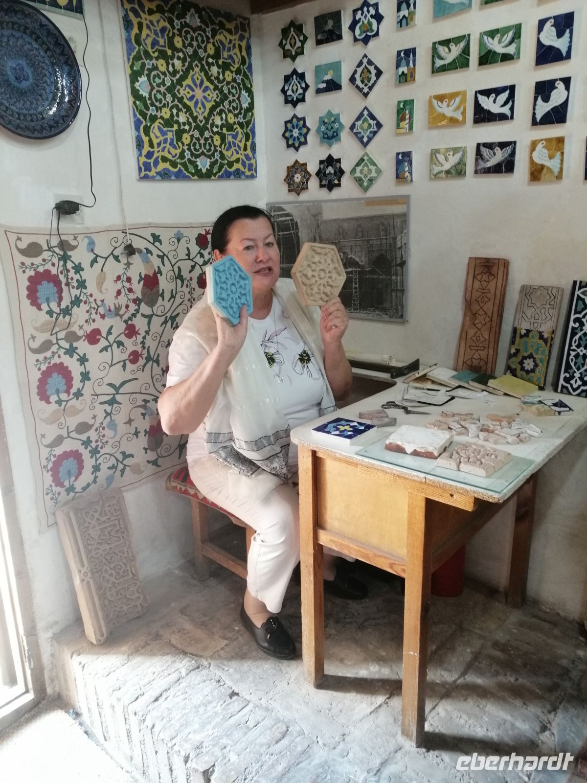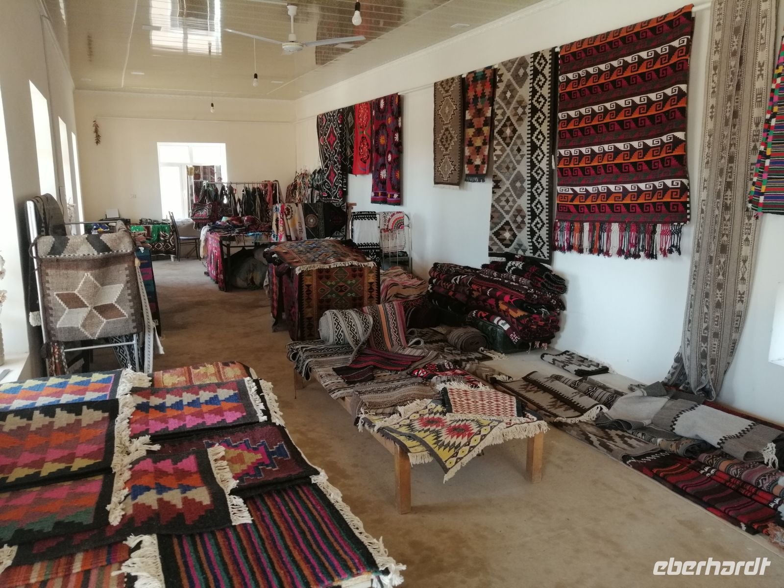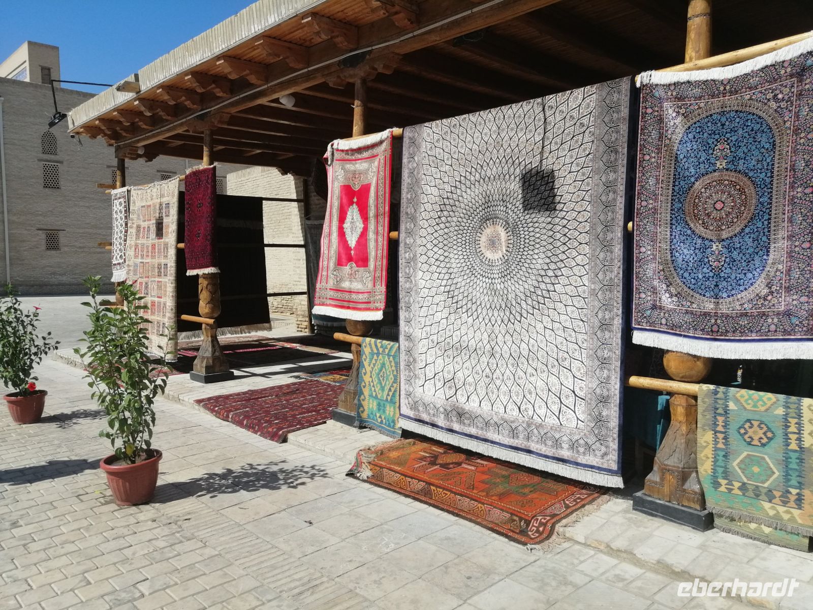 Nach der Besichtigung des Poi-Kalon-Ensembles erlebten wir zwei wunderbare Vorführungen in zwei Fachgeschäften und zwar einmal in einem Teppichladen, in dem uns die Managerin persönlich die Feinheiten des Teppich-Knüpfens beleuchtete (es gab auch ganz leckeren Grünen Tee mit orientalischen Süßigkeiten) und zum zweiten besuchten wir eine Kleider-Boutique, in der wir verschiedene hübsche Kleider aus Baumwolle und Seide bewunderten und kaufen konnten.