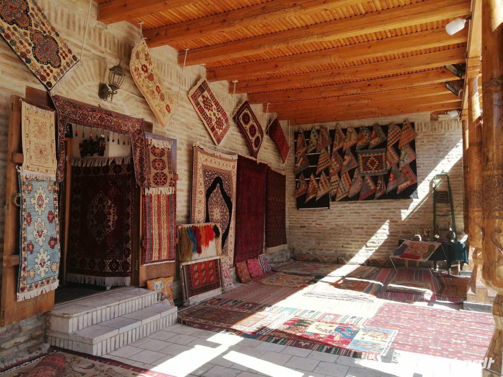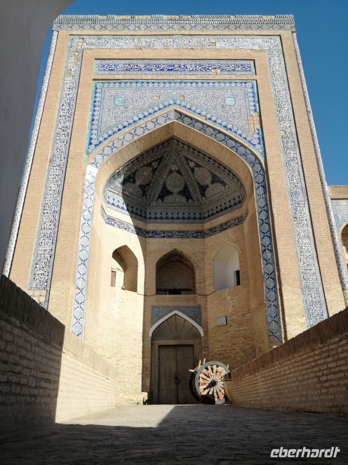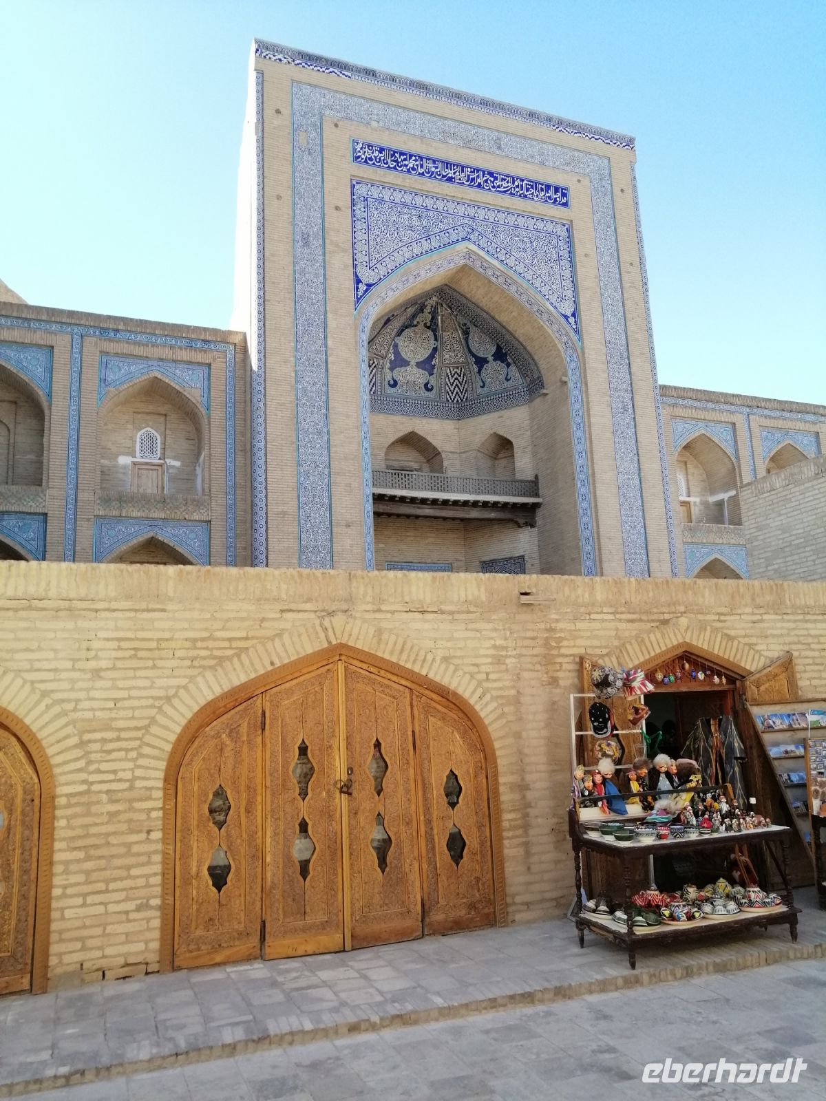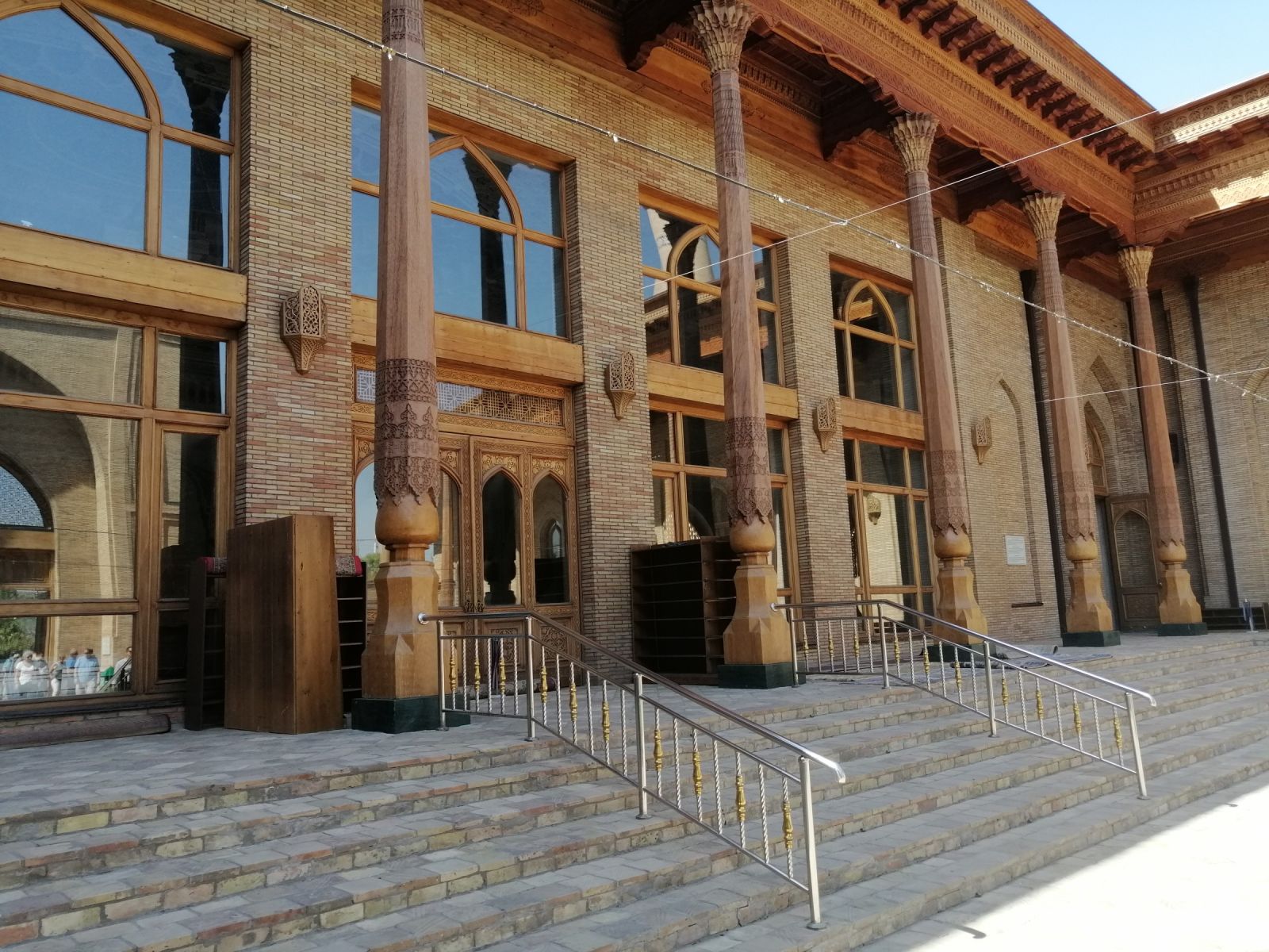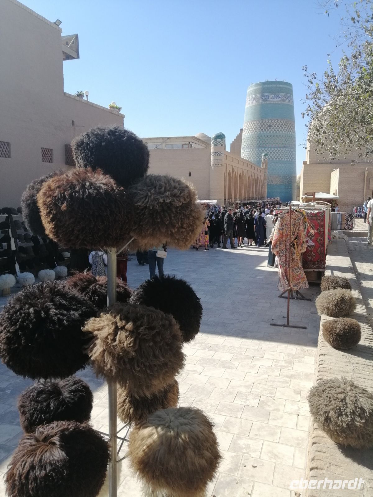 Im Museum der angewandten Kunst bewunderten wir verschiedene Ausstellungen aus Keramik, Holz, Textil und Wolle und untersuchten danach die Juma-Moschee, die durch ihre 212 Holzsäulen ein Wahrzeichen von Chiwa ist. Die Säulen stammen aus verschiedenen Epochen und wurden teilweise auch von anderen Orten nach Chiwa gebracht. Die ältesten Säulen sind mit tiefem Schnitzwerk und arabischer Kufi-Kalligrafie dekoriert. Diese Moschee ist Chiwas größte Moschee und wird als Hauptmoschee für das wichtige Freitagsgebet genutzt.