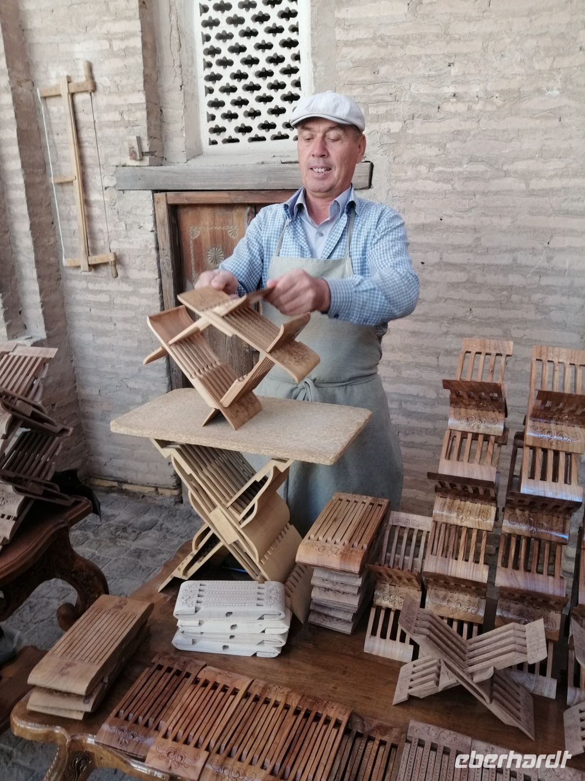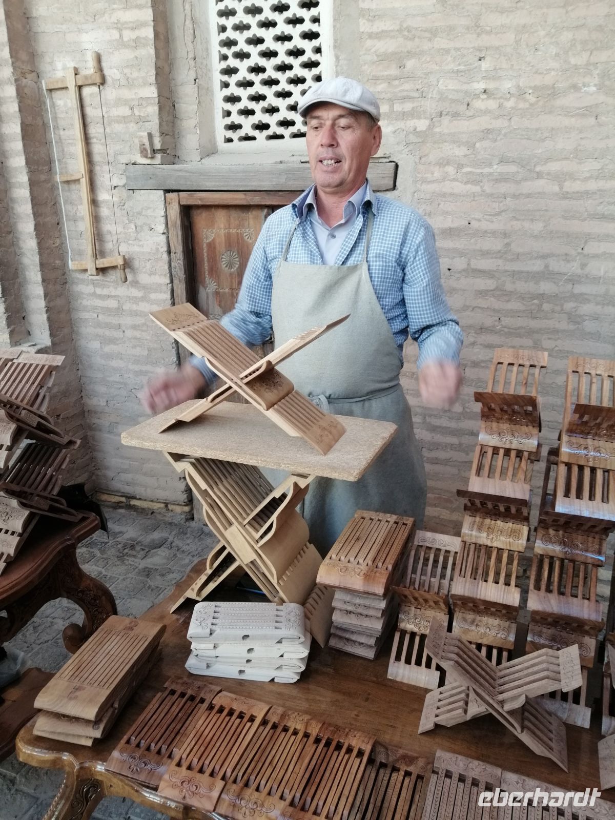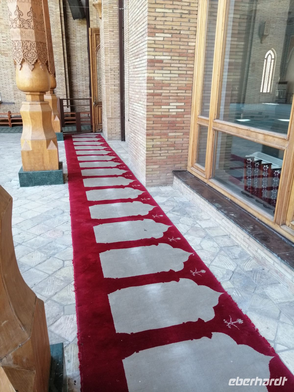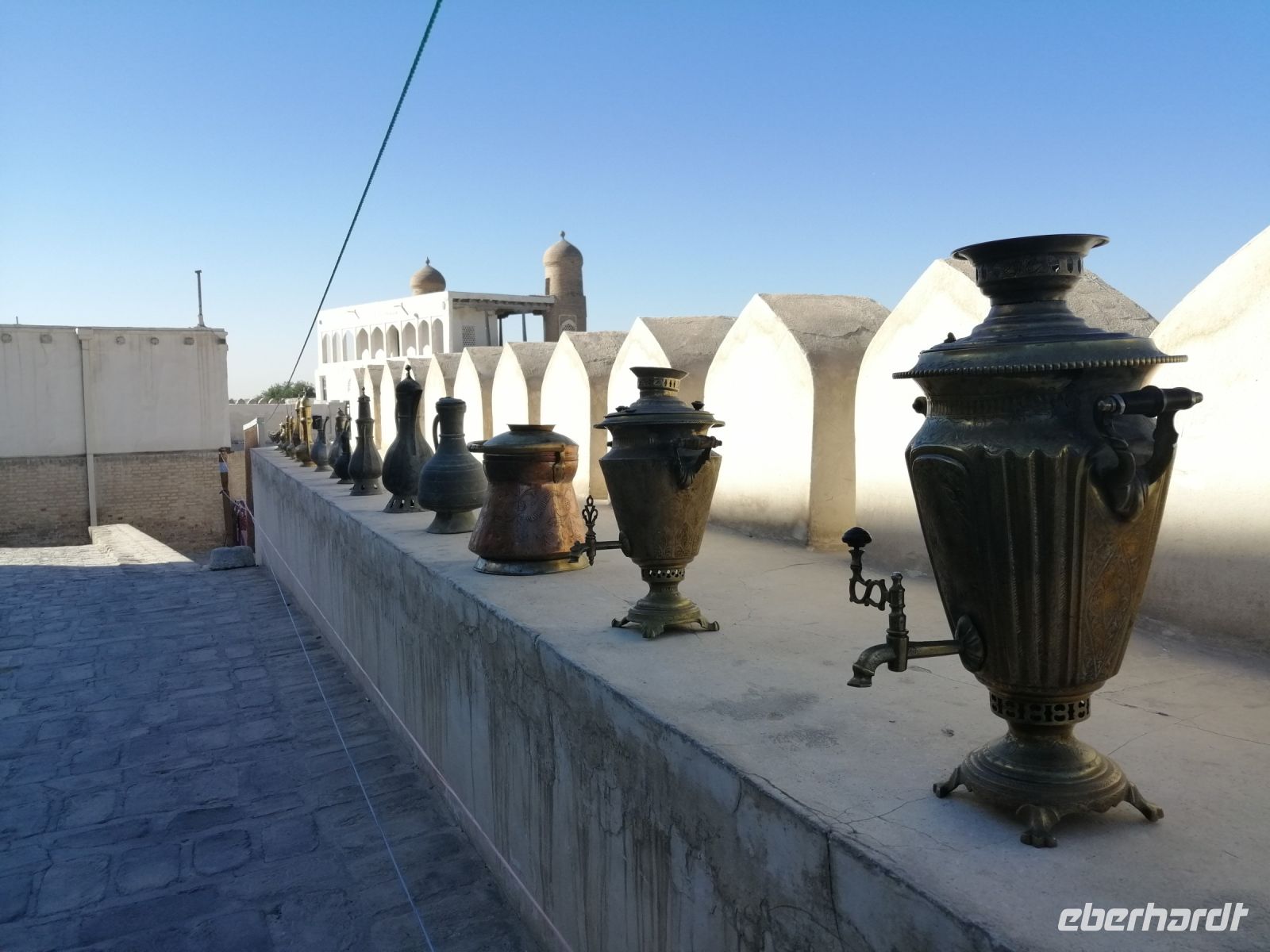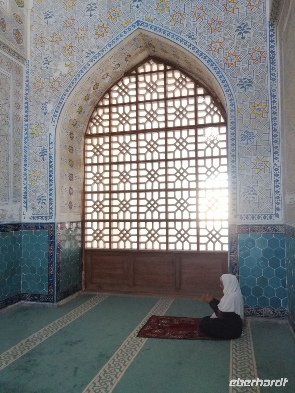 Im Museum der angewandten Kunst bewunderten wir verschiedene Ausstellungen aus Keramik, Holz, Textil und Wolle und untersuchten danach die Juma-Moschee, die durch ihre 212 Holzsäulen ein Wahrzeichen von Chiwa ist. Die Säulen stammen aus verschiedenen Epochen und wurden teilweise auch von anderen Orten nach Chiwa gebracht. Die ältesten Säulen sind mit tiefem Schnitzwerk und arabischer Kufi-Kalligrafie dekoriert. Diese Moschee ist Chiwas größte Moschee und wird als Hauptmoschee für das wichtige Freitagsgebet genutzt.