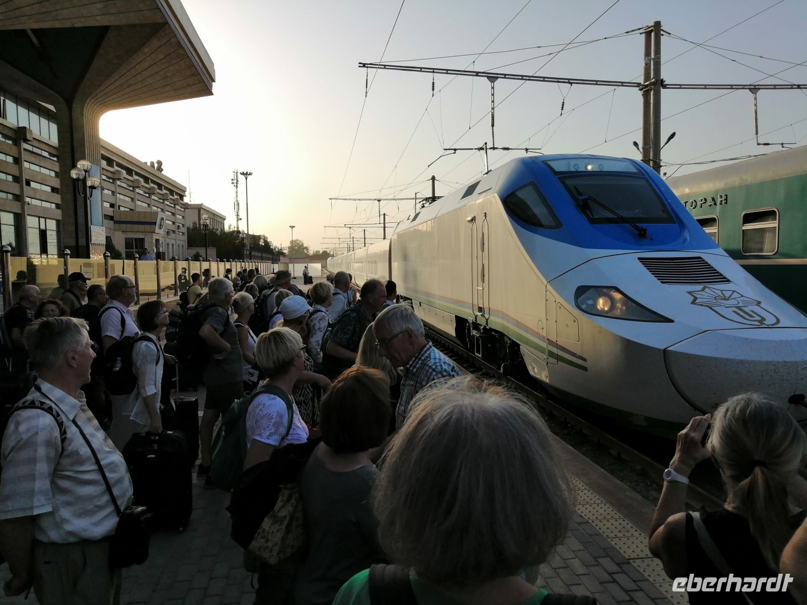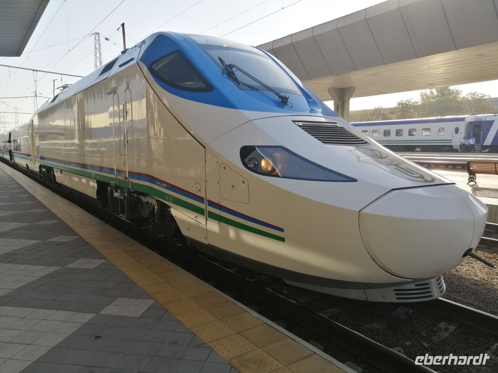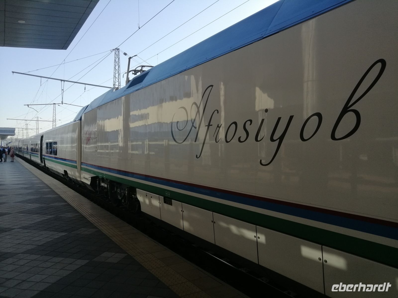 Heute nutzten wir ein anderes Verkehrsmittel und fuhren mit einem Hochgeschwindigkeitszug „Afrosiab“ nach Samarkand. Der Elektrozug wurde mithilfe der Hochtechnologie in Spanien von der Firma „Talgo“ entwickelt. Aerodynamischer Vorderdesign des Schnellzuges erlaubt es ihm die Wirkung der Druckwelle und des Seitenwindes zu optimieren, so dass Maximalgeschwindigkeit von bis zu 210 km/h erreicht wird. Die Bezeichnung des Zuges „Afrosiab“ ist der alte Name der Stadt Samarkand, sozusagen sein Vorläuferort. Ihr Tell liegt im Nordosten des historischen Zentrums von Samarkand.