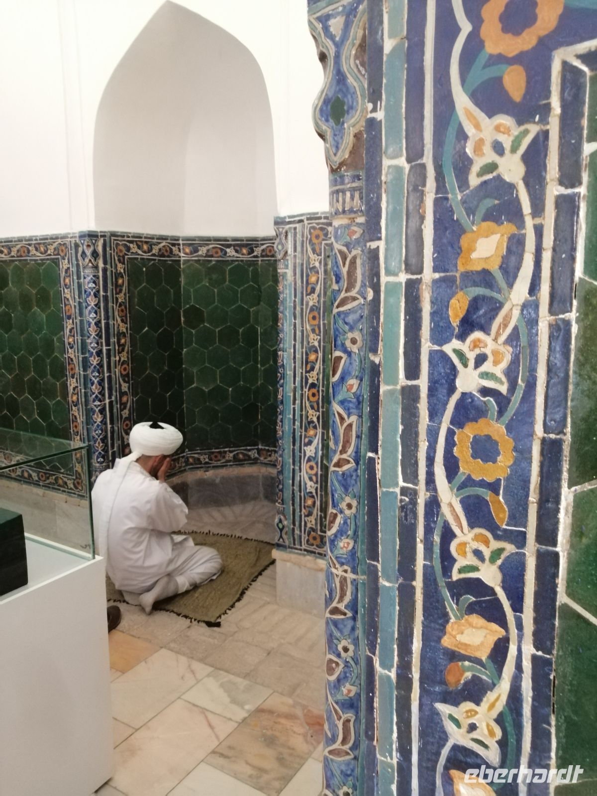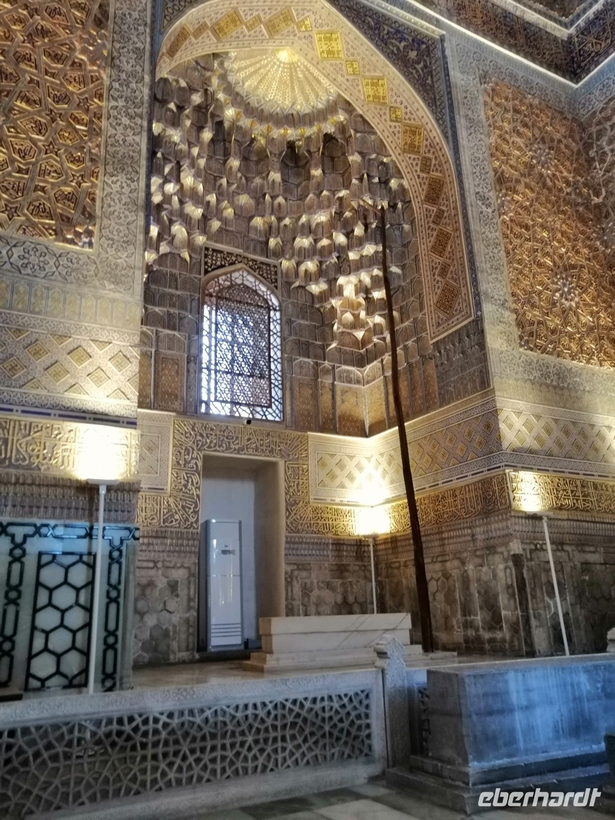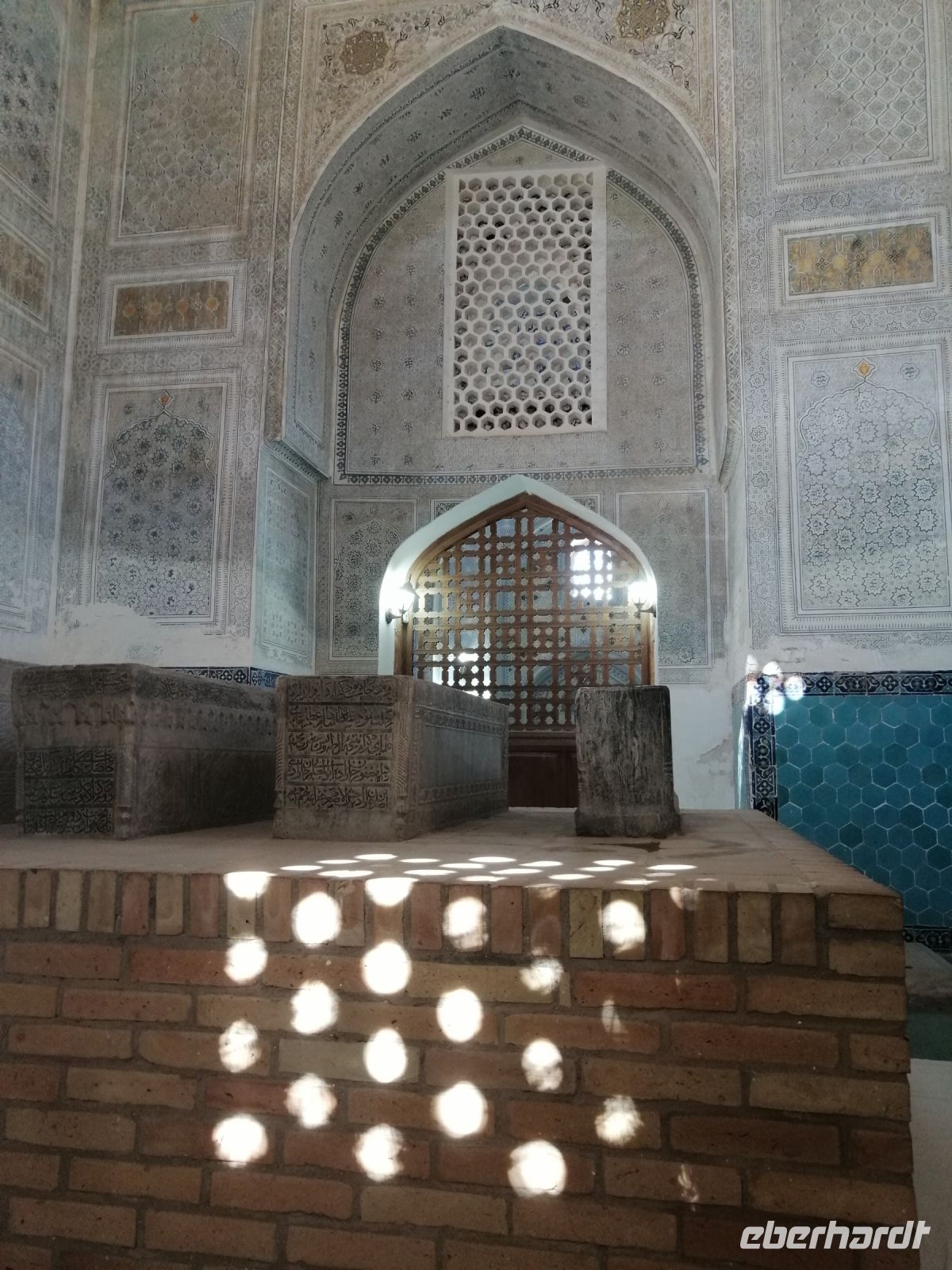 Am Samarkander Bahnhof wurden wir von unserem neuen Busfahrer Schafkad in Empfang genommen. Er brachte uns zu der ersten bedeutenden Sehenswürdigkeit und zwar zum Mausoleum-Komplex Gur Emir. Übersetzt bedeutet das Wort „Grab des Emirs“. Dabei handelt es sich um das Familiengrab der timuridischen Dynastie. Insgesamt gab es hier 9 Gräber: neben Timur selbst sind hier zwei seiner Söhne (Shahrukh und Miranshah), zwei seiner Enkel (Ulugbek und Muhammad Sultan) sowie zwei seiner Urenkel (die Söhne von Ulugbek) bestattet. Daneben fand auch Timurs geistiger Mentor Mir Said Baraka im Mausoleum seine letzte Ruhestätte. In einer Nische gibt es zudem die Grabstätte eines weiteren Geistlichen. Dieses Grab befand sich bereits vor Bau des Mausoleums an dieser Stelle und durfte nach muslimischer Tradition nicht angefasst werden. Trotz all dieser wichtigen Personen der Timuriden-Dynastie wird das Mausoleum grundsätzlich nur als Timurs Mausoleum bezeichnet.