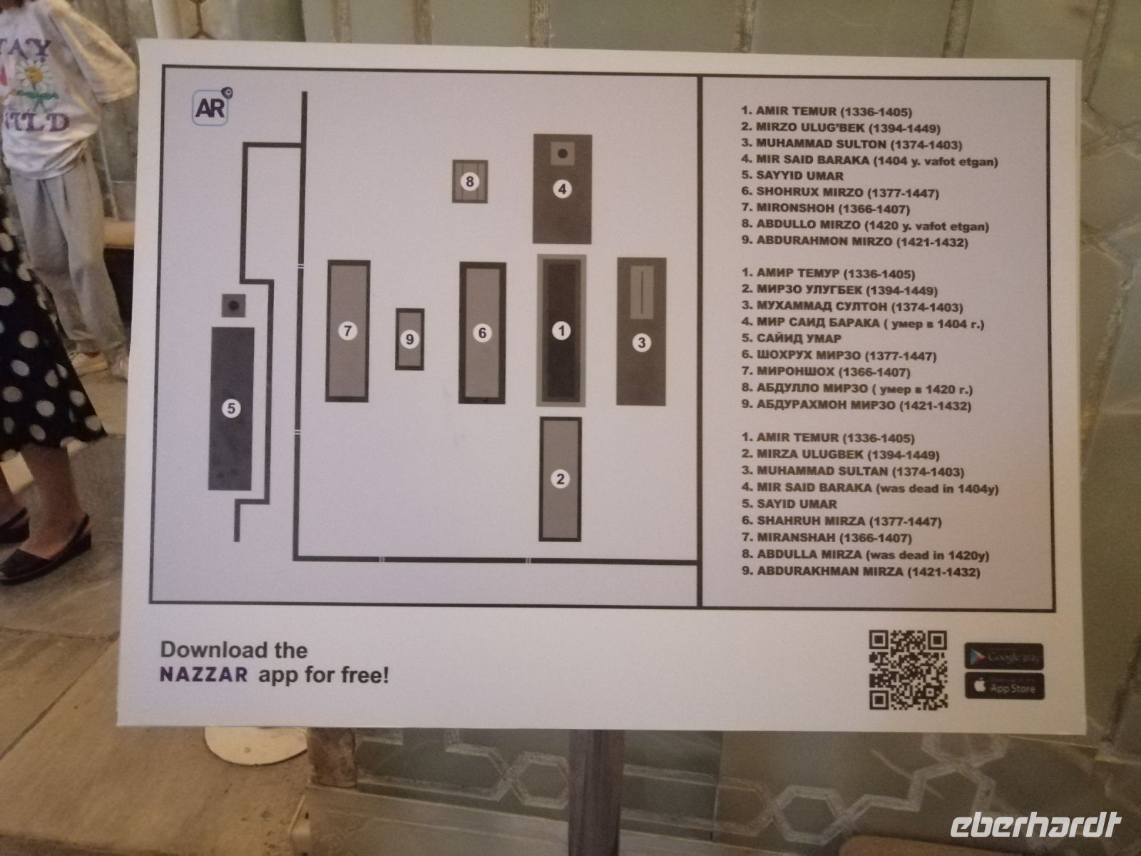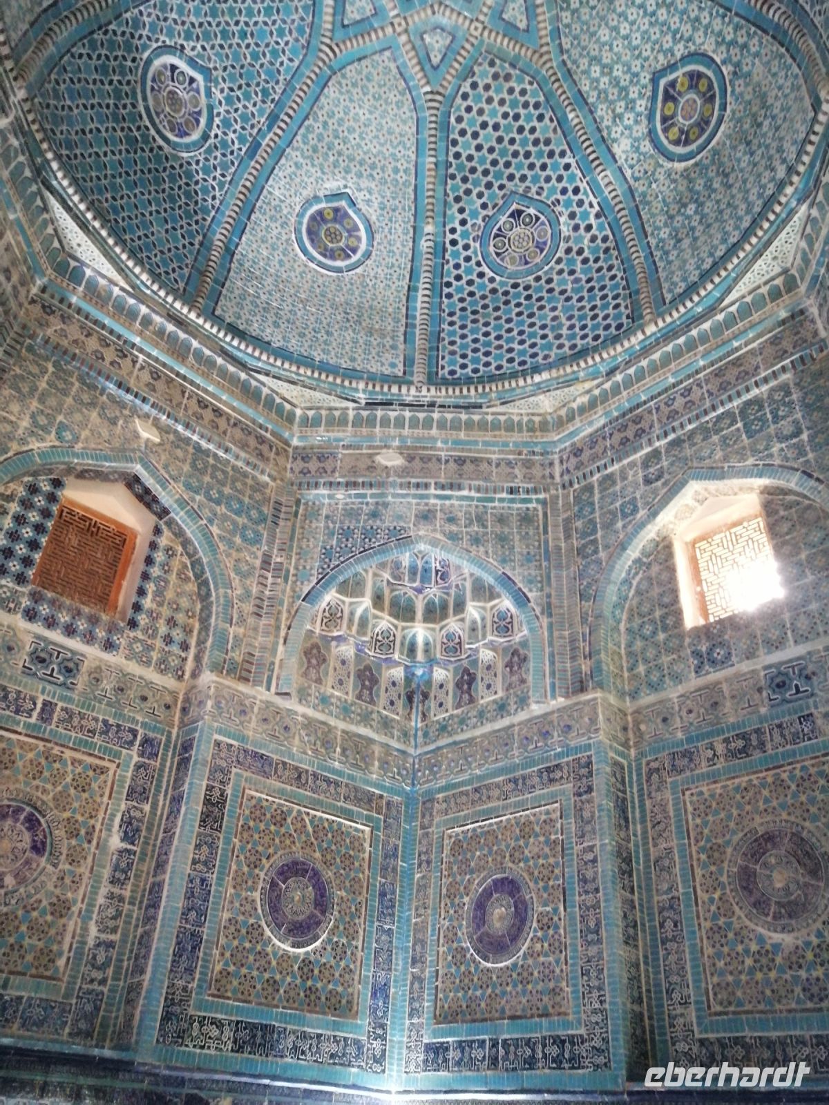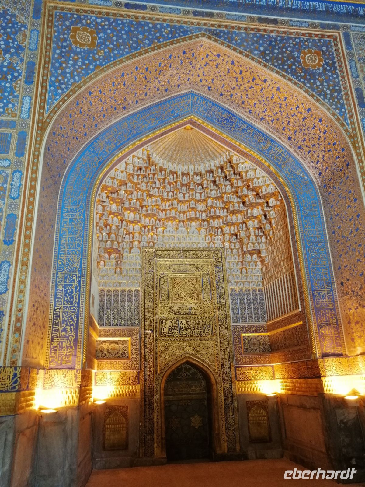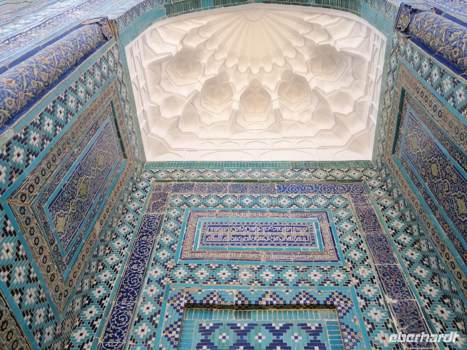 Am Samarkander Bahnhof wurden wir von unserem neuen Busfahrer Schafkad in Empfang genommen. Er brachte uns zu der ersten bedeutenden Sehenswürdigkeit und zwar zum Mausoleum-Komplex Gur Emir. Übersetzt bedeutet das Wort „Grab des Emirs“. Dabei handelt es sich um das Familiengrab der timuridischen Dynastie. Insgesamt gab es hier 9 Gräber: neben Timur selbst sind hier zwei seiner Söhne (Shahrukh und Miranshah), zwei seiner Enkel (Ulugbek und Muhammad Sultan) sowie zwei seiner Urenkel (die Söhne von Ulugbek) bestattet. Daneben fand auch Timurs geistiger Mentor Mir Said Baraka im Mausoleum seine letzte Ruhestätte. In einer Nische gibt es zudem die Grabstätte eines weiteren Geistlichen. Dieses Grab befand sich bereits vor Bau des Mausoleums an dieser Stelle und durfte nach muslimischer Tradition nicht angefasst werden. Trotz all dieser wichtigen Personen der Timuriden-Dynastie wird das Mausoleum grundsätzlich nur als Timurs Mausoleum bezeichnet.