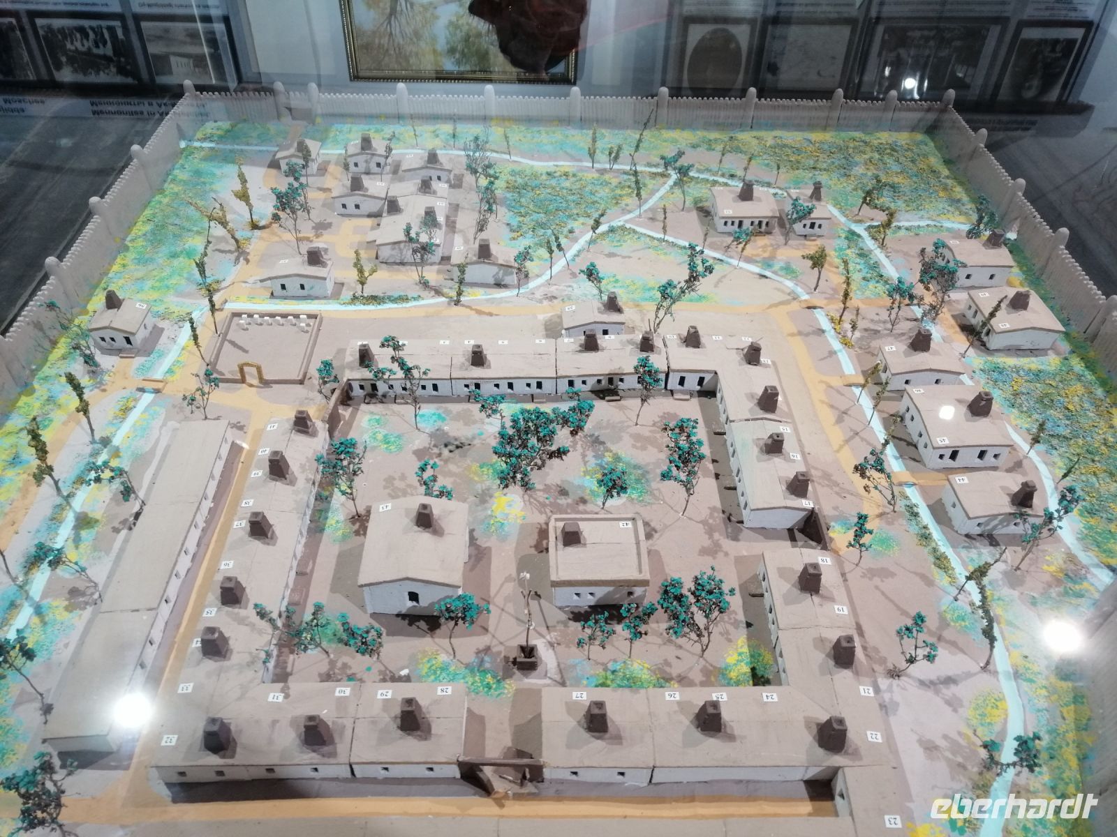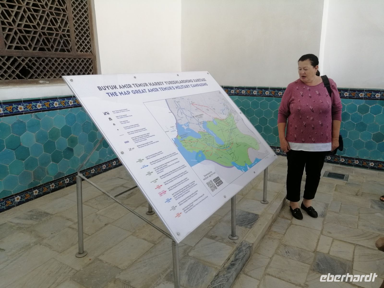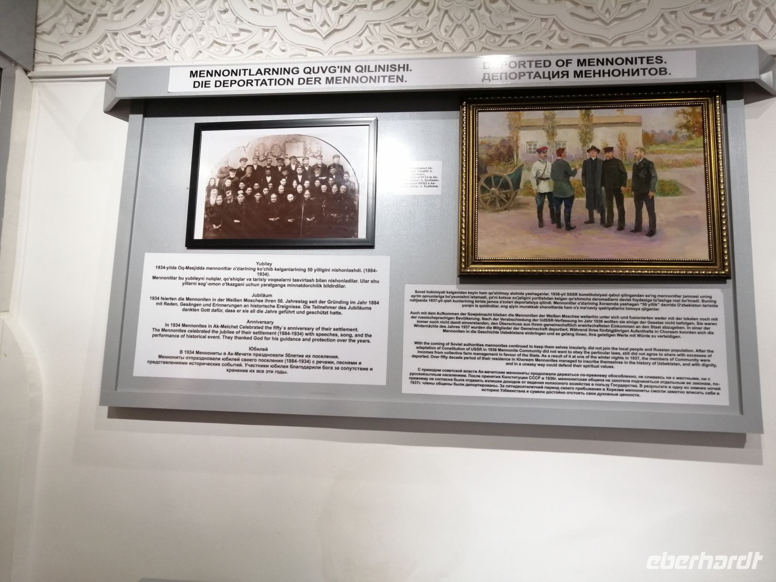 Heute konnten wir gut ausschlafen und starteten unseren Stadtrundgang durch Chiwa erst gegen 9:30 Uhr. Kurz nach dem Haupteingang in die Altstadt macht uns Gulnora mit dem Stadtplan von Chiwa bekannt. Wir besichtigten die Muhhamada Amin Khana Medresse, in der sich ein Hotel befindet. In einem kleinen Museum schräg gegenüber informieren wir uns über die deutschen Mennoniten in Chiwa: eine evangelische Freikirche, die auf die Täufer-Bewegungen der Reformationszeit zurückgeht. Der Name leitet sich von dem aus Friesland stammenden Theologen Menno Simons (1496–1561) ab. Gulnora erzählte uns über die Bräuche und Lebensweise der Mennoniten, die im Jahr 1909 aus Ak-Metschet bei Chiwa in das Talas-Tal in Kirgisien übersiedelten und 6 km von Dimitrowka das Dorf „Hohendorf“ mit damals 18 Häusern gründeten. Auf Russisch hieß es „Chiwinka“ (von Chiwa). Einige Jahre später gründeten weitere Zuwanderer „Johannesdorf“ im Talas-Tal.