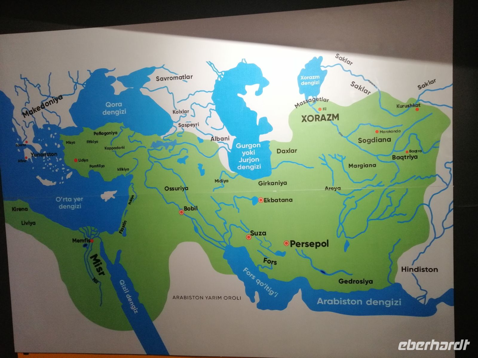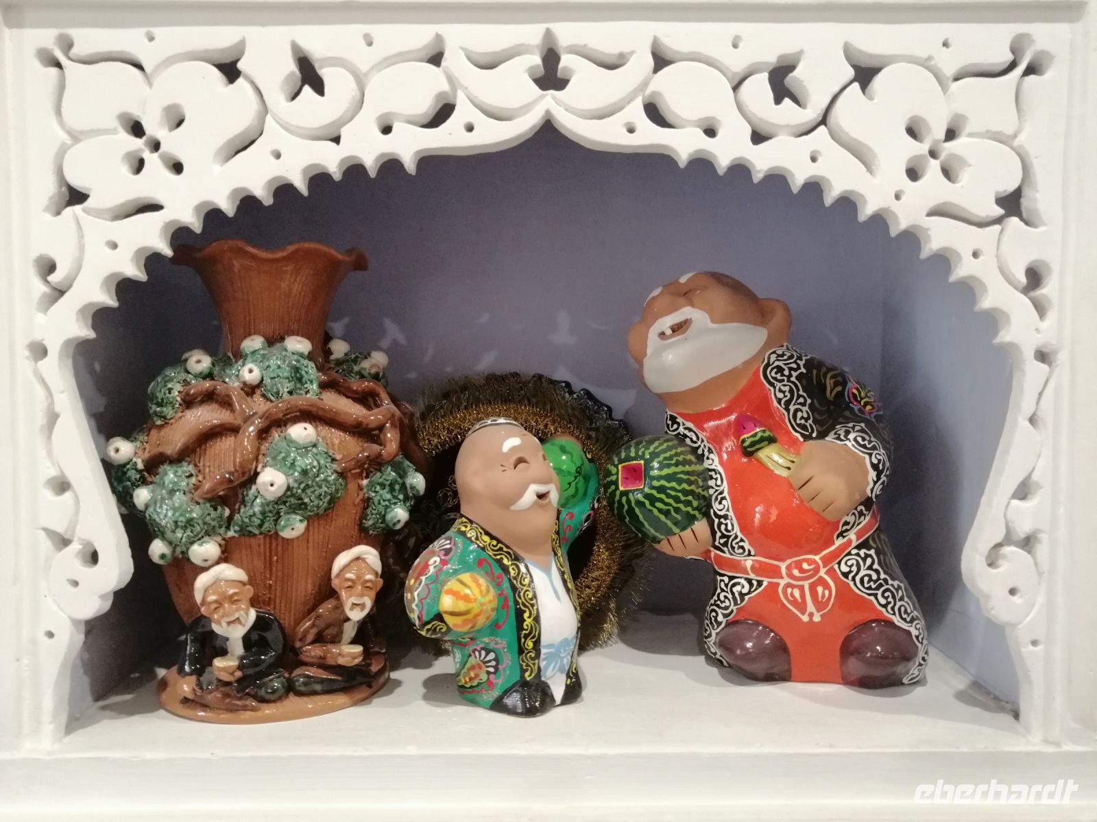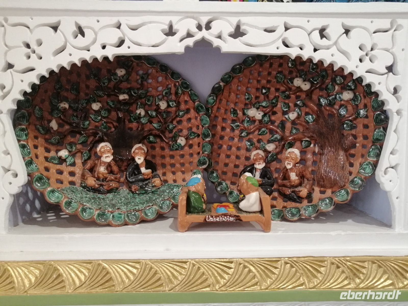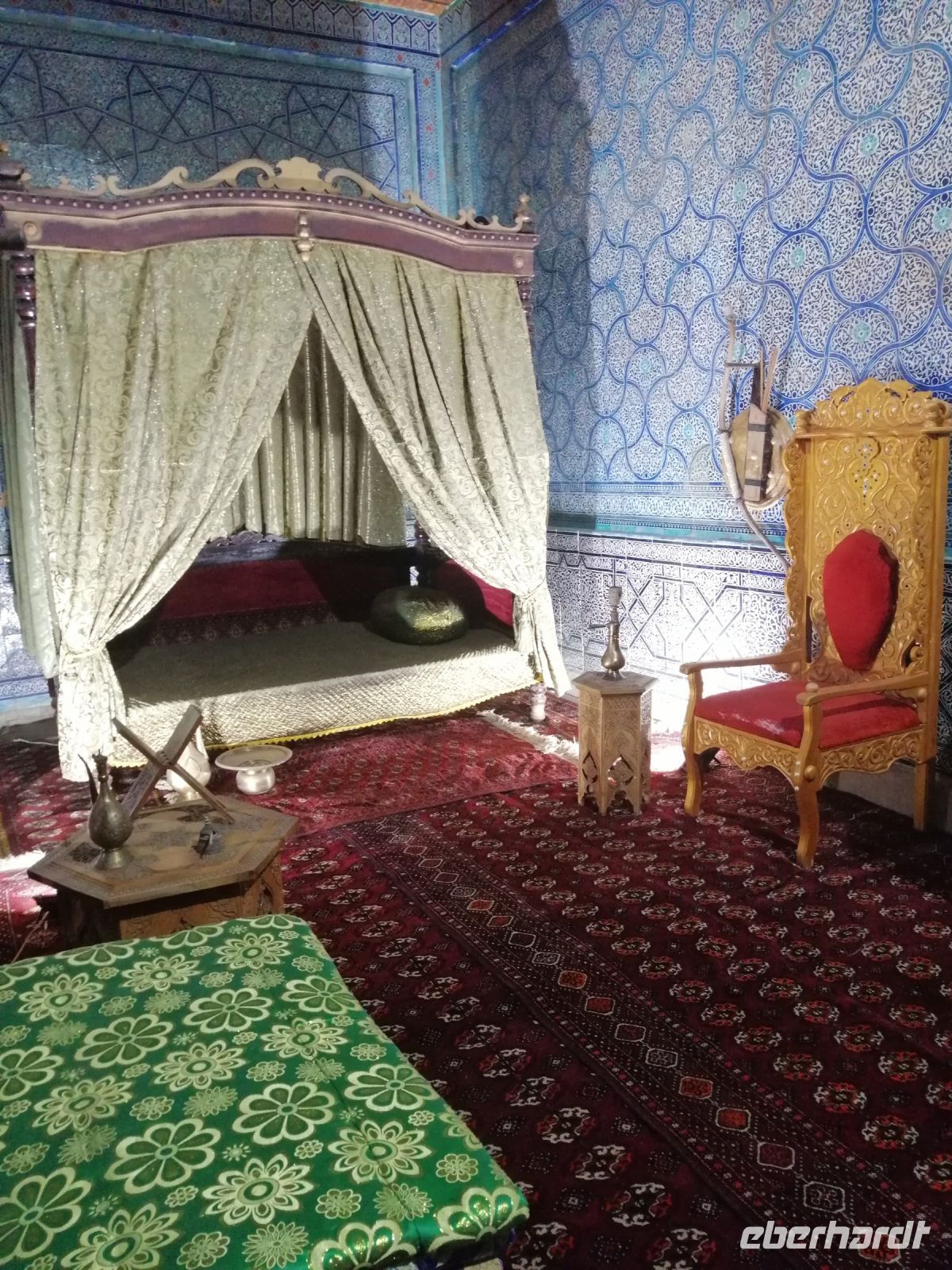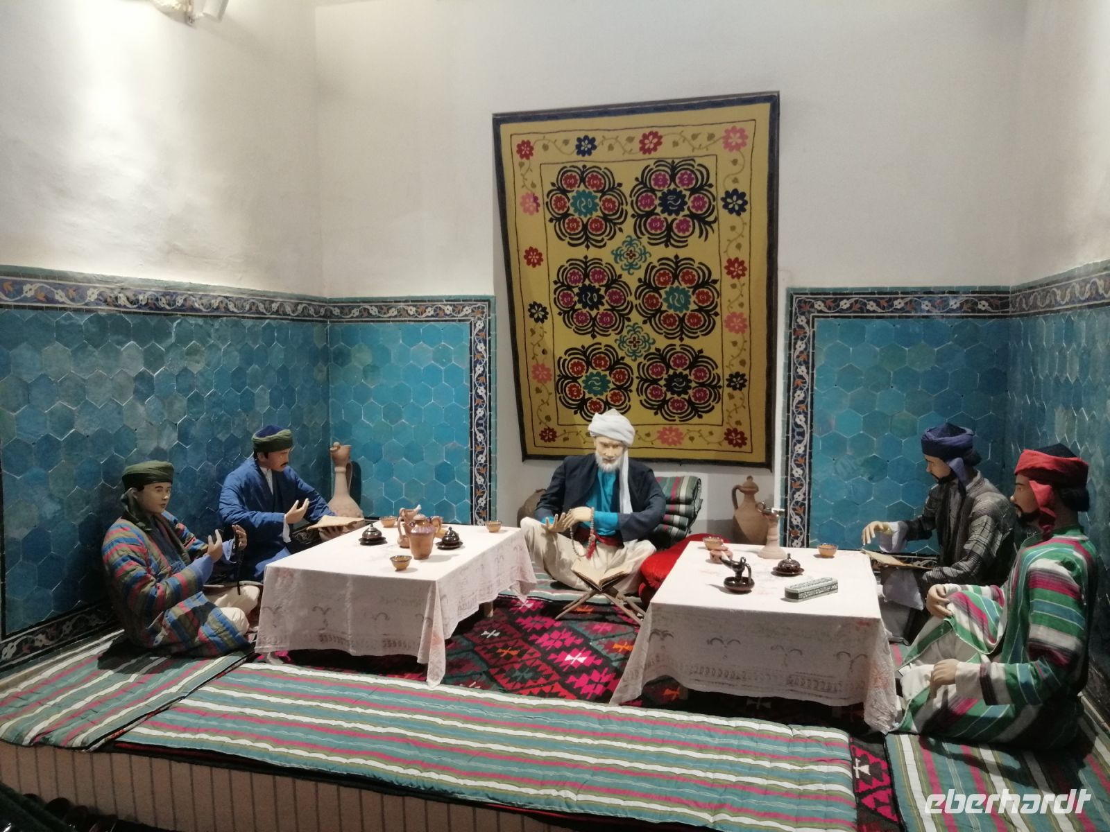 Unsere Mittagspause verbrachten wir in der gemütliche Tee-Stube „Farrukh“, bevor wir unsere Erkundung Chiwas mit Besichtigung des Charesm-Museums fortsetzten. Dort bewunderten wir die große Kutsche, die als ein Geschenk des russischen Zaren ausgestellt war. In einem Harem erzählte uns Gulnora über den Alltag der Frauen im Mittelalter. Die Besichtigung des Museum der Achämeniden und der Neolit-Museums rundete den historischen Teil unseres heutigen Tages in Chiwa ab.