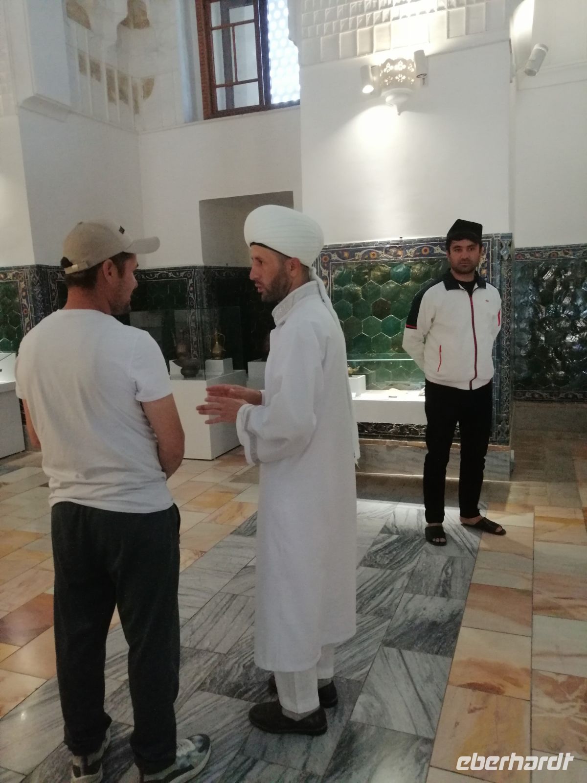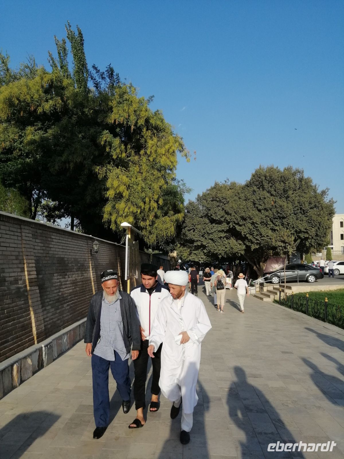 Anschließend fuhren wir mit unserem Reisebus zum Khasti-Imon-Komplex und besichtigten das Kaffal-Schaschi-Mausoleum: ein Grabmal für den 926 n. Chr. verstorbenen Imam Abu Bakr Kaffal Schaschi. Kurz vorher erzählte uns Gulnora über das muslimische Institut, das nach Imam Al Bukhari benannt wurde und sich neben an befand. Wir erfuhren was das Wort „Moschee“ bedeutet: Ort, an dem man zum Gebet niederfällt und das im Islam zwischen drei verschiedenen Arten von Moscheen unterschieden wird: und zwar eine Freitagsmoschee, eine Versammlungsmoschee und eine kleine Moschee für das tägliche Gebet – Wohnviertelmoschee.