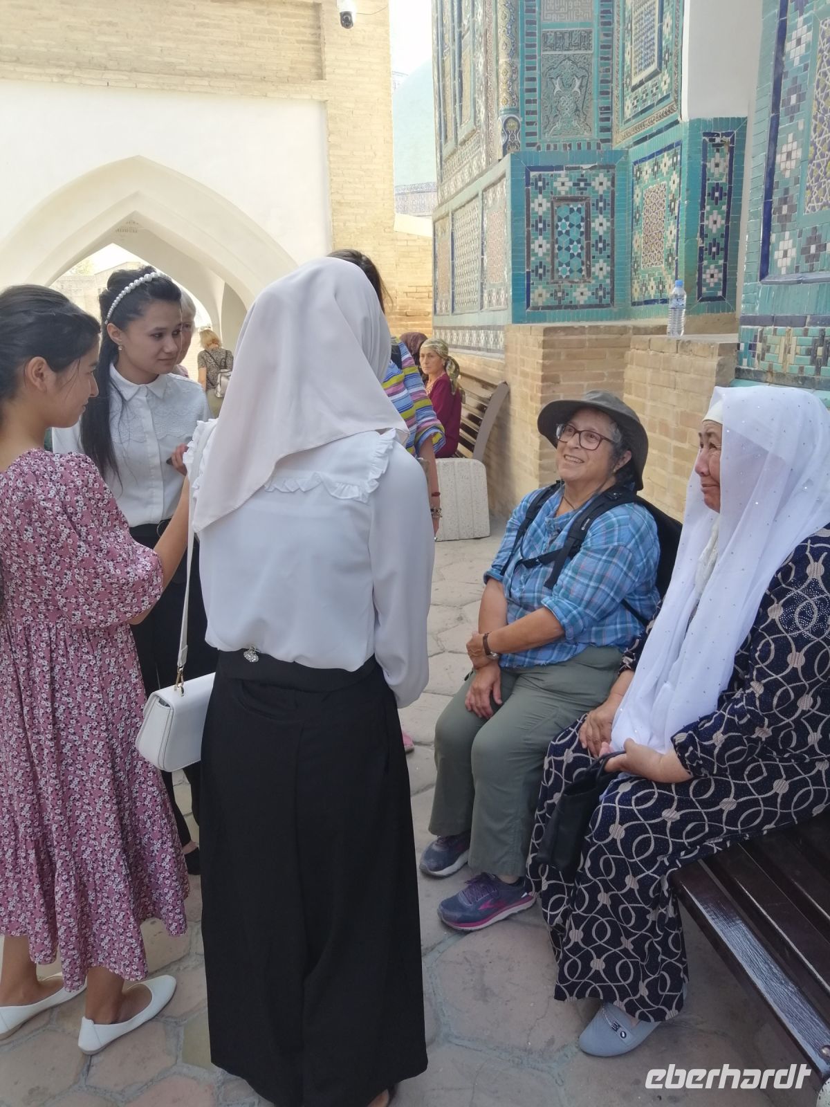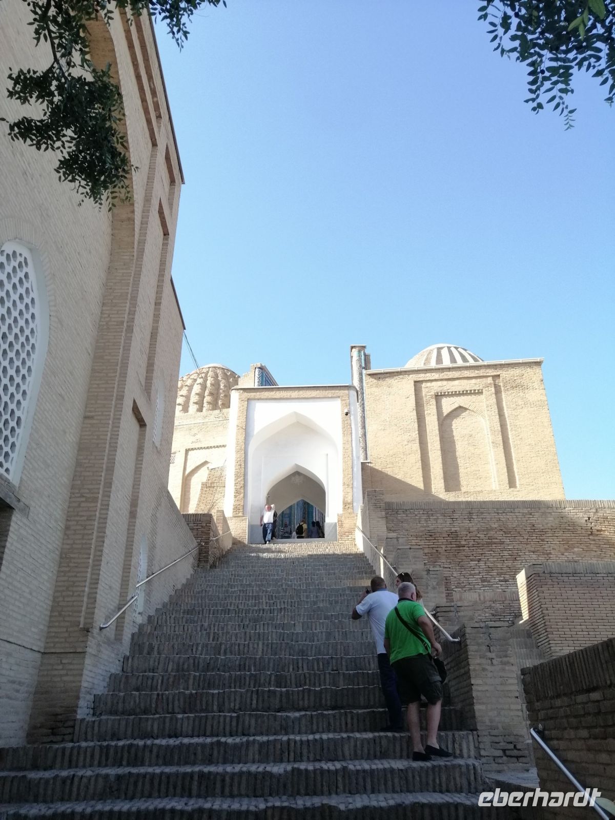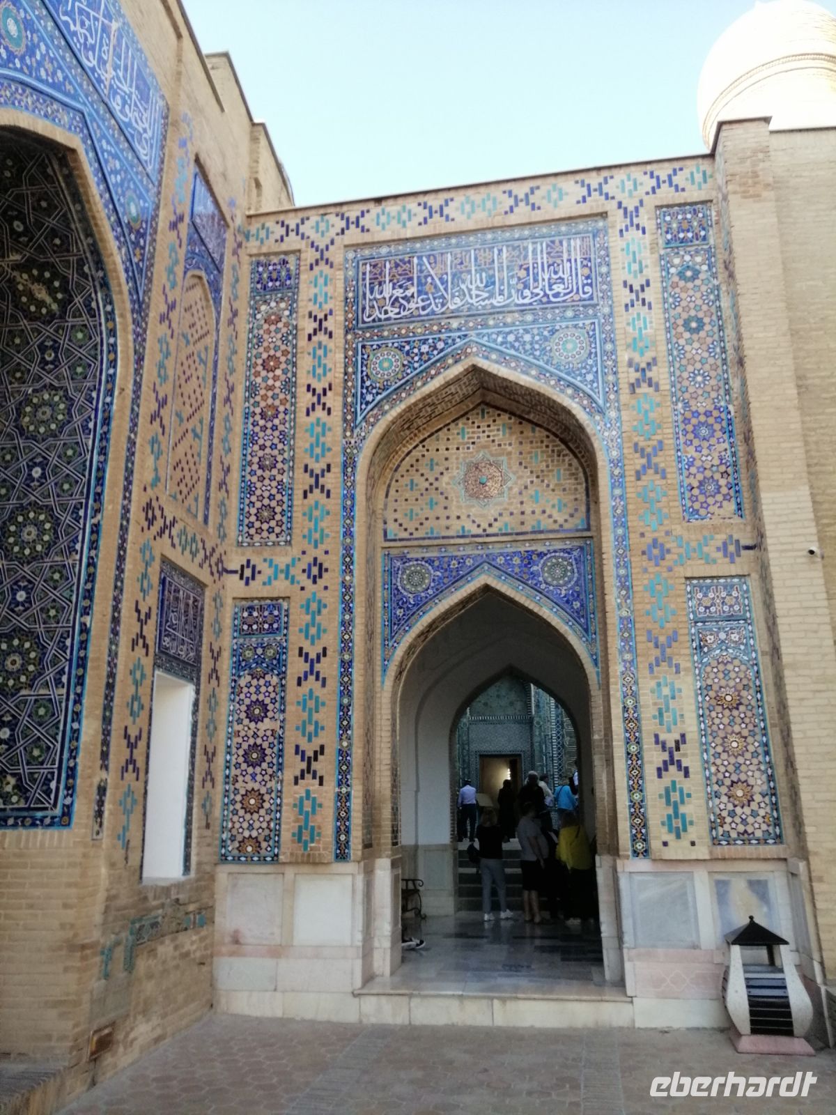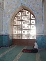 Auf der gegenüber liegenden Seite des historischen Komplexes, besichtigten wir das Ensemble Dor Ut-Tilovat mit Ko´k-Gürbüz-Moschee aus dem Jahr 1435 und gleich neben an zwei Grabstätte: Shayx Shamsiddin Kulol Mausoleum (1373-74) und Gumbazi Saidons Mausoleum (1437). Gulnora erzählte uns, dass die Ko´k-Gürbüz-Moschee die größte Freitagsmoschee in Schachrisabs ist und das hier alle wichtigen Gottesdienste abgehalten wurden. Wir erfuhren auch, dass der Initiator des Baus dieser Moschee uns schon bekannte Mirzo Ulugbek war: ein weltberühmter Astronom, eine Persönlichkeit des öffentlichen Lebens und Enkel des großen Amir Temur. Auf dem Portal des Haupteingangs der Moschee befand sich eine Inschrift, die besagte, dass Ulugbek diese Moschee im Namen seines Vaters - Schachruch - gebaut hat.