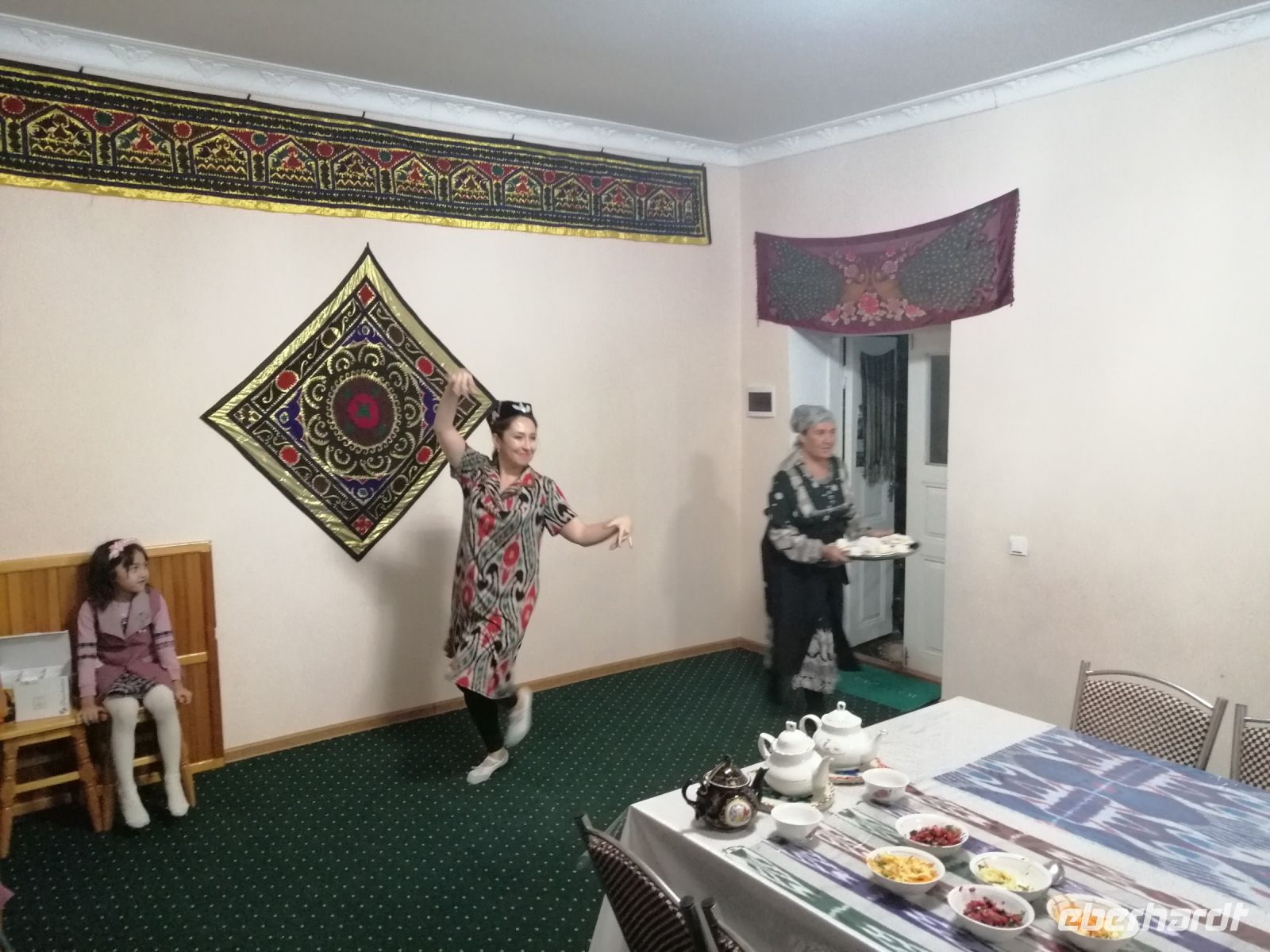 Unseren Abend verbrachten wir bei einer Familie, die uns zeigte, wie eine der Hauptspeisen der usbekischen Küche – der „Plow“ – vorbereitet wird. Zum Abendessen wurde uns allerdings nicht nur Plow, sondern auch Bischak serviert. Außerdem führte uns die Asisa, die Hausfrau der Familie, die einheimische Tänze vor.