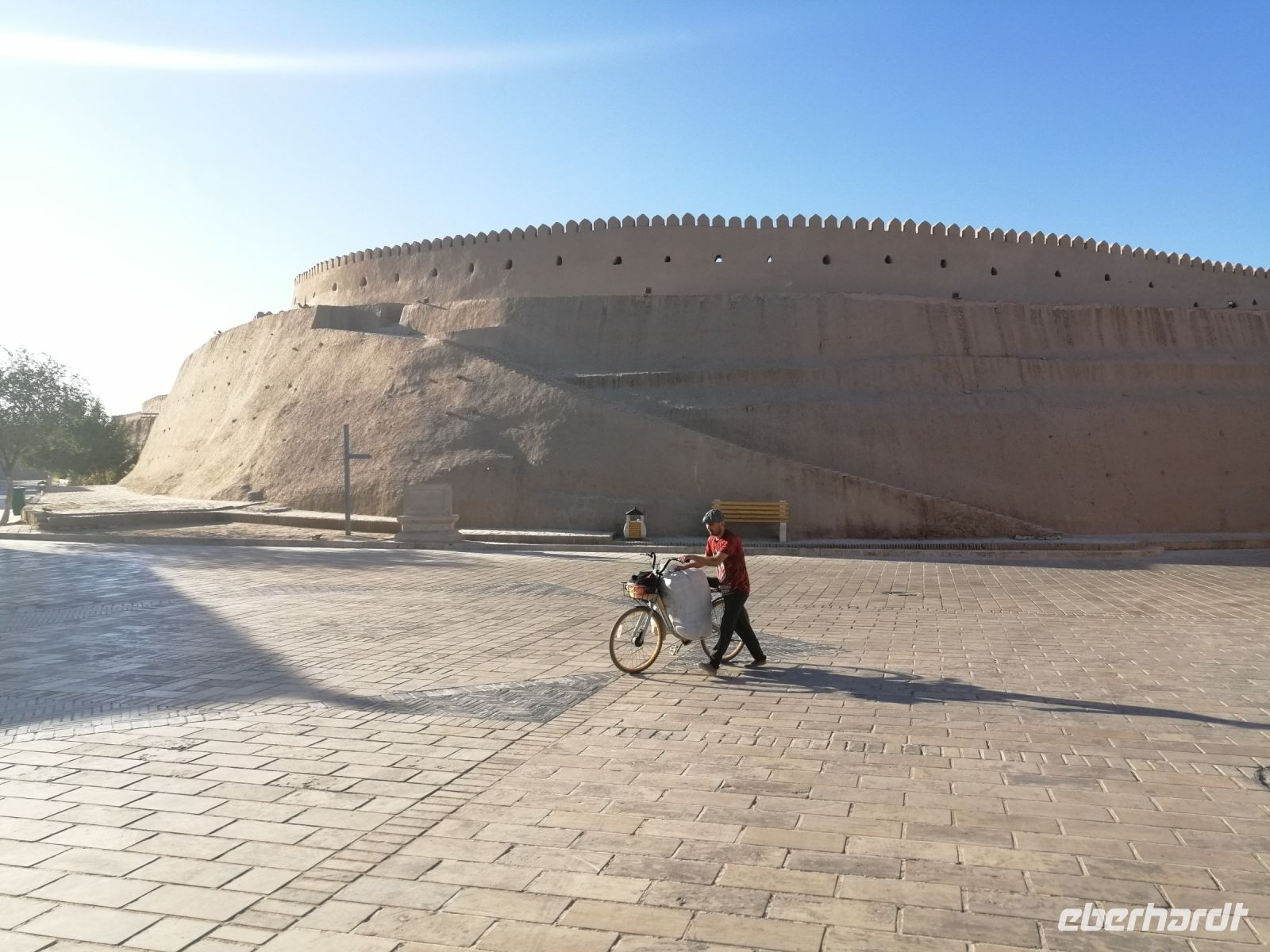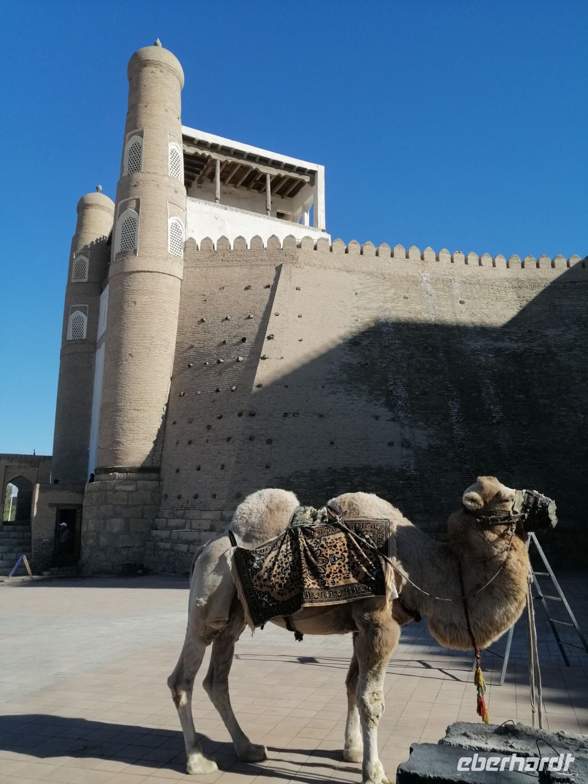 Unser Hotel in Buchara befand sich direkt gegenüber der Ark-Zitadelle und so starteten wir gegen 9 Uhr die Besichtigung dieser Burganlage. Die Zitadelle befand sich auf einem ca. 20 Meter hohen Hügel. Gulnora erzählte uns, dass zu Beginn des 20. Jahrhunderts die Zitadelle „Ark“ eine „Stadt in der Stadt“ war und dass im Inneren der Festung sich der Palast des Emirs, sowie die Palastdienste und Häuser hochrangiger Beamter und Militärführer befanden. Mehr als dreitausend Menschen lebten damals auf dem Gebiet von Zitadelle „Ark“.