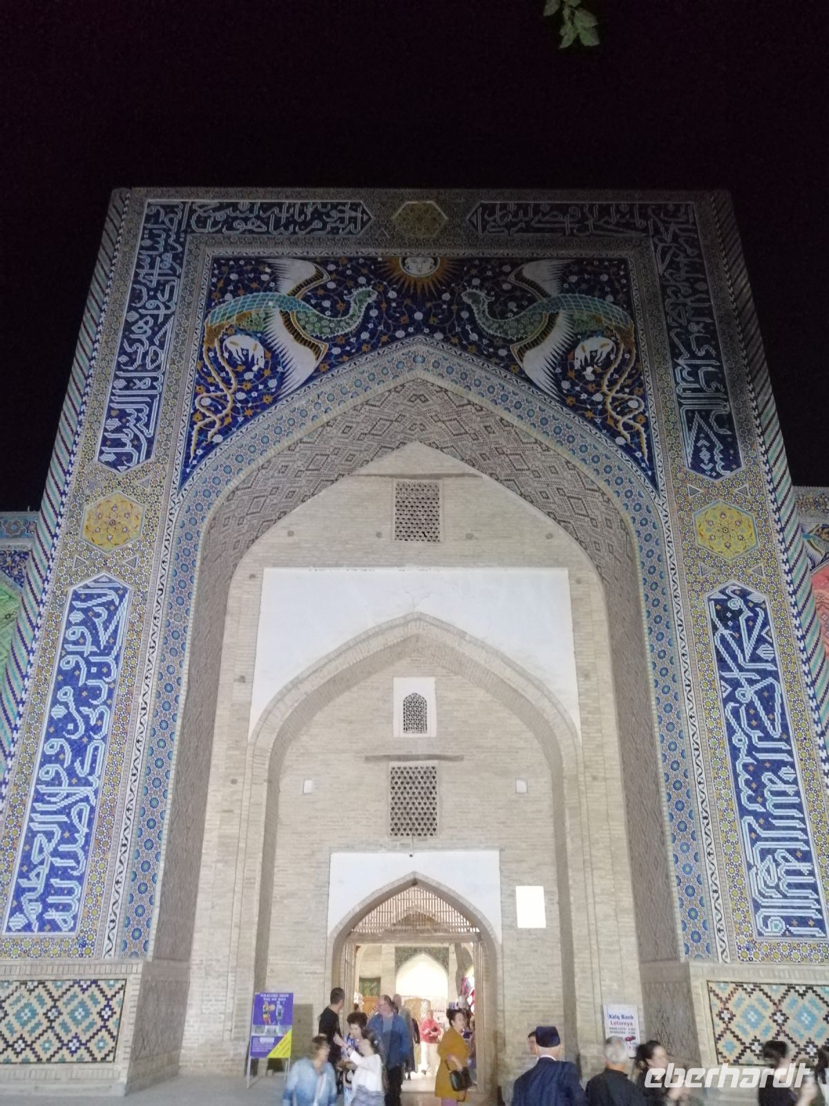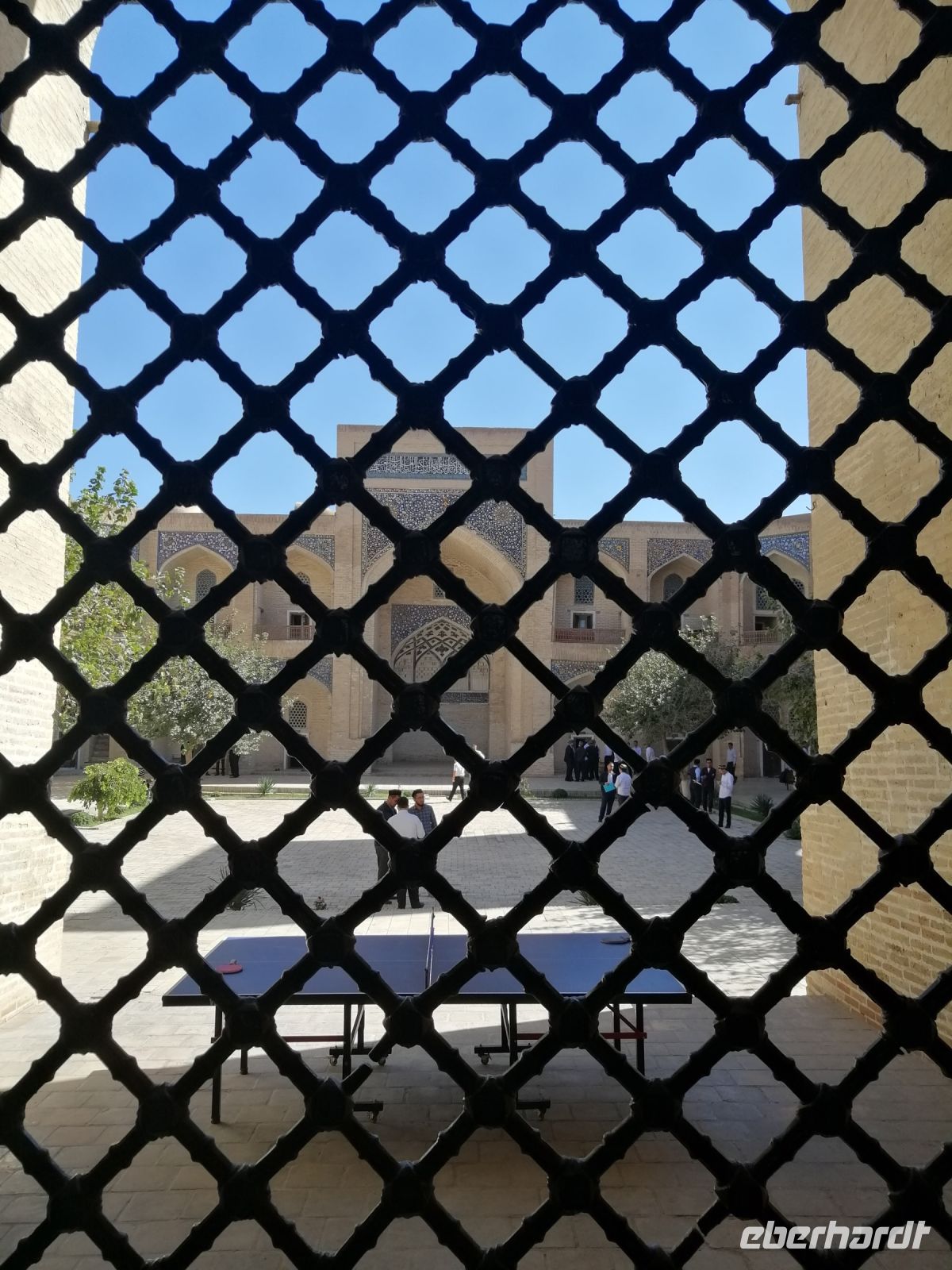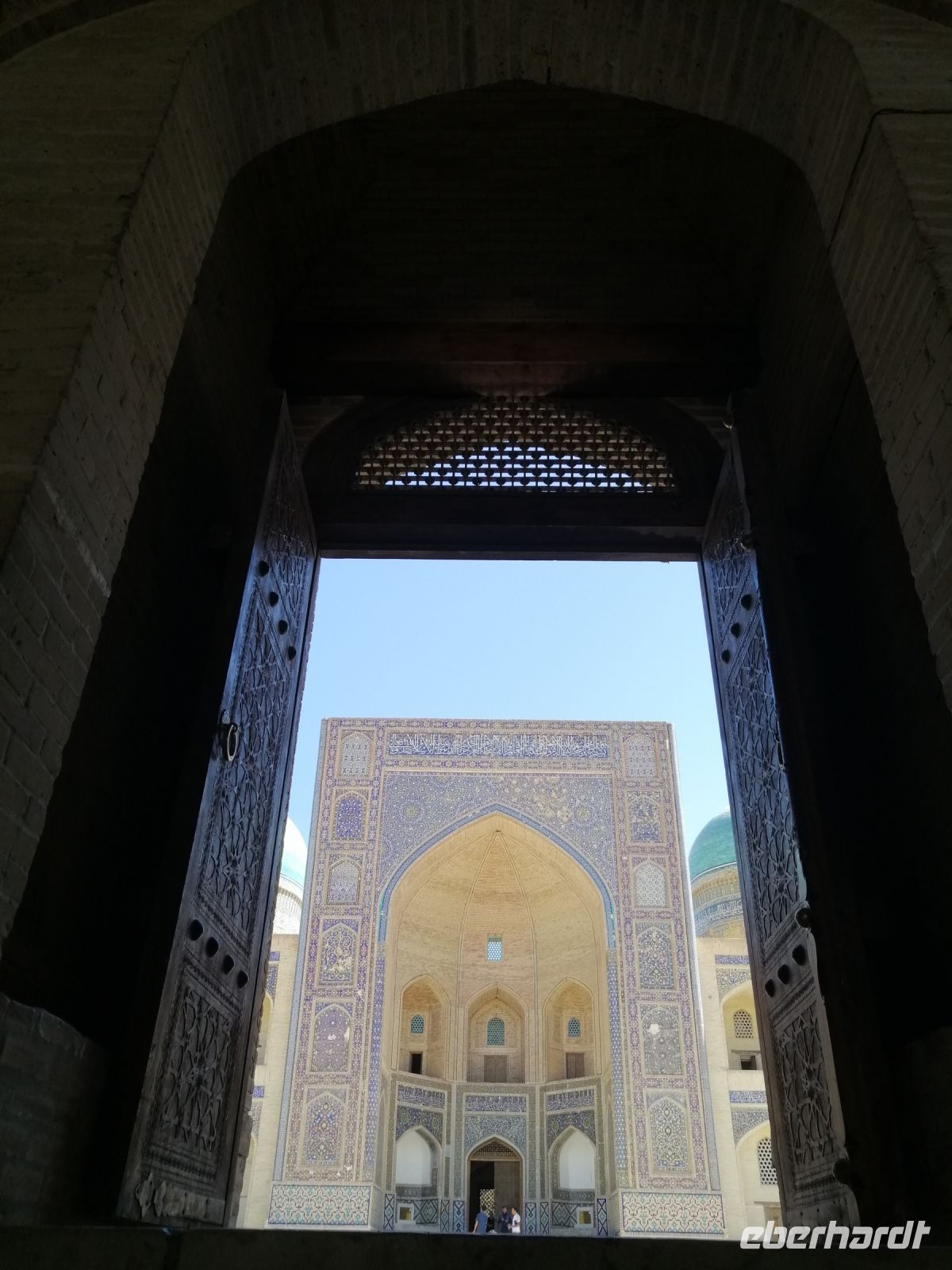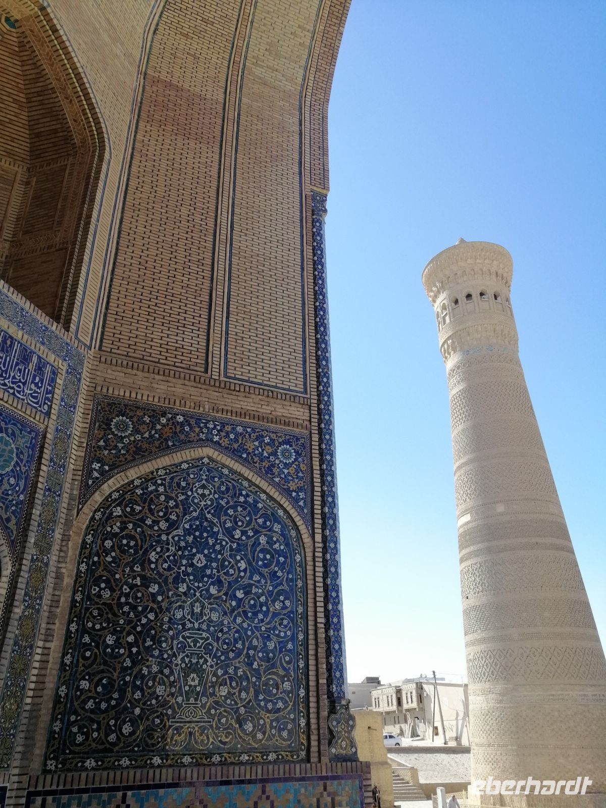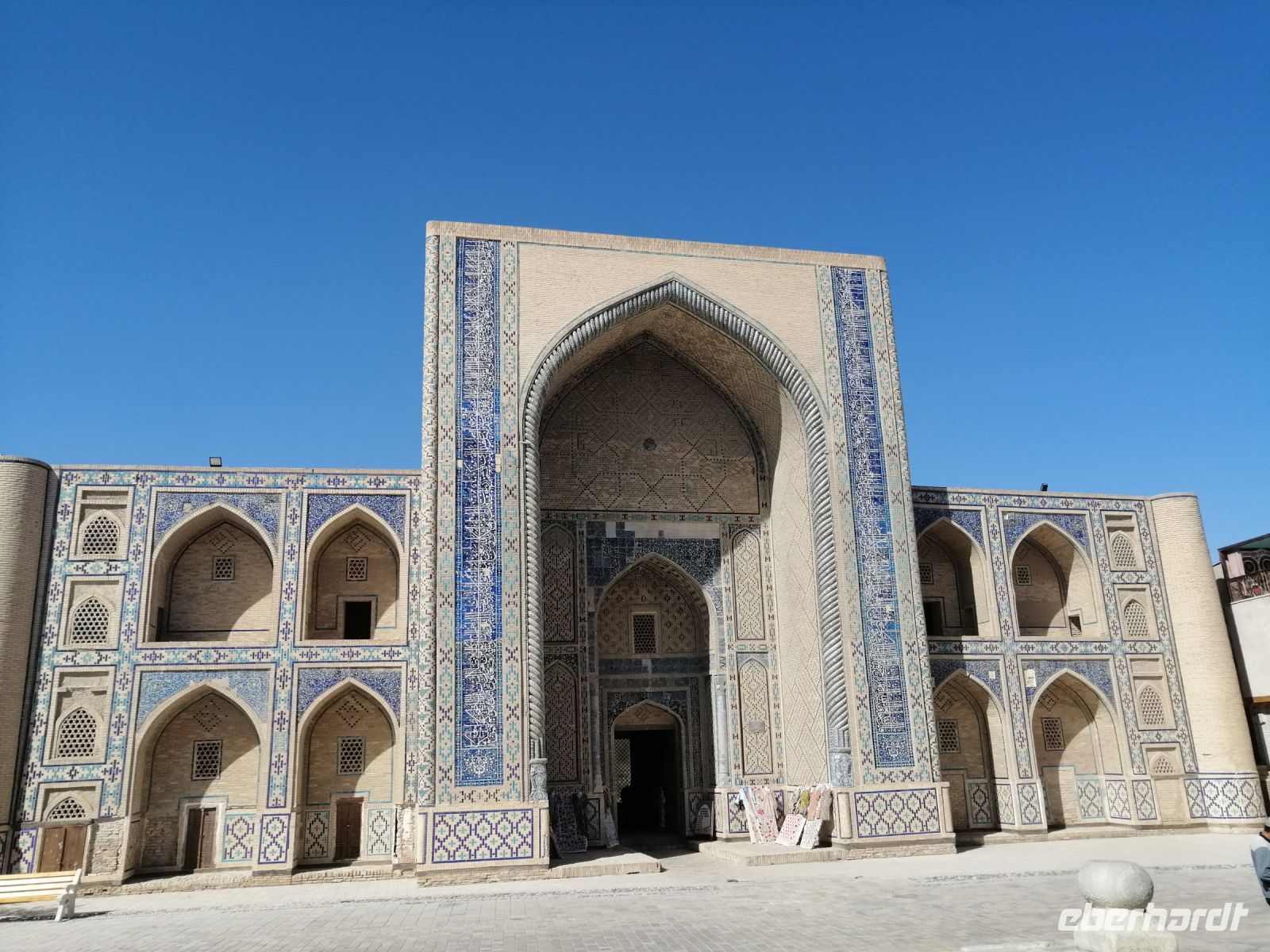 Unsere weitere Stadterkundung führte uns zum architektonischen Ensemble Poi-Kalon, wo wir uns die Mir-Arab-Medresse und die Kalon Moschee angeschaut haben. Die Mir-Arab-Medresse hat auch heute noch die Funktion einer islamischen Hochschule. Von Gulnora erfuhren wir, dass diese Medresse in den Jahren 1535 und 1536 von dem aus dem Jemen eingewanderten, einflussreichen Scheich Abdullah Yamani errichtet wurde. Der Name Mir-Arab bedeutet übersetzt „Der Prinz der Araber“ und bezieht sich auch auf Scheich Abdullah Yamani. Sie ist eine der berühmtesten Medresen Usbekistans und die zweitgrößte Medrese Bucharas. Gulnora informierte uns außerdem über die Details des Studiums: um zum Studium aufgenommen zu werden, müssen die obligatorischen neun Schuljahre abgeschlossen werden. Zudem müssen die Kandidaten eine Aufnahmeprüfung bestehen. Pro Jahr werden nur 24 Bewerber aufgenommen. Neben religiösen Fächern umfasst der Unterricht auch alle weltlichen Fächer. Die Ausbildung dauert vier Jahre. Ein bekannter Student der Medrese war der ehemalige Präsident der russischen Republik Tschetschenien, Achmat Kadyrow. Er studierte von 1980 bis 1982 in der Mir-Arab-Medrese und setzte sein Studium danach bis 1986 am Islamischen Institut in Taschkent fort. Heute ist sein Sohn Ramsan Kadyow Präsident von Tschetschenien.