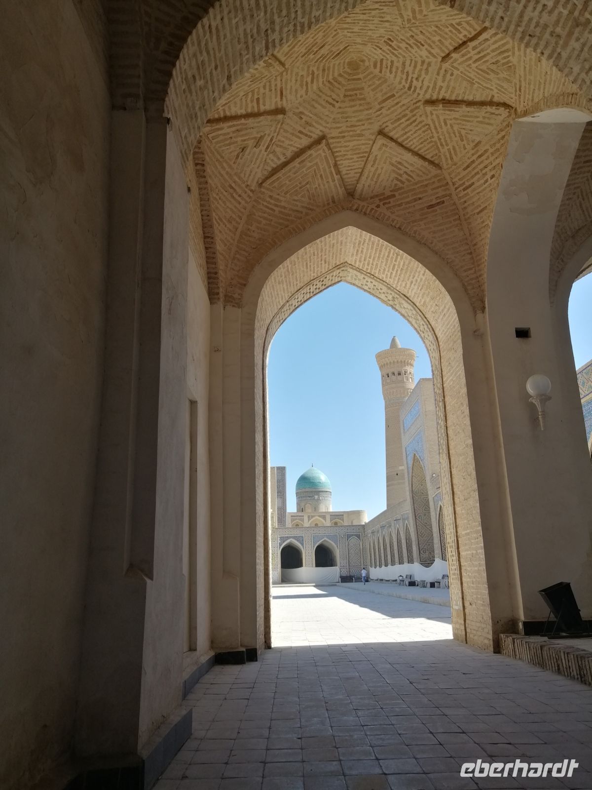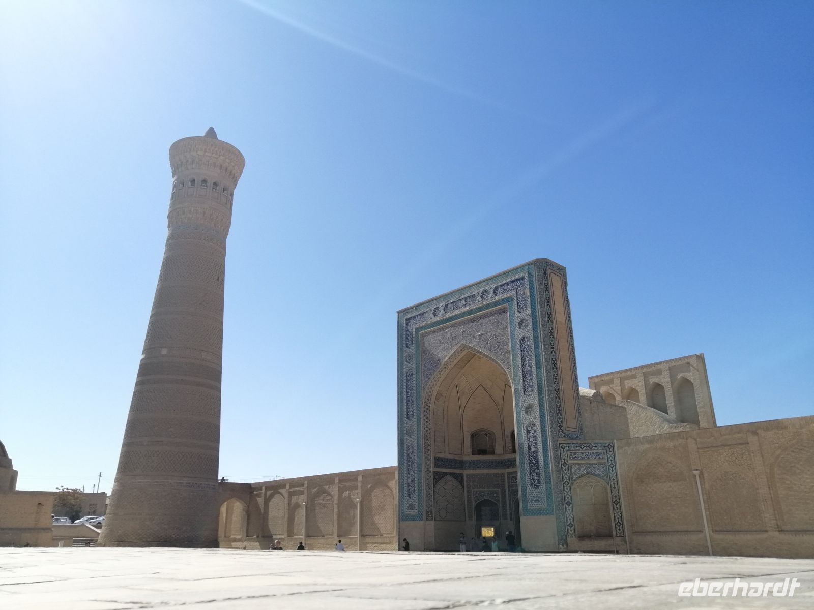 Anschließend, gleich gegenüber, besichtigten wir die Kalon-Moschee - die größte Moschee Bucharas und die zweitgrößte Moschee Zentralasiens (nach der Bibi Khanum-Moschee in Samarkand). Die Kalon-Moschee kann bis zu 10.000 Menschen aufnehmen. Hier informierte uns Gulnora was das Kosch-Prinzip bedeutet: in der klassischen zentralasiatischen Architektur werden die Fassaden wichtiger Gebäude einander im Kosch-Prinzip gegenübergestellt. Die Kalon- Moschee und die Mir-Arab-Medrese bilden ein wunderschönes Beispiel für dieses Prinzip.