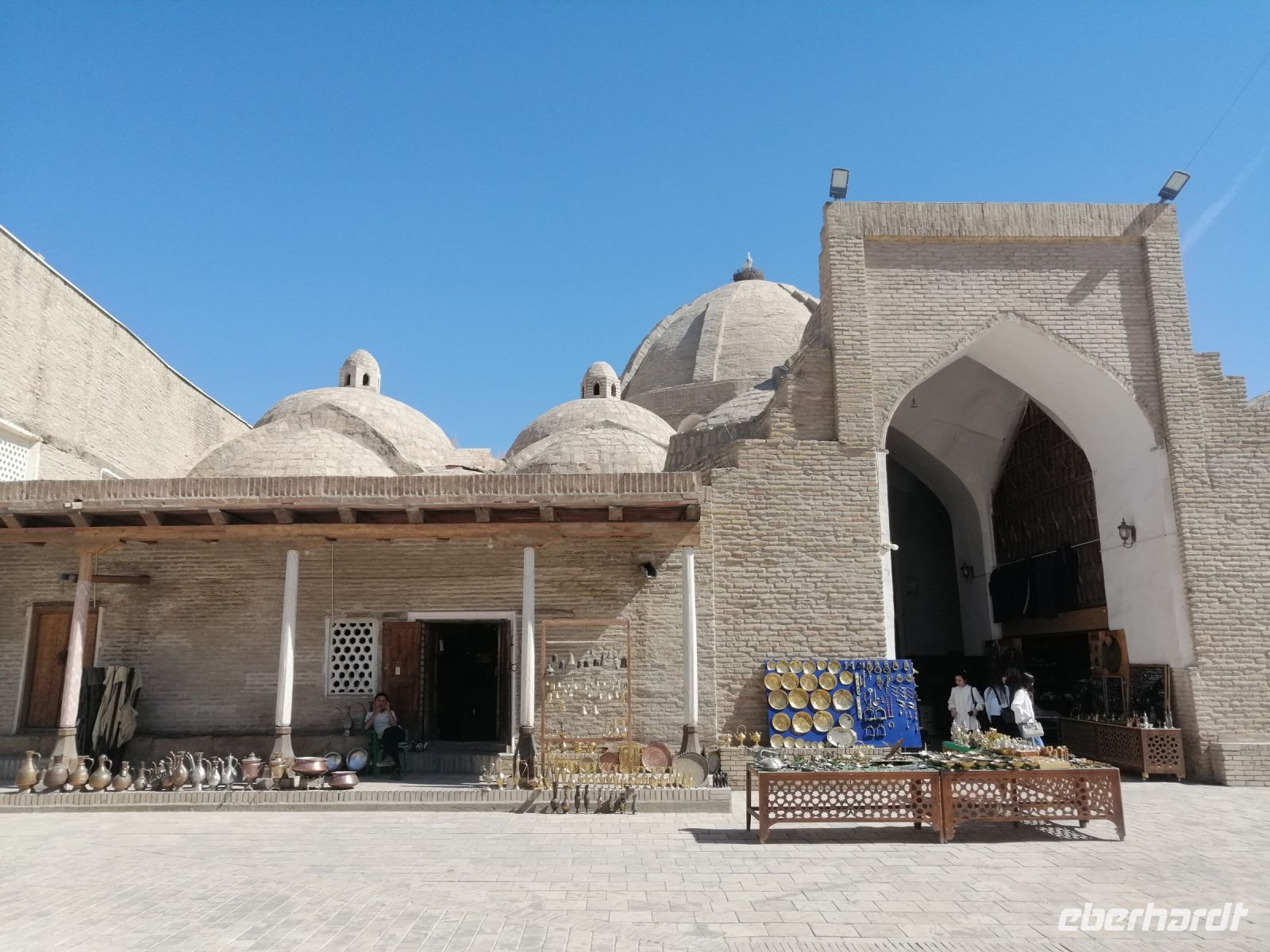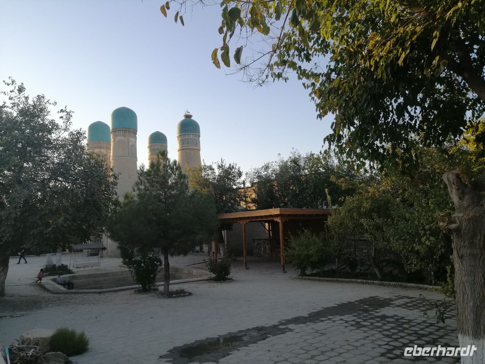 Nach der Freizeit, die jeder individuell nutzte, trafen wir uns gegen 17:30 Uhr in der Hotel-Lobby und fuhren mit unserem Reisebus zum Labi-Platz, ins Zentrum der Stadt. Wir spazierten durch die kleinen Gassen von Buchara zur Chor-Minor-Moschee – einem Wahrzeichen Bucharas. Die vier Minarette (Chor: vier, Minor: Minarett) symbolisieren die vier Seiten der Welt. Durch ihre Bauweise weicht die Chor-Minor-Moschee vom traditionellen Baustil ab und orientiert sich ein bisschen am indischen Taj Mahal.