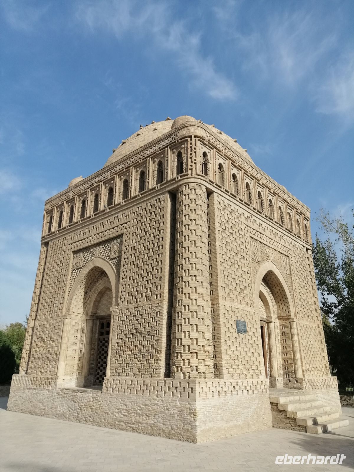 Bevor wir uns heute von Buchara verabschiedeten und unsere Fahrt nach Chiwa starteten, besichtigten wir noch zwei bedeutende Sehenswürdigkeiten der berühmten Stadt an der Seidenstraße. Zuerst schauten wir uns die Freitagsmoschee Bolo-Hauz mit ihrem kleinen Minarett, die sich in der Nähe unseres Hotels, gegenüber der Festung Ark befand. Eine der Besonderheiten dieser Moschee ist das Wasserbecken direkt davor, welches früher zur Wasserversorgung der Bevölkerung diente und bereits den Namen Bolo-Hauz – „Wasserbecken der Kinder“ trug. Anschließend besichtigten wir das Samaniden-Mausoleum. Gulnora informierte uns über die Samaniden-Dynastie und die architektonische Besonderheiten des Gebäudes, das hauptsächlich aus Backsteinen besteht und eine quadratische Form hat. Die vier Ecken des Mausoleums sind mit Säulen verziert, die fast vollständig ungeschmückt sind. Auf den gleichen Säulen ruht die Arkade, die auf jeder Seite zehn Bögen umfasst. An den Ecken des Daches befinden sich kleine Kuppeln, die leicht zur Mitte der Säulen verschoben sind. In der Mitte des Daches des Mausoleums befindet sich die Hauptkuppel.