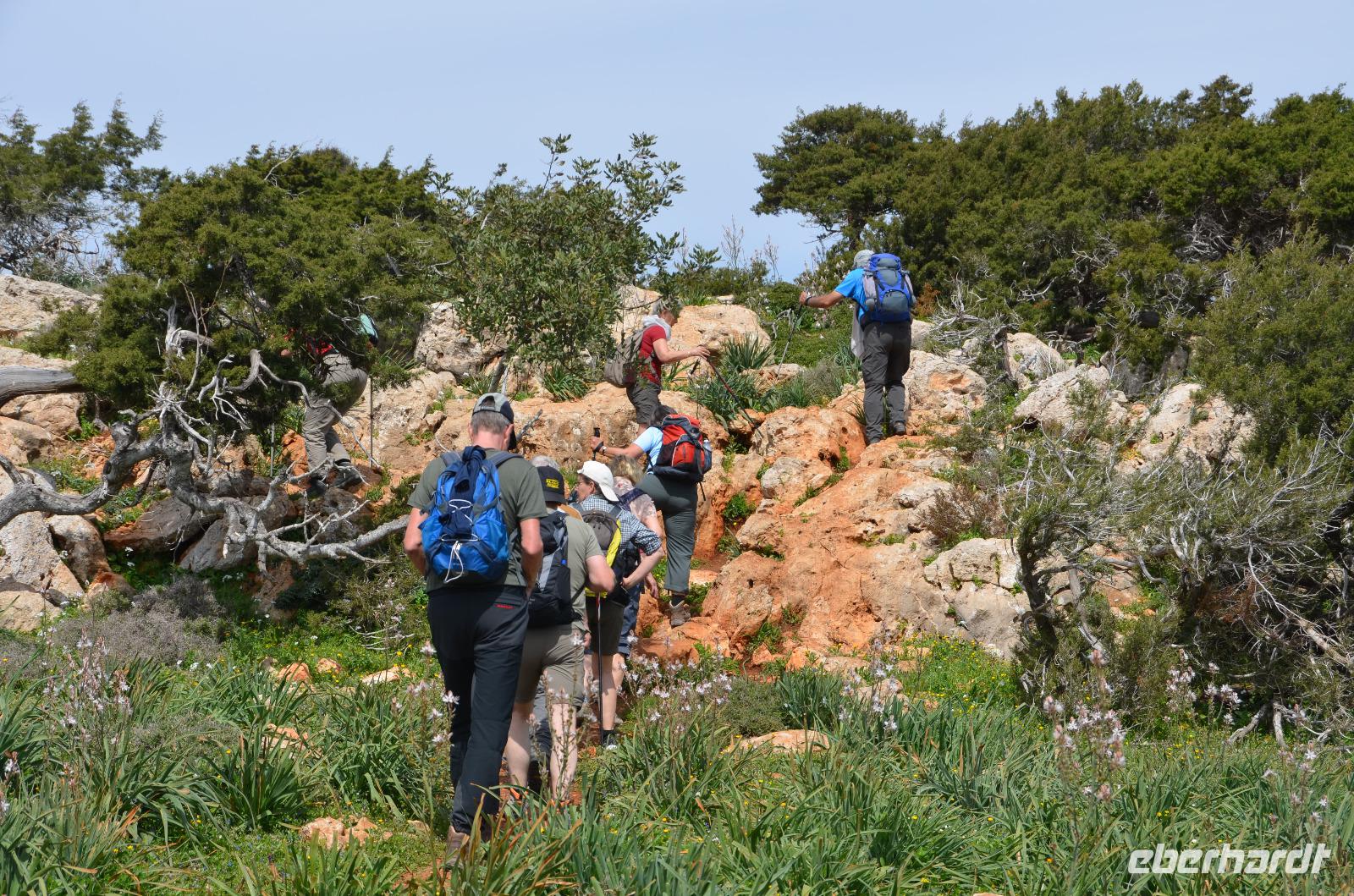 Im 5-Finger-Gebirge angekommen, führte uns die Wanderung zunächst über ebenes Gelände. Fasziniert von der Vegetation entdeckten wir viele kleine Orchideen, sowie andere bunt blühende Pflanzen. Auch heute hatten wir wieder einige schöne Aussichten auf die vielfältige Landschaft Zyperns. Außerdem kamen wir auch an einigen Ruinen, wie einem alten Gehöft vorbei. Durch die zahlreichen Blumen bemerkte man kaum den allmählichen Anstieg. Kurz vor der Rast wurde es doch noch einmal etwas anstrengender, jedoch wurden wir mit einem traumhaften Blick über das Meer belohnt. Die Sonne glitzerte im hellblauen Wasser und erst jetzt wurde uns bewusst, wie weit oben wir uns doch wieder befanden.