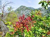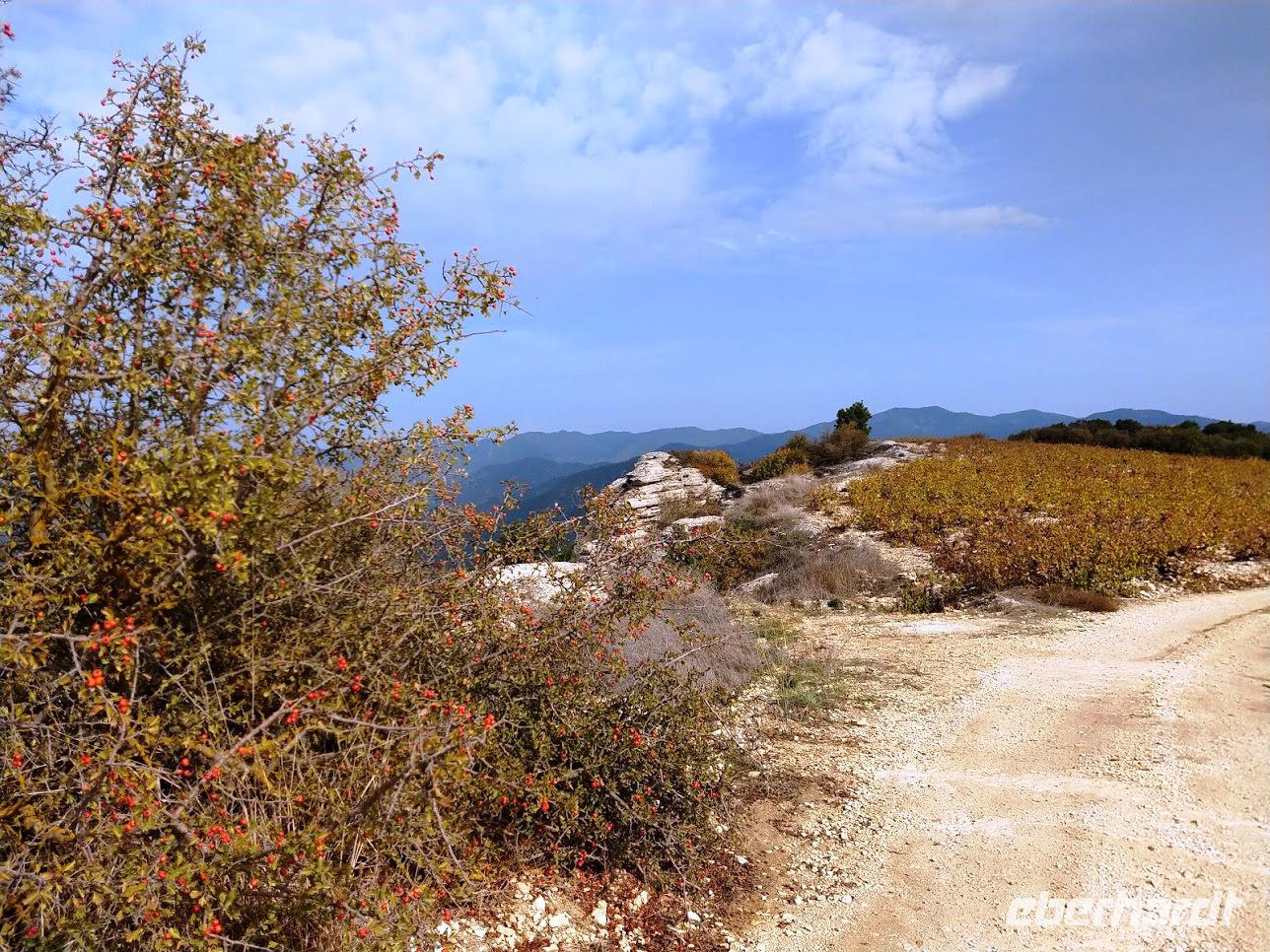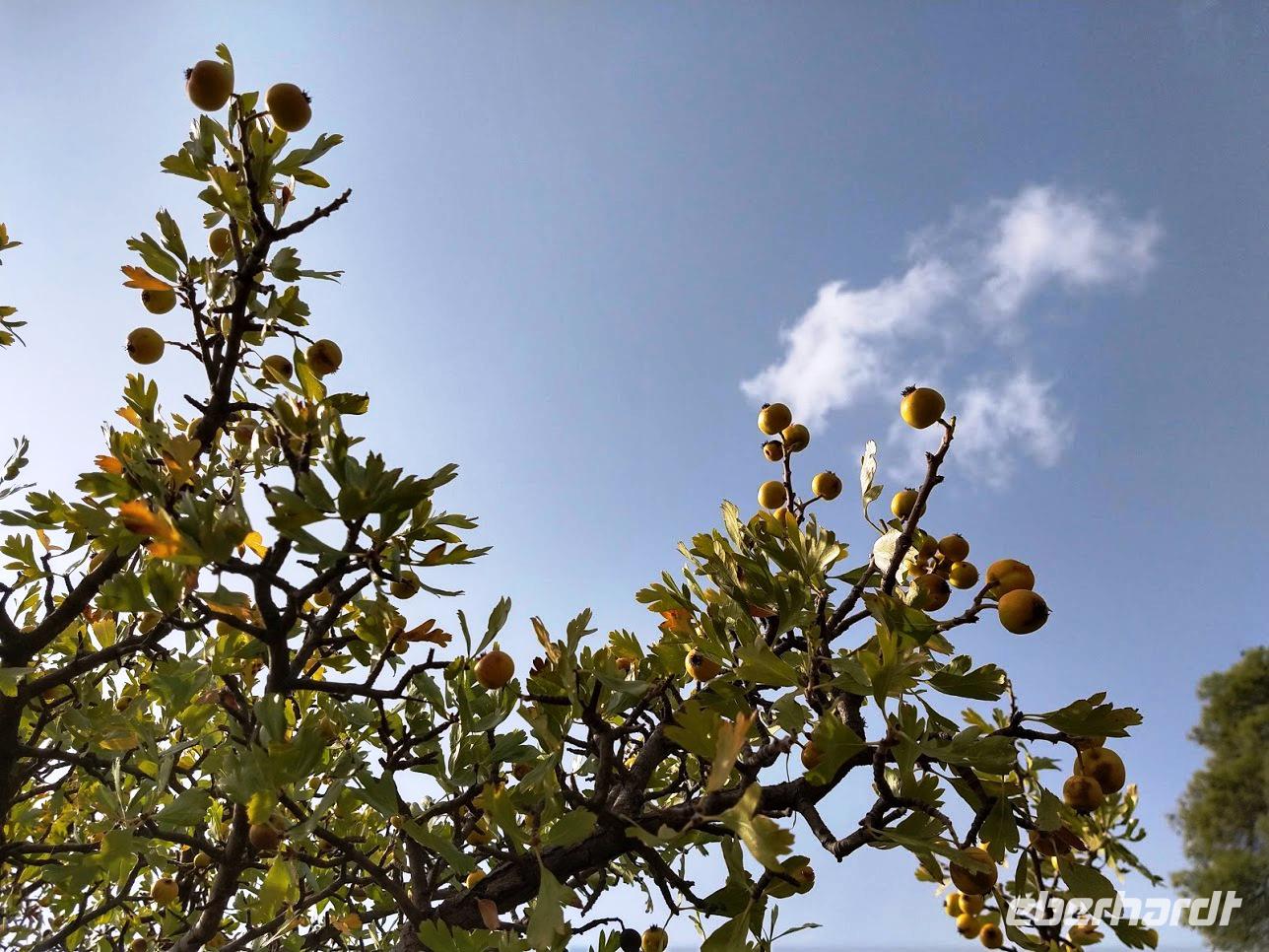 Am Wegesrand empfahl uns Dimitris Kostproben von Weinreben und den Weißdornbäumen am Wegesrand.