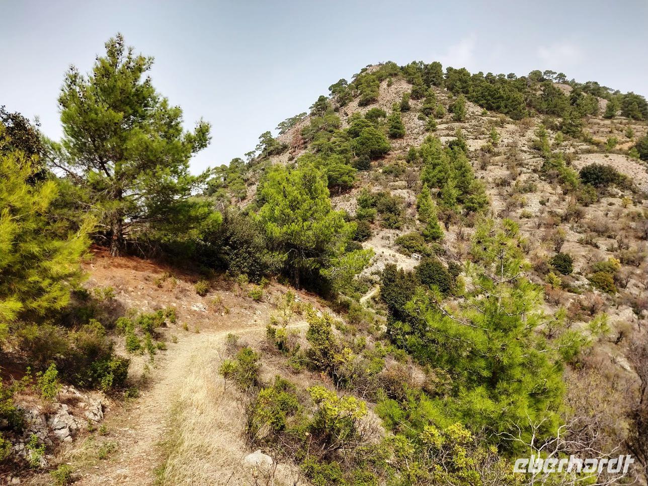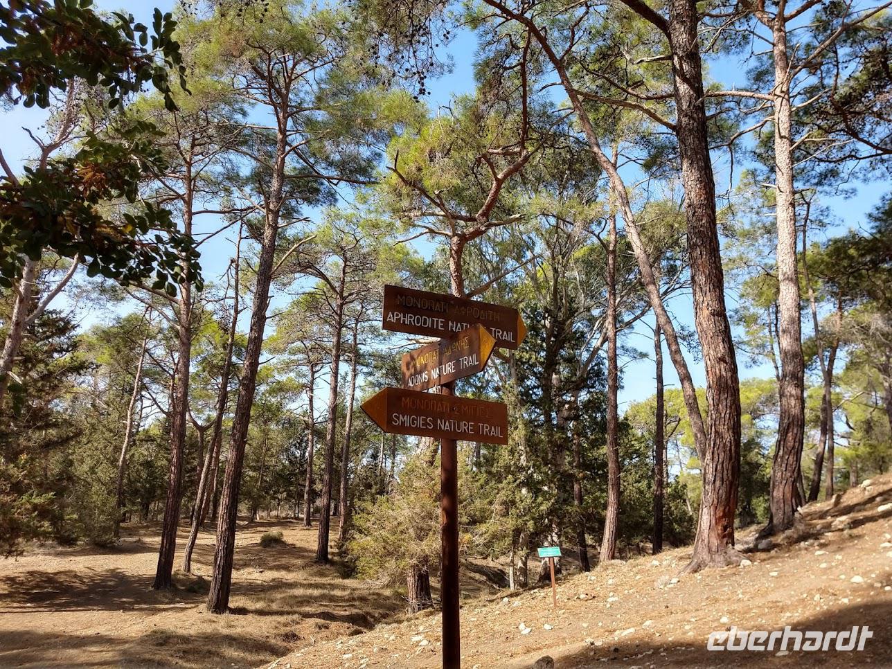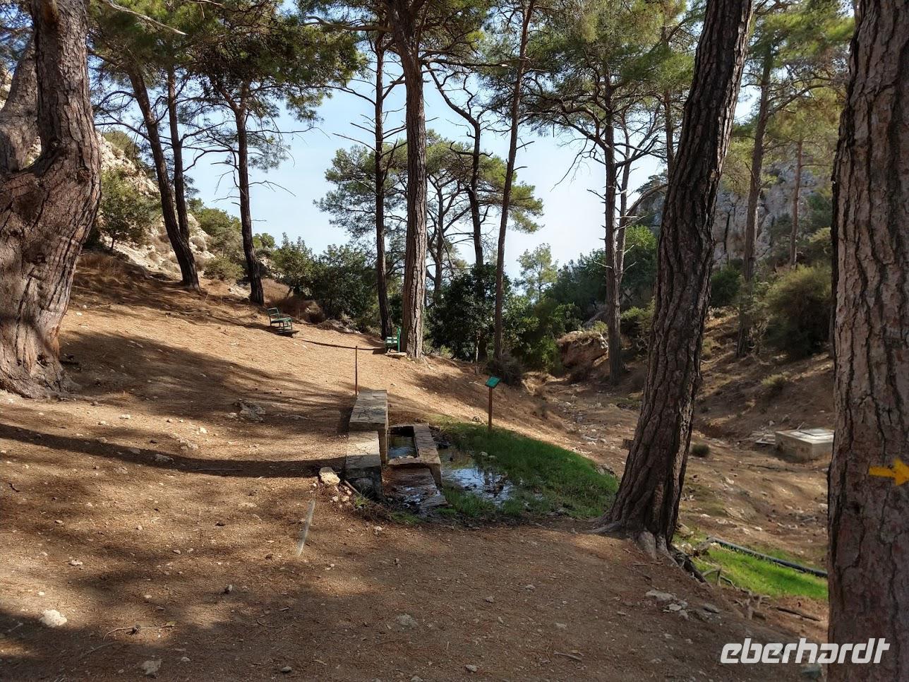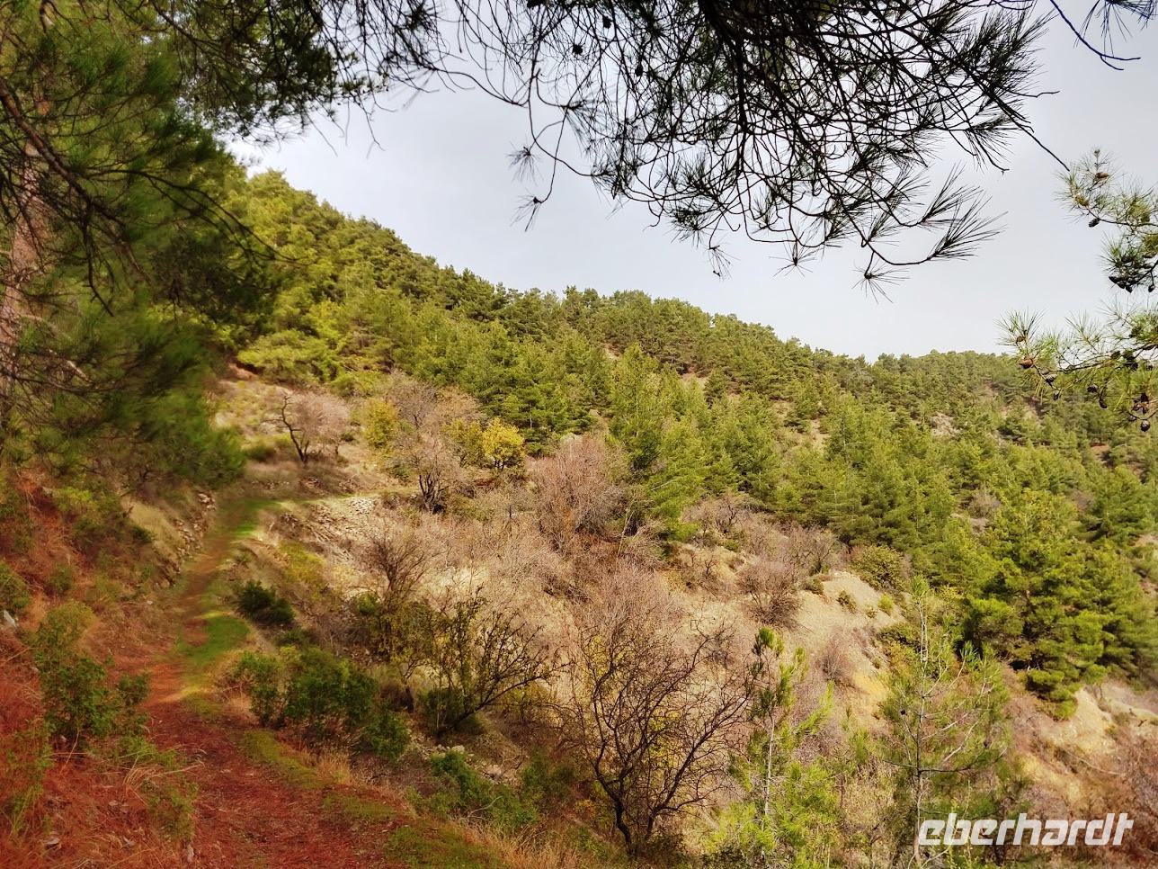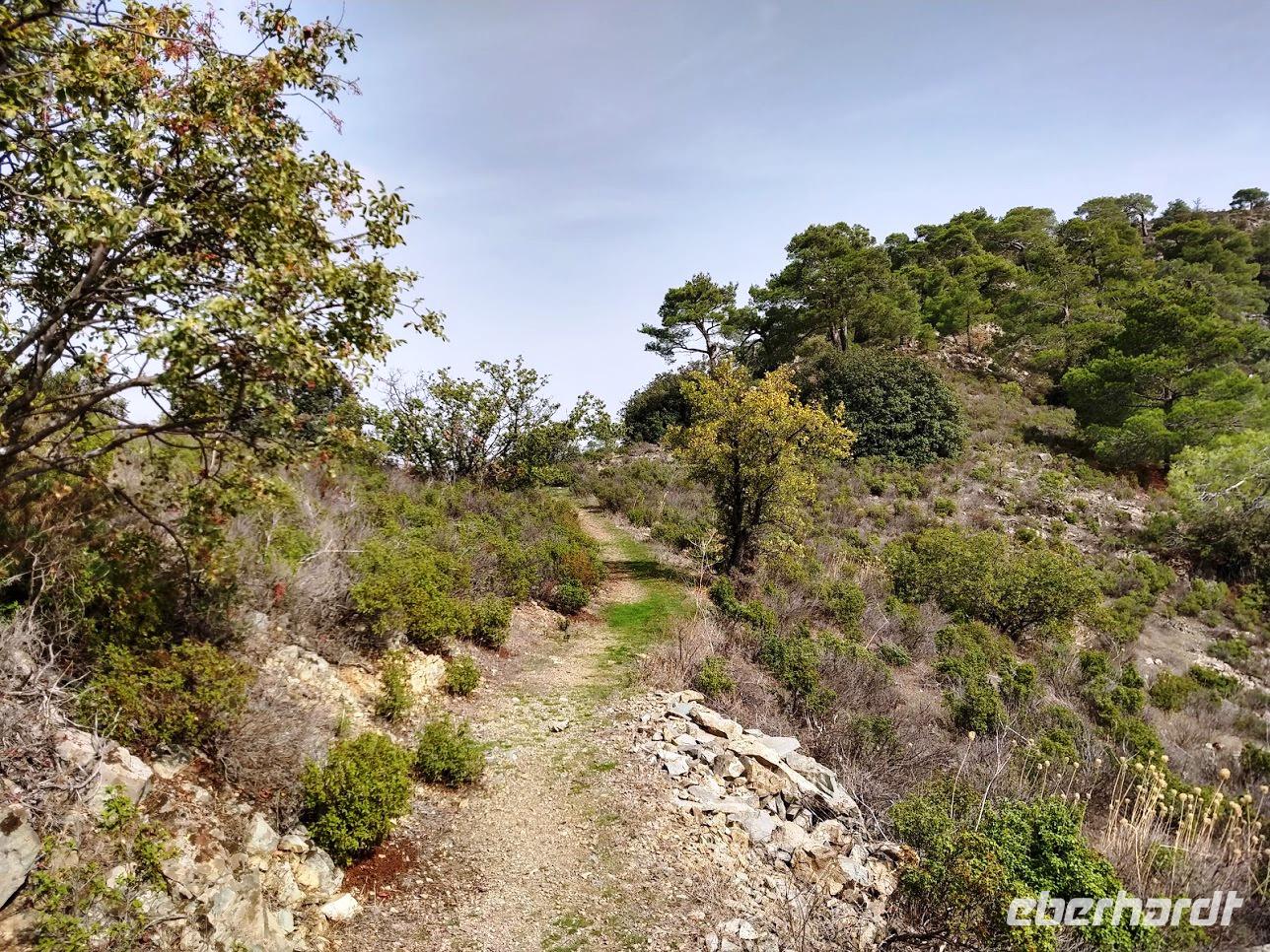 Hier begegnen wir wieder dem Europäischen Fernwanderweg E4, dem unsere Routen schon öfters folgten und der hier als Adonis-Trail fortgeführt wird. Der Liebhaber von Aphrodite soll ein schöner Jüngling gewesen sein und auch der Weg ist schön, zuerst ein leichter Anstieg bis auf den Höhenrücken und zur schön im Pinienwald gelegenen Quelle. Hier trifft er auf den Aphrodite-Weg, der weiter zur Klosterruine Pyrgos tis Rigainas und zu weiteren sehr schönen Aussichten führt.