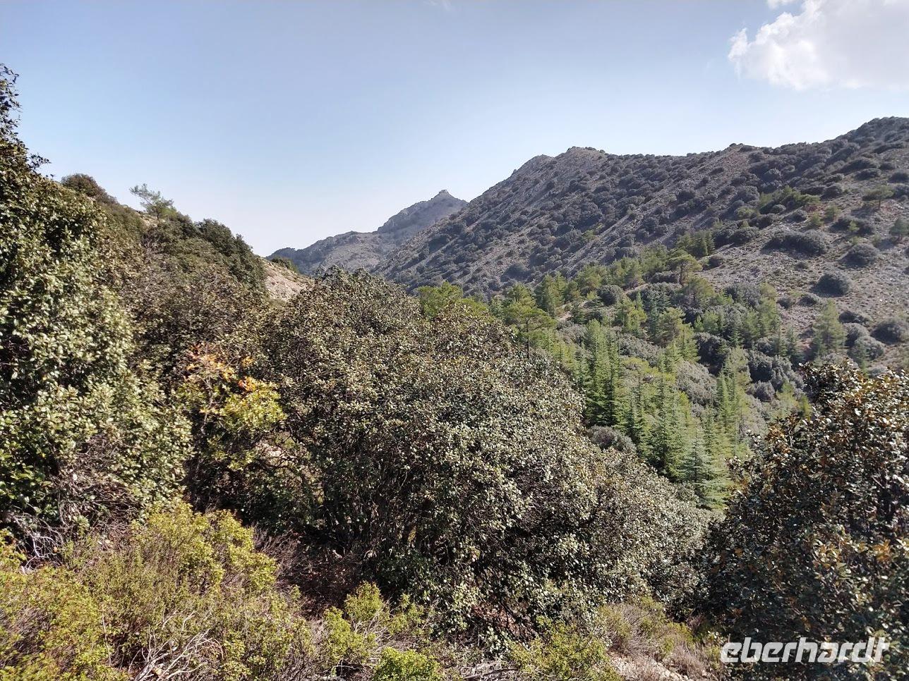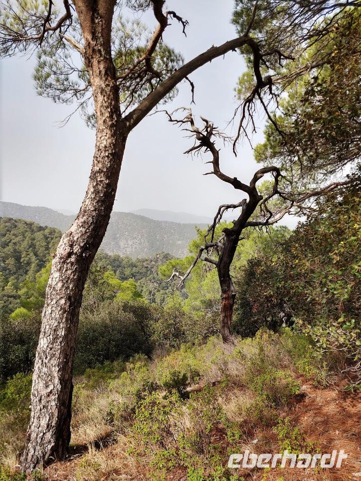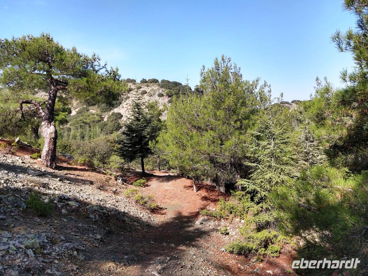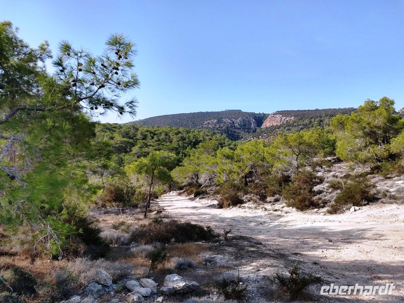 Hier begegnen wir wieder dem Europäischen Fernwanderweg E4, dem unsere Routen schon öfters folgten und der hier als Adonis-Trail fortgeführt wird. Der Liebhaber von Aphrodite soll ein schöner Jüngling gewesen sein und auch der Weg ist schön, zuerst ein leichter Anstieg bis auf den Höhenrücken und zur schön im Pinienwald gelegenen Quelle. Hier trifft er auf den Aphrodite-Weg, der weiter zur Klosterruine Pyrgos tis Rigainas und zu weiteren sehr schönen Aussichten führt.