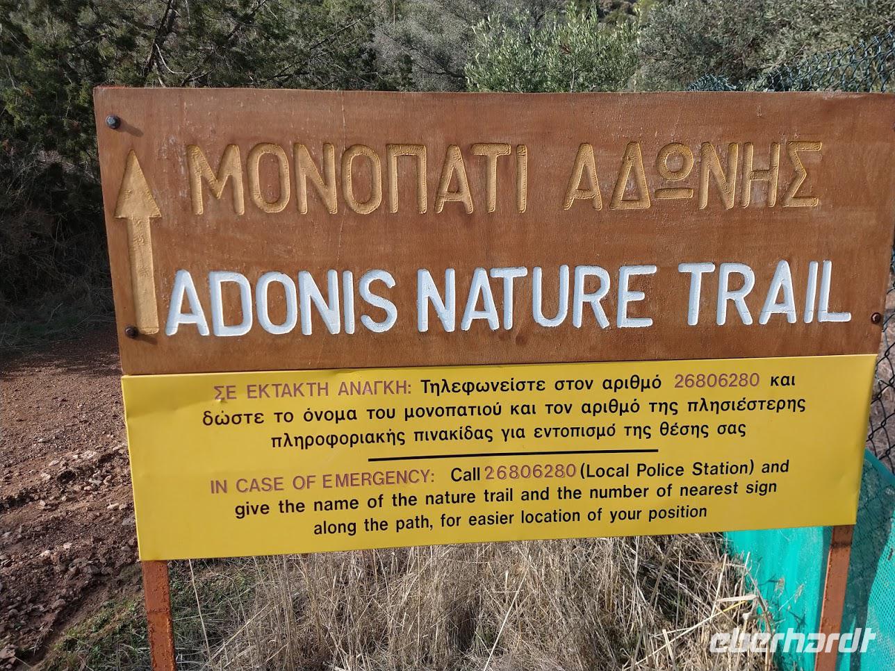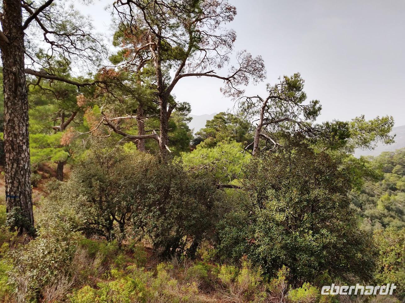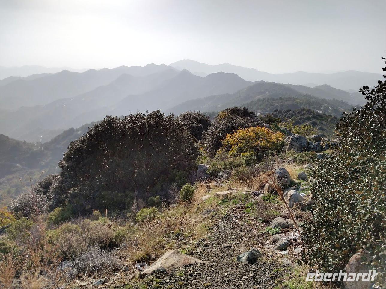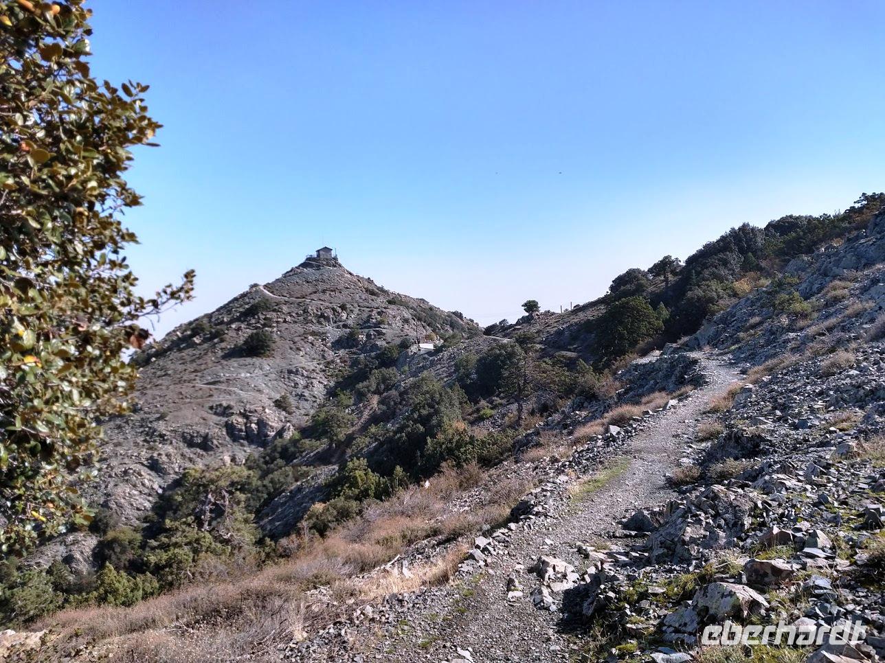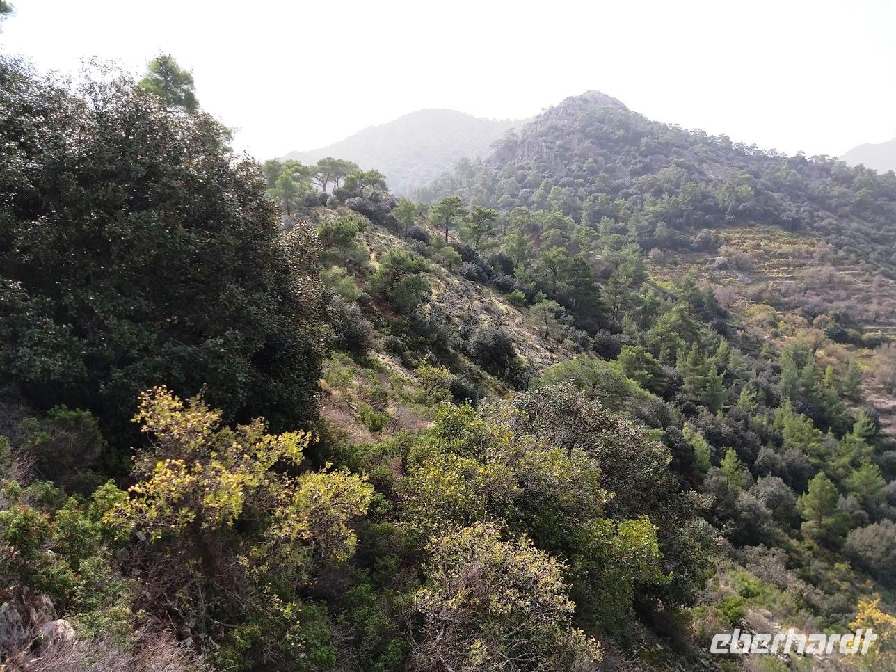 Hier begegnen wir wieder dem Europäischen Fernwanderweg E4, dem unsere Routen schon öfters folgten und der hier als Adonis-Trail fortgeführt wird. Der Liebhaber von Aphrodite soll ein schöner Jüngling gewesen sein und auch der Weg ist schön, zuerst ein leichter Anstieg bis auf den Höhenrücken und zur schön im Pinienwald gelegenen Quelle. Hier trifft er auf den Aphrodite-Weg, der weiter zur Klosterruine Pyrgos tis Rigainas und zu weiteren sehr schönen Aussichten führt.