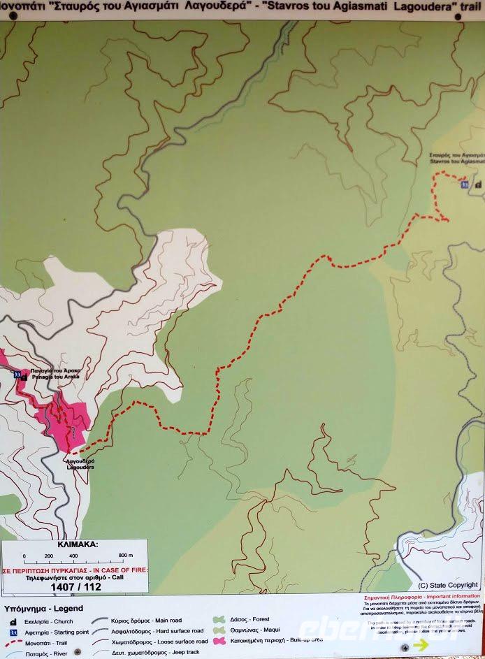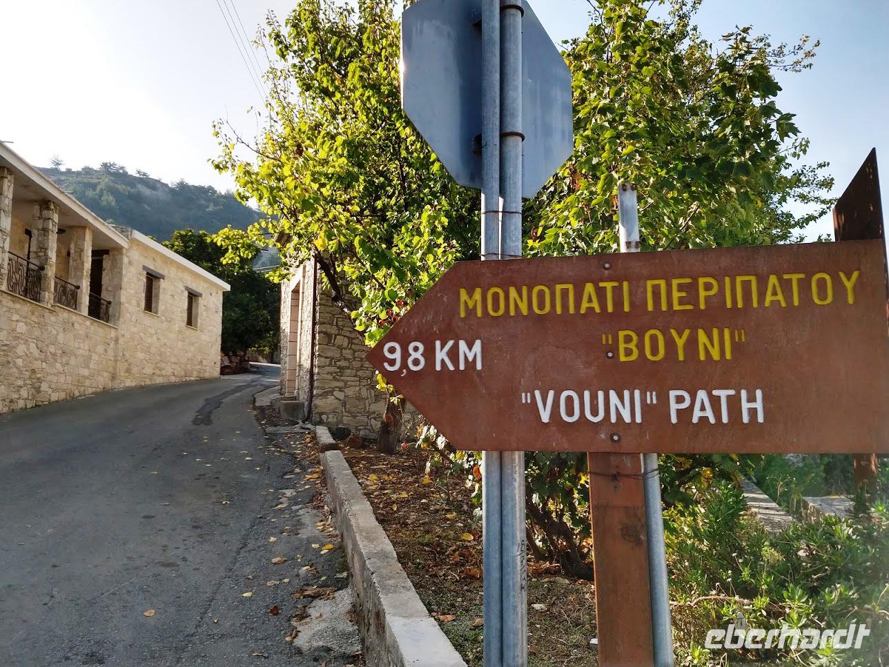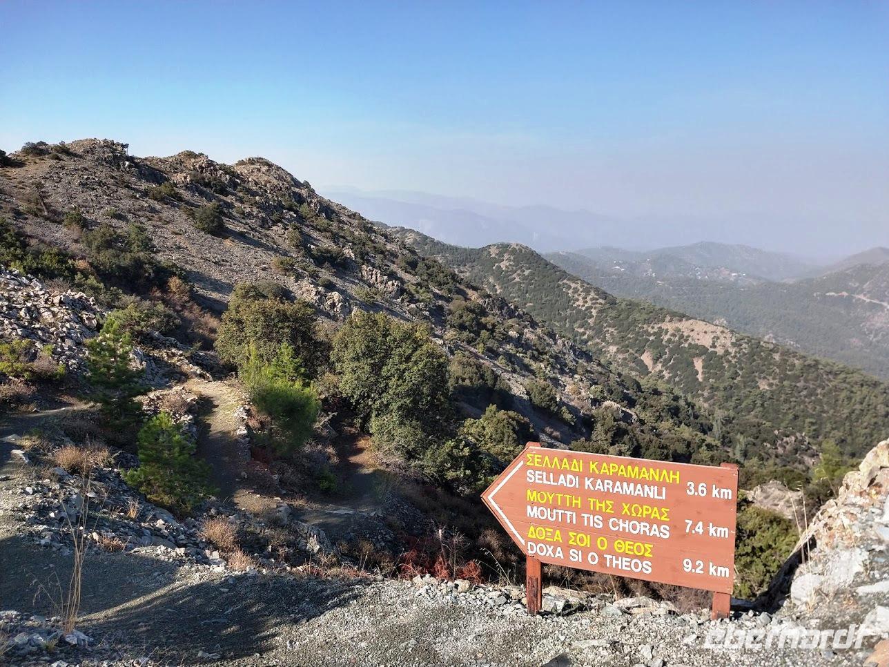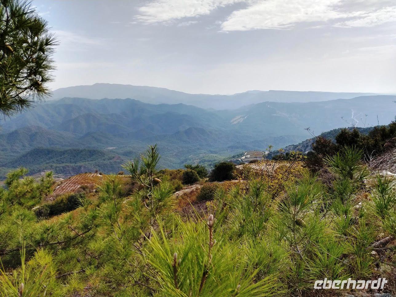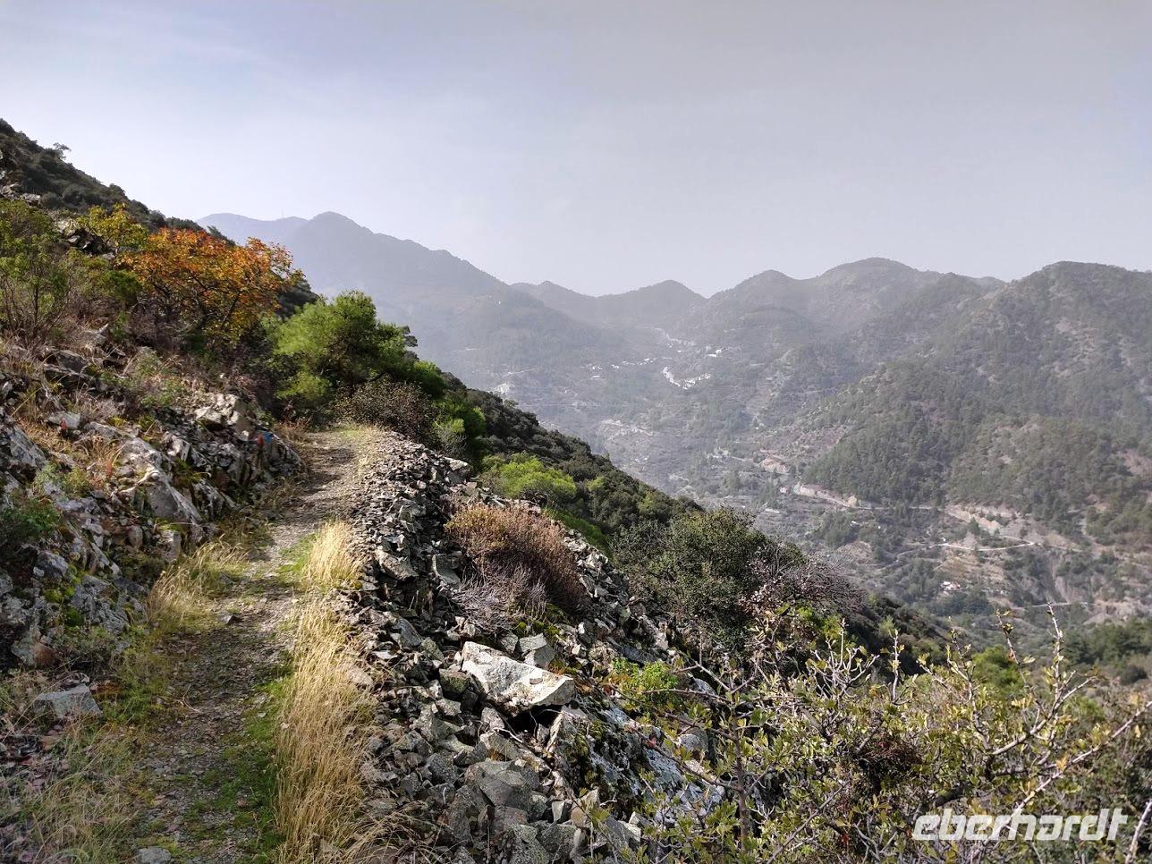 Hier begegnen wir wieder dem Europäischen Fernwanderweg E4, dem unsere Routen schon öfters folgten und der hier als Adonis-Trail fortgeführt wird. Der Liebhaber von Aphrodite soll ein schöner Jüngling gewesen sein und auch der Weg ist schön, zuerst ein leichter Anstieg bis auf den Höhenrücken und zur schön im Pinienwald gelegenen Quelle. Hier trifft er auf den Aphrodite-Weg, der weiter zur Klosterruine Pyrgos tis Rigainas und zu weiteren sehr schönen Aussichten führt.
