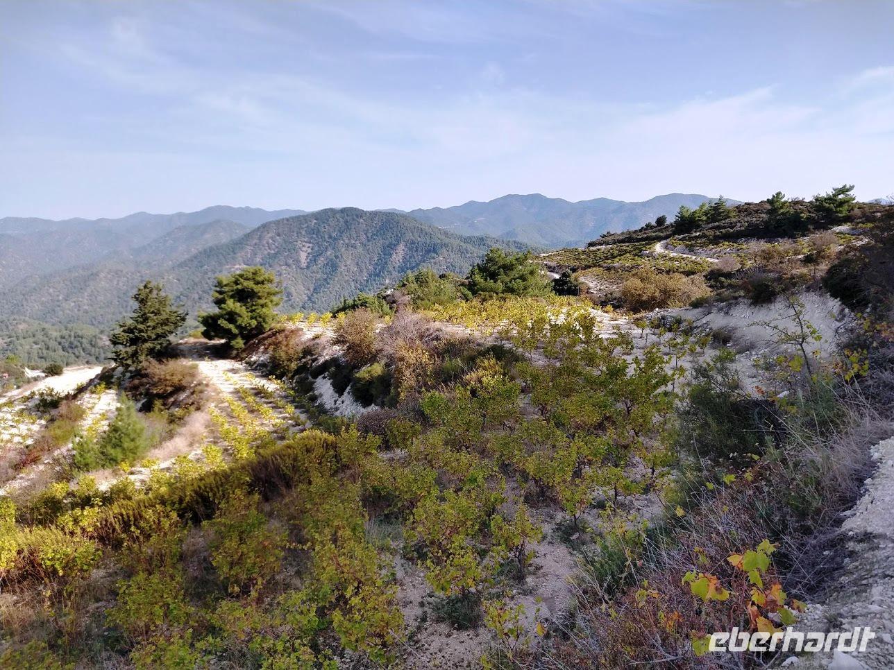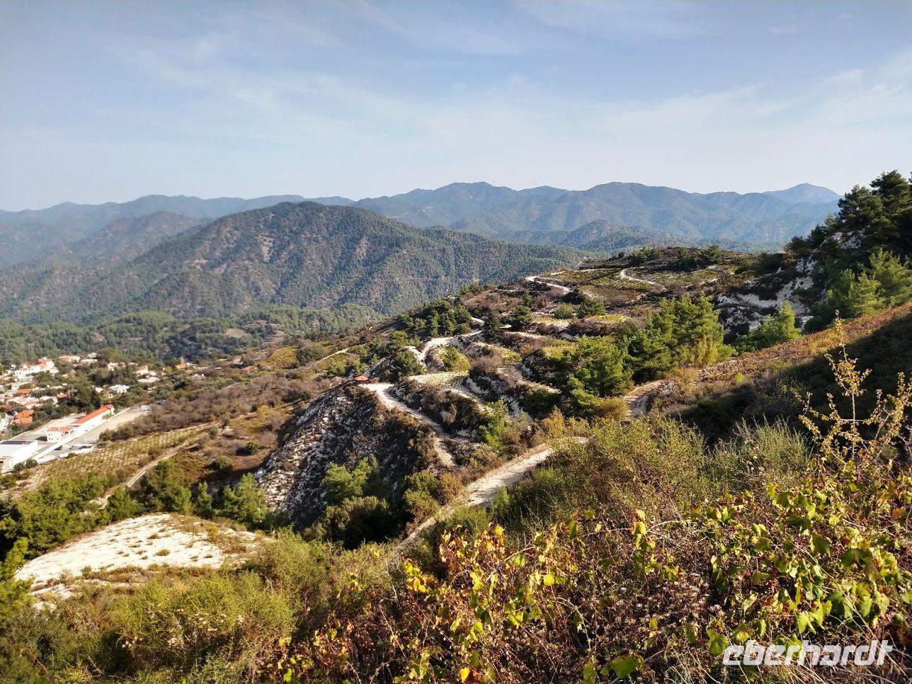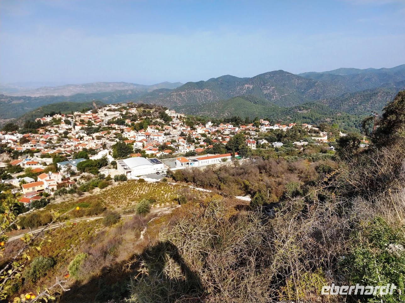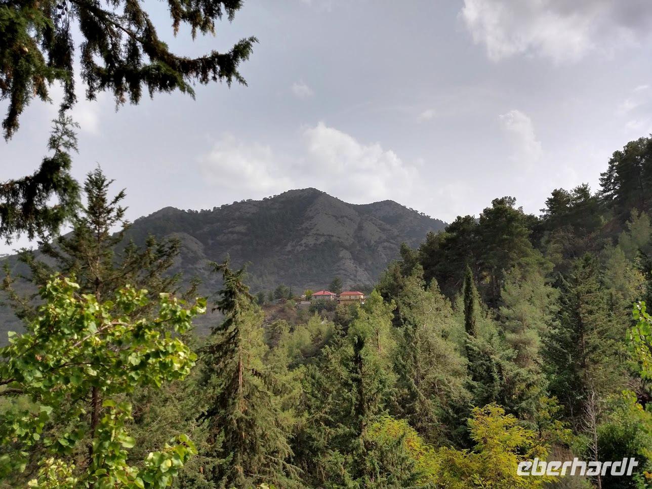Der Ort ist aber auch einer der Gründerorte für den Wandertourismus im Troodosgebirge. Auf zuerst steilem Anstieg zwischen Weingärten auf den Höhenrücken des Vouni mit seinem Feuerwachhaus. Der Weg verläuft mit tollen Aussichten zum Dorf und in die Berge des Troodos-Gebirges. Auf bequemen Wanderweg geht es zum Höhenrücken Prophetenberges weiter und dann hinab zum Kloster. Unterwegs wieder Weintrauben zum Naschen. Die Besichtigung des Klosters mit Erläuterungen von Dimitris bietet auch die Möglichkeit zum Weinkauf. Danach schließlich die Weiterfahrt zum Mittag, heute Moussaka - ein Auflauf aus Kartoffeln, Hackfleisch und einer Bechamel-Decke.