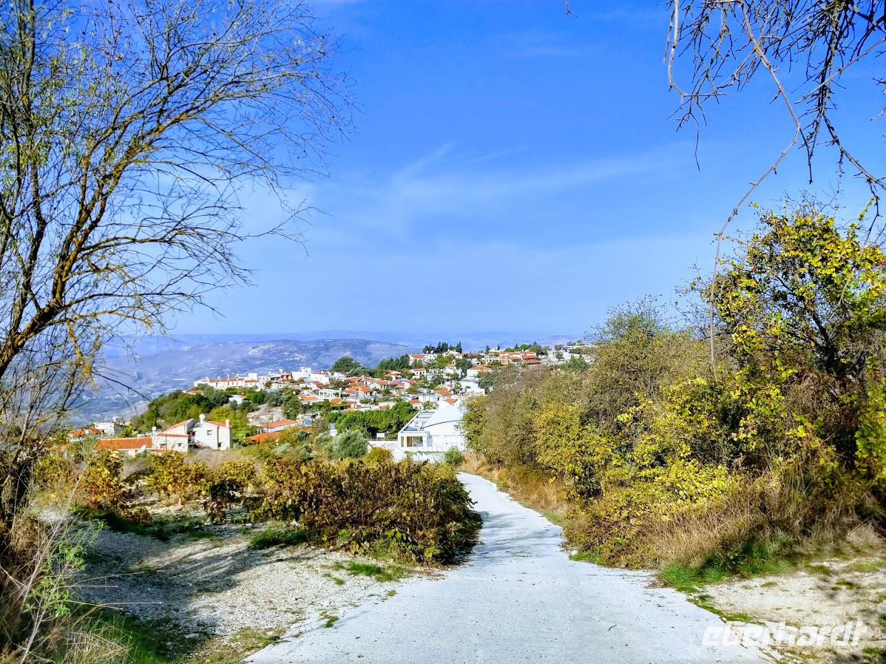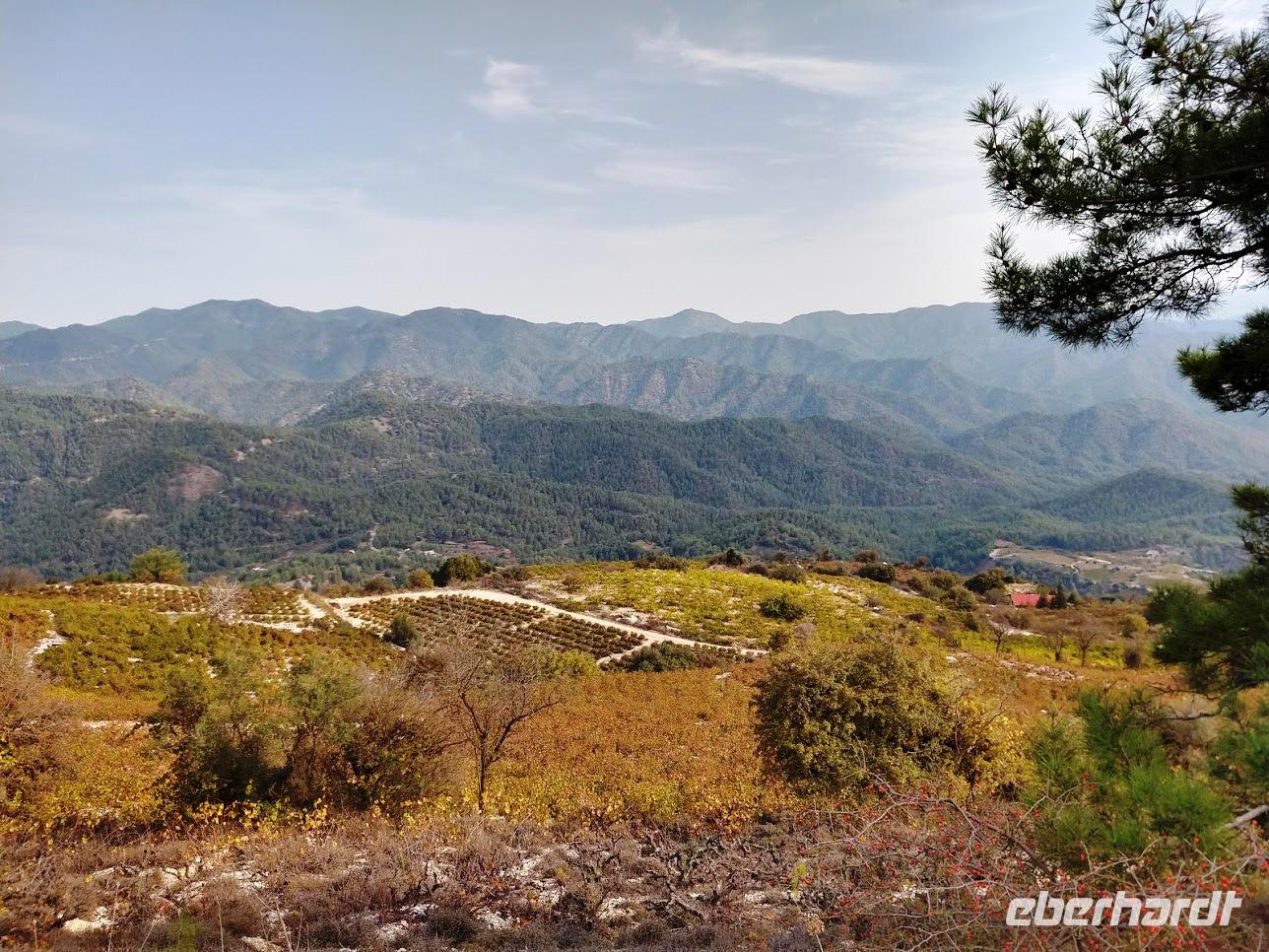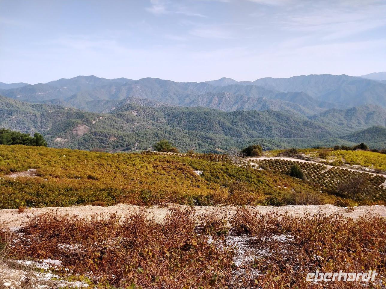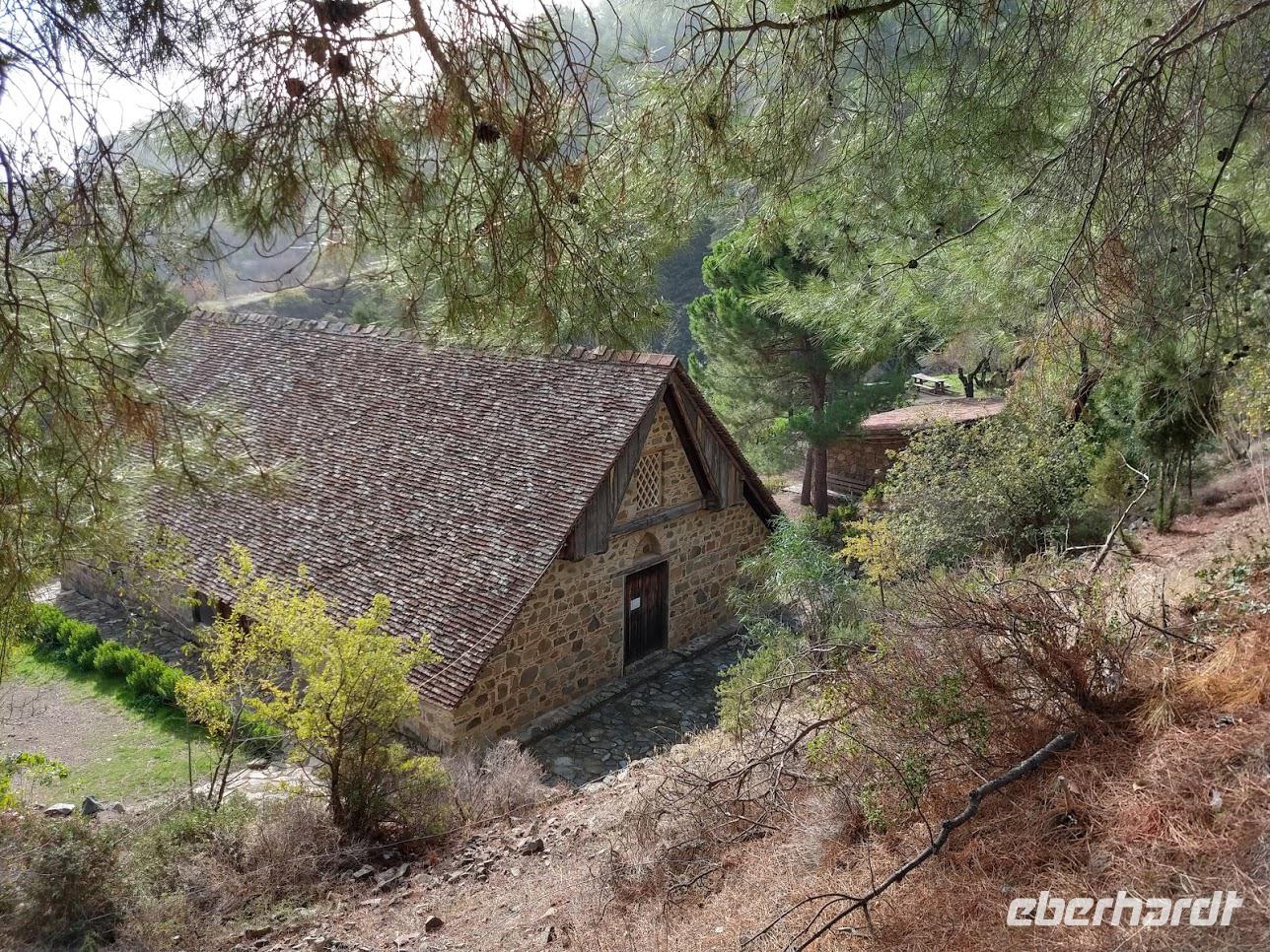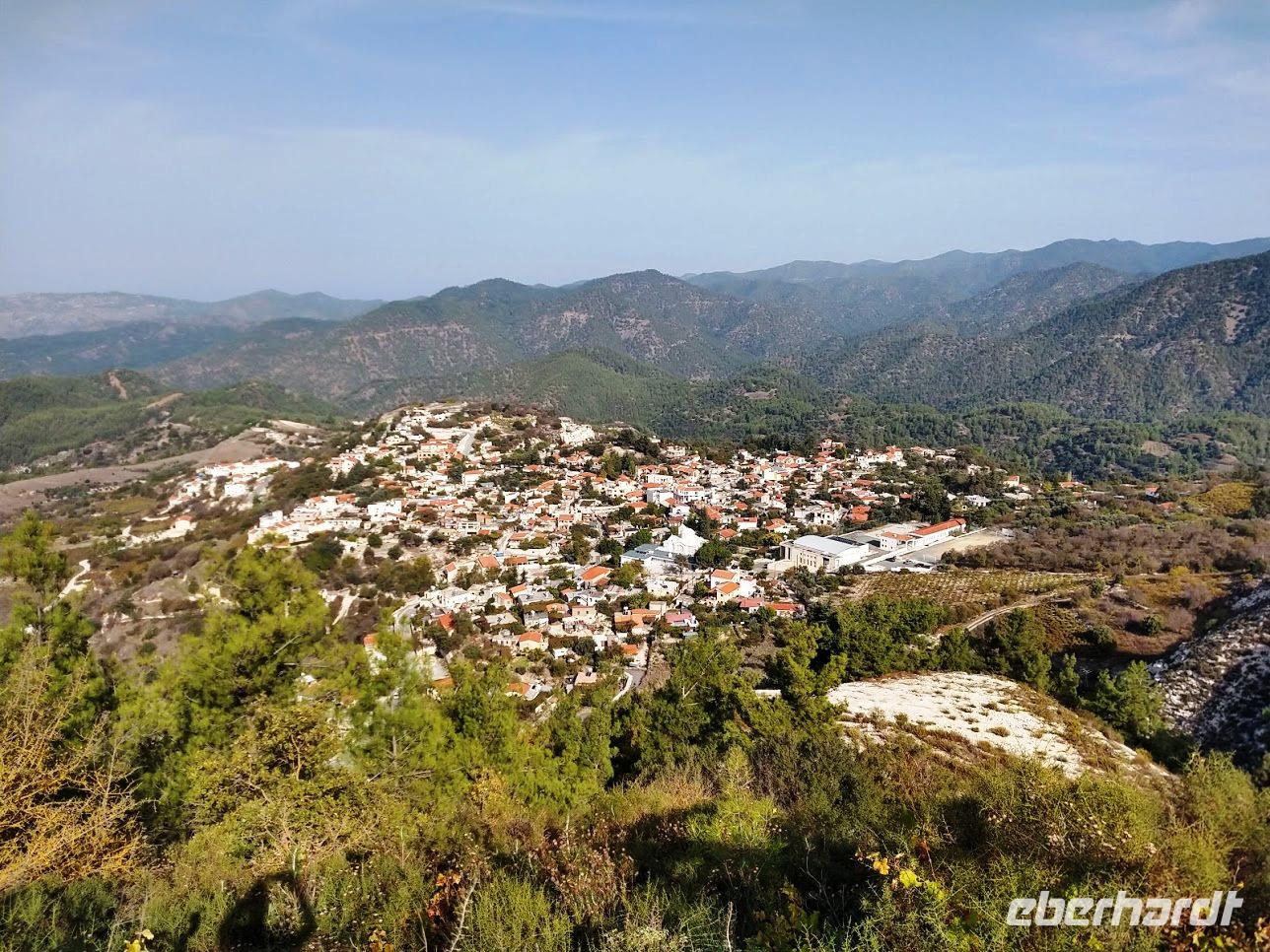 Der Ort ist aber auch einer der Gründerorte für den Wandertourismus im Troodosgebirge. Auf zuerst steilem Anstieg zwischen Weingärten auf den Höhenrücken des Vouni mit seinem Feuerwachhaus. Der Weg verläuft mit tollen Aussichten zum Dorf und in die Berge des Troodos-Gebirges. Auf bequemen Wanderweg geht es zum Höhenrücken Prophetenberges weiter und dann hinab zum Kloster. Unterwegs wieder Weintrauben zum Naschen. Die Besichtigung des Klosters mit Erläuterungen von Dimitris bietet auch die Möglichkeit zum Weinkauf. Danach schließlich die Weiterfahrt zum Mittag, heute Moussaka - ein Auflauf aus Kartoffeln, Hackfleisch und einer Bechamel-Decke.