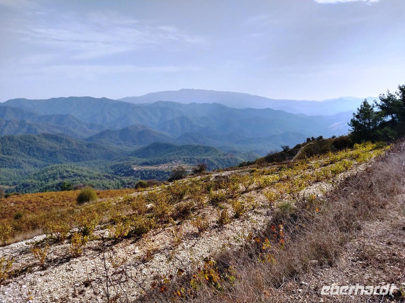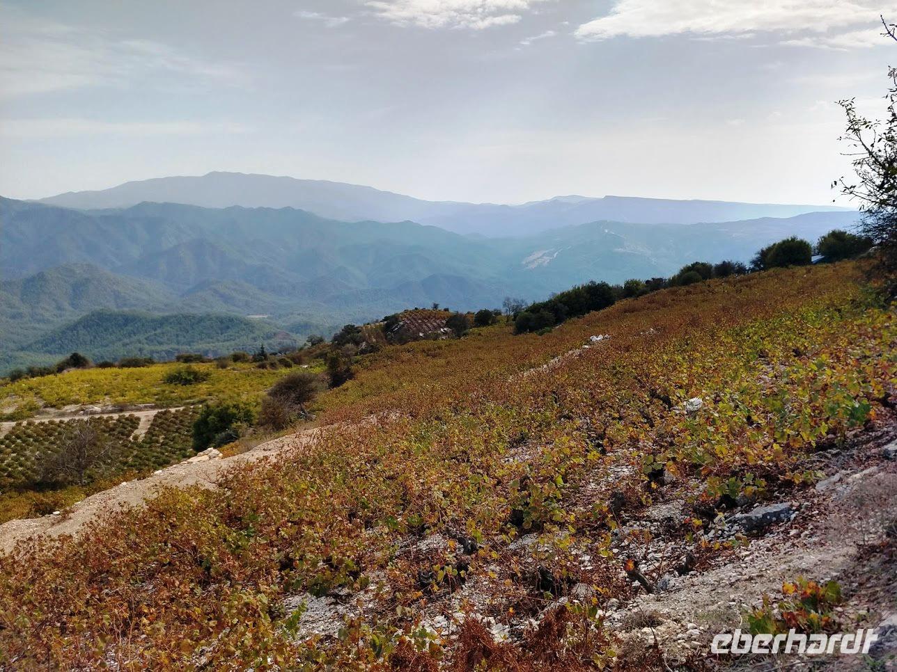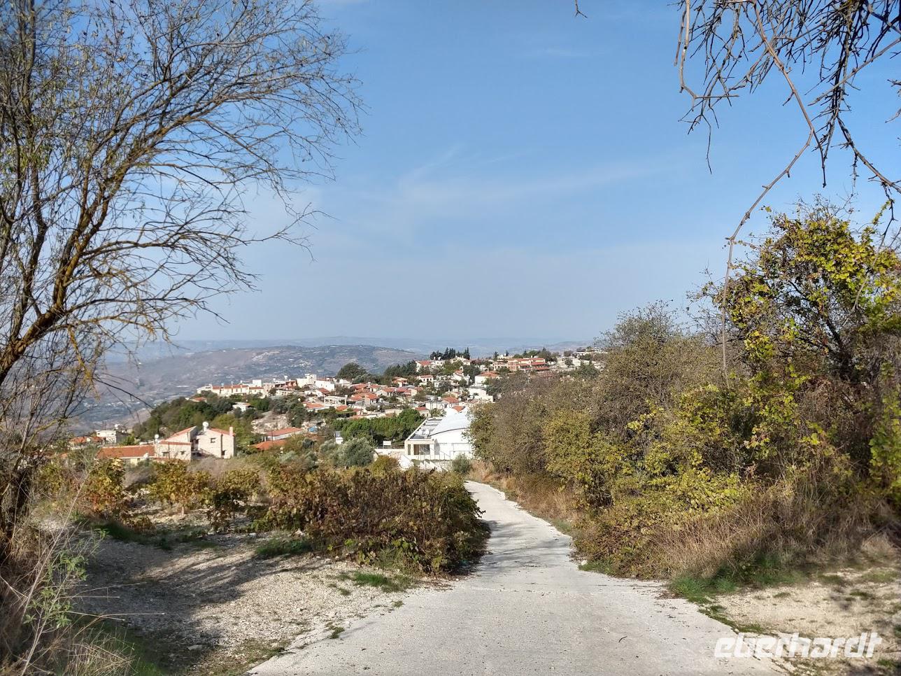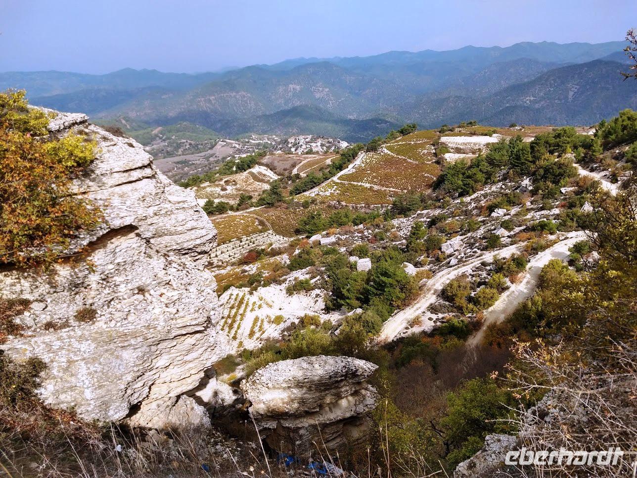 Der Ort ist aber auch einer der Gründerorte für den Wandertourismus im Troodosgebirge. Auf zuerst steilem Anstieg zwischen Weingärten auf den Höhenrücken des Vouni mit seinem Feuerwachhaus. Der Weg verläuft mit tollen Aussichten zum Dorf und in die Berge des Troodos-Gebirges. Auf bequemen Wanderweg geht es zum Höhenrücken Prophetenberges weiter und dann hinab zum Kloster. Unterwegs wieder Weintrauben zum Naschen. Die Besichtigung des Klosters mit Erläuterungen von Dimitris bietet auch die Möglichkeit zum Weinkauf. Danach schließlich die Weiterfahrt zum Mittag, heute Moussaka - ein Auflauf aus Kartoffeln, Hackfleisch und einer Bechamel-Decke.