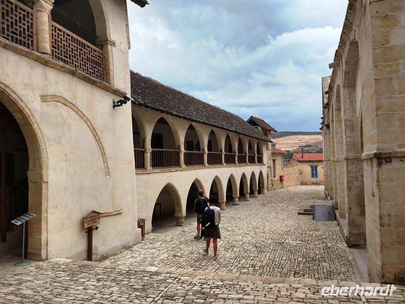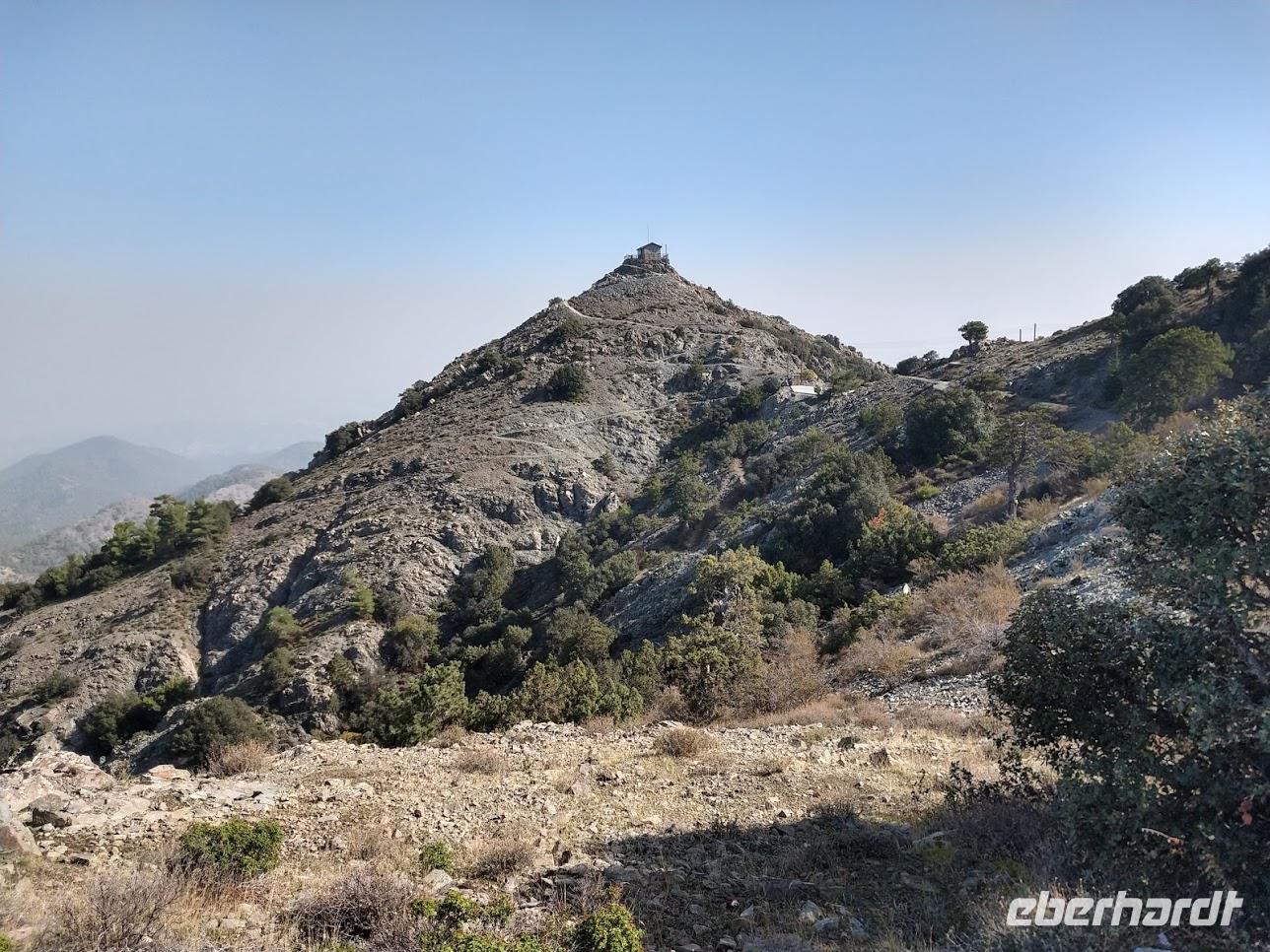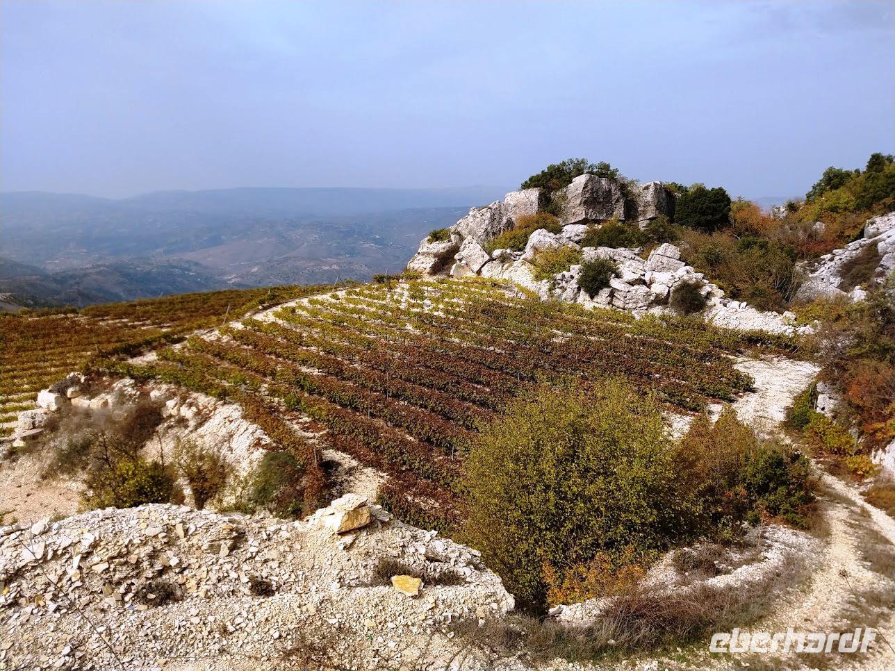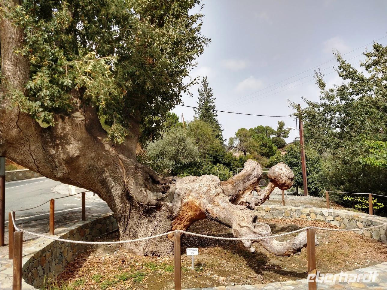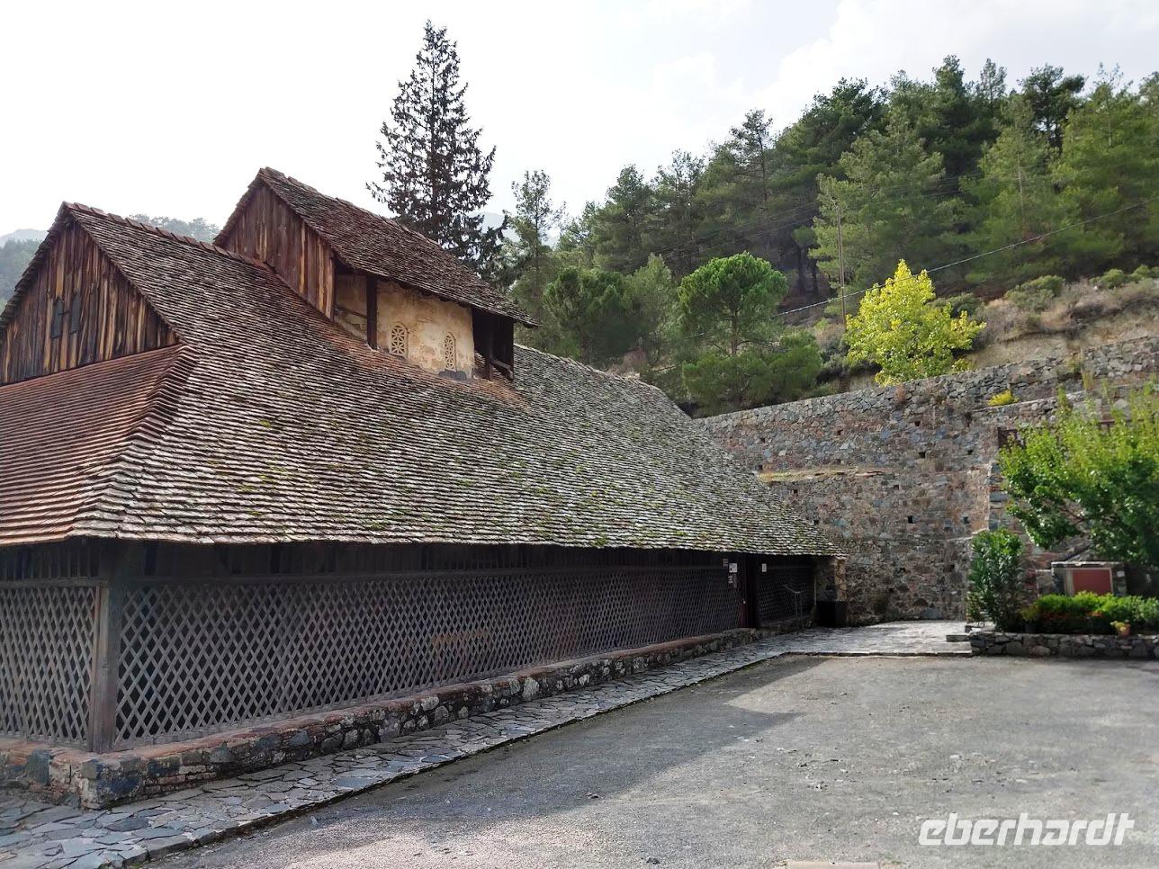 Der Ort ist aber auch einer der Gründerorte für den Wandertourismus im Troodosgebirge. Auf zuerst steilem Anstieg zwischen Weingärten auf den Höhenrücken des Vouni mit seinem Feuerwachhaus. Der Weg verläuft mit tollen Aussichten zum Dorf und in die Berge des Troodos-Gebirges. Auf bequemen Wanderweg geht es zum Höhenrücken Prophetenberges weiter und dann hinab zum Kloster. Unterwegs wieder Weintrauben zum Naschen. Die Besichtigung des Klosters mit Erläuterungen von Dimitris bietet auch die Möglichkeit zum Weinkauf. Danach schließlich die Weiterfahrt zum Mittag, heute Moussaka - ein Auflauf aus Kartoffeln, Hackfleisch und einer Bechamel-Decke.