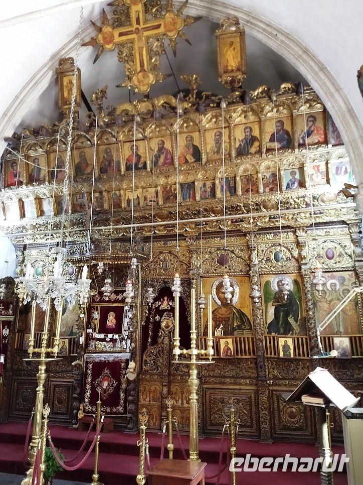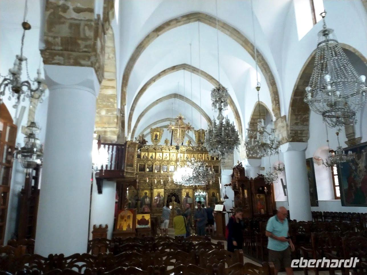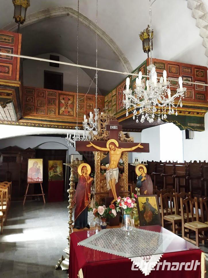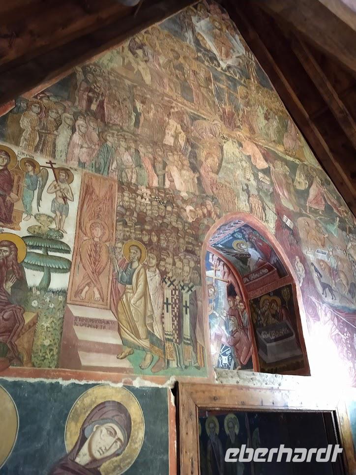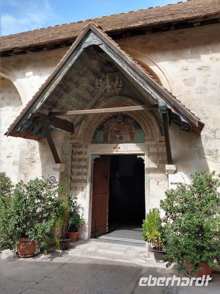Dann erfolgte der Abstieg zum Dorf Lagoudera und wieder bergan im Ort erreichten wir bald die schön gelegene Scheunendachkirche Panagia tou Arakou. Auch hier war wieder sehr schöne Fresken- und Ikonenmalerei zu besichtigen. Beide Kirchen stehen nicht umsonst auf der UNESCO-Weltkulturerbeliste.