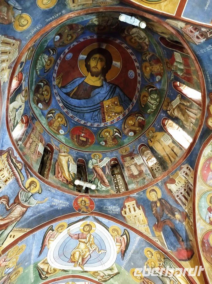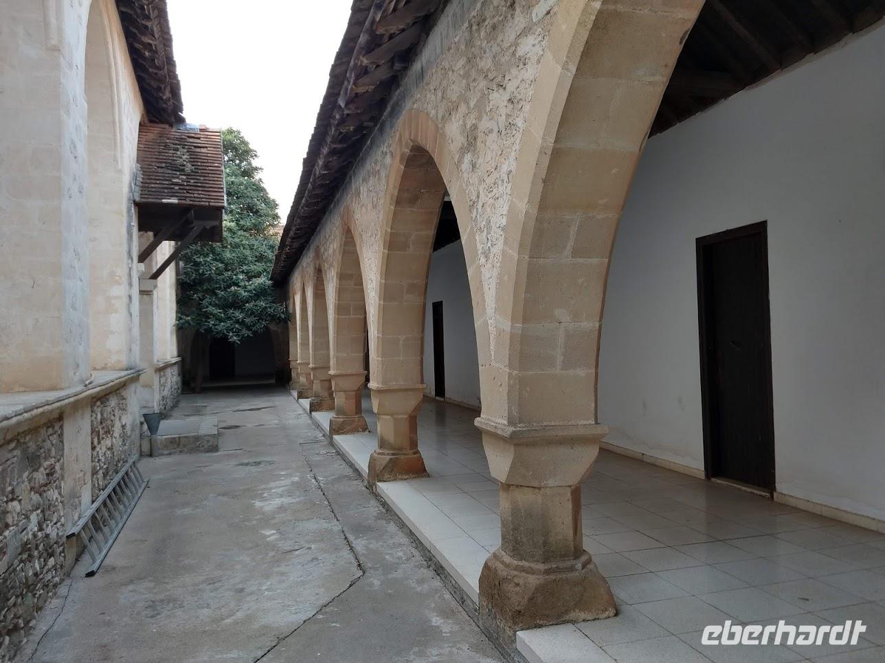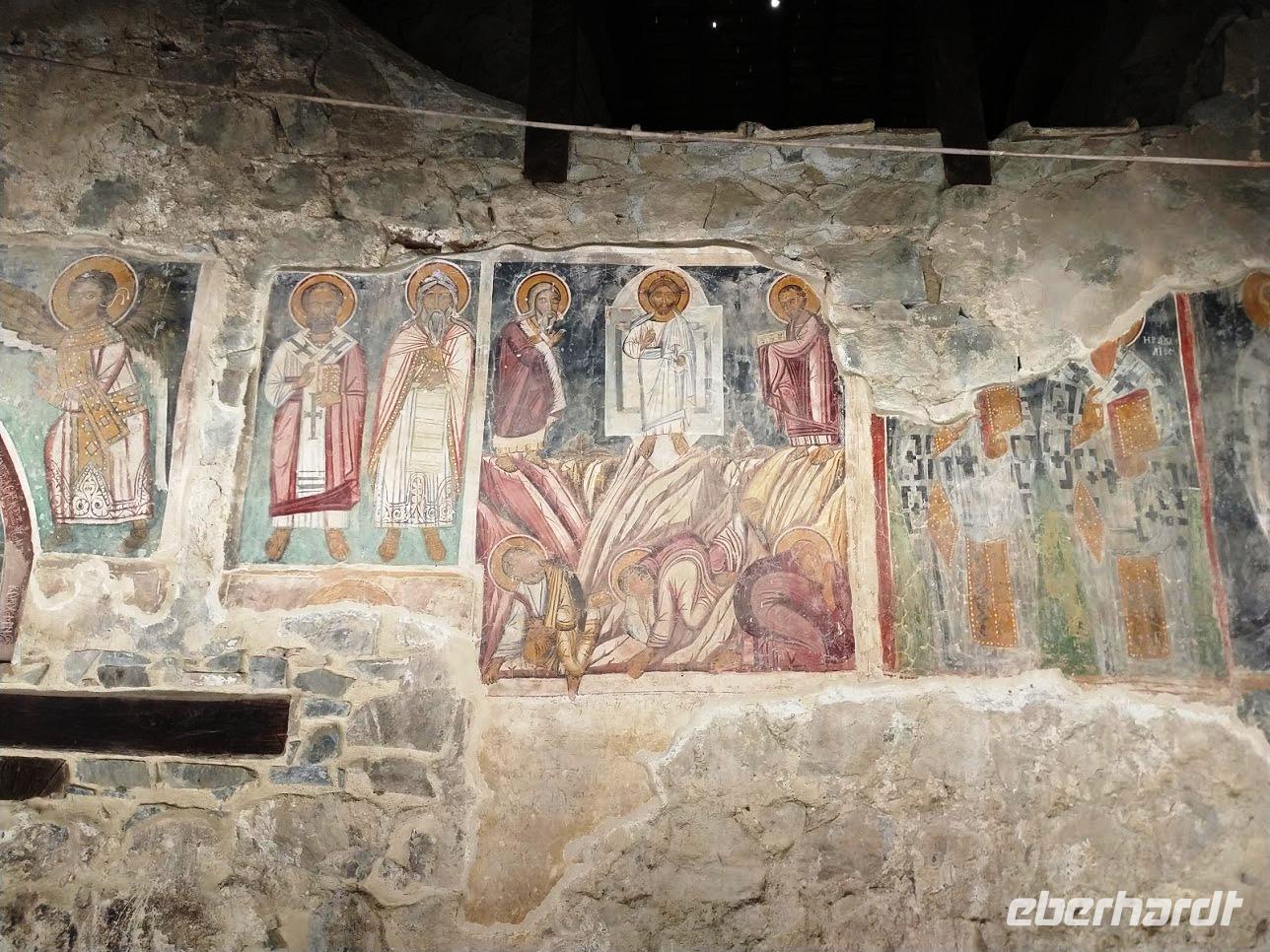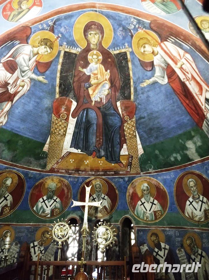 Dann erfolgte der Abstieg zum Dorf Lagoudera und wieder bergan im Ort erreichten wir bald die schön gelegene Scheunendachkirche Panagia tou Arakou. Auch hier war wieder sehr schöne Fresken- und Ikonenmalerei zu besichtigen. Beide Kirchen stehen nicht umsonst auf der UNESCO-Weltkulturerbeliste.