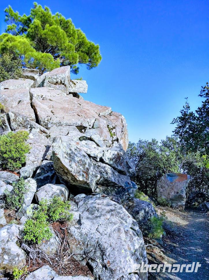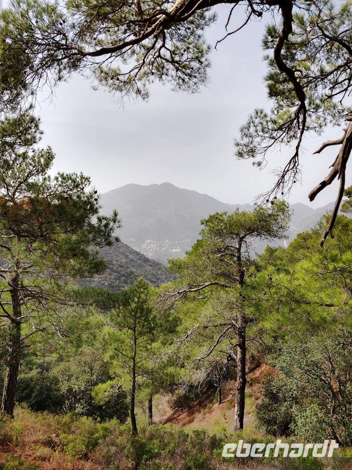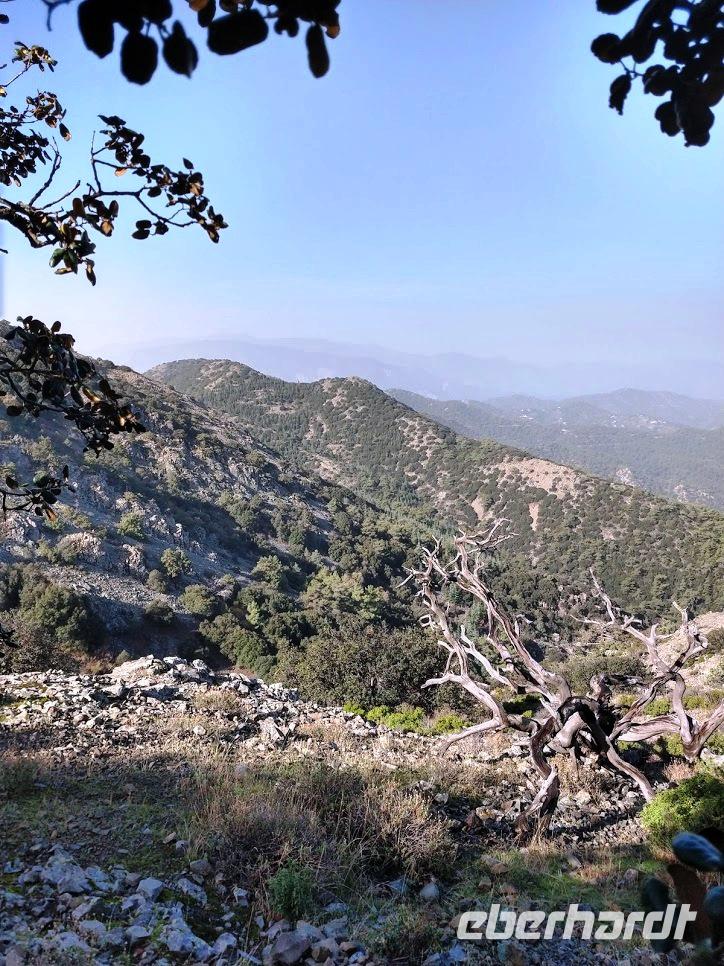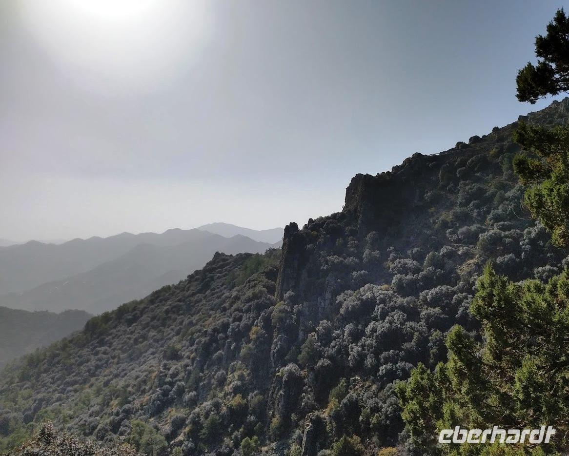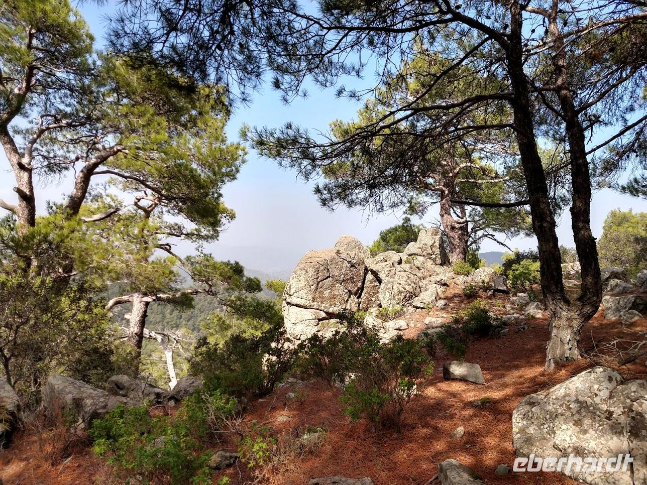 Danach begann unsere Wanderung durch den Pinien-, Wacholder- und Goldeichenwald. Dabei ging zuerst stetig bergan, bis wir den Grad des Höhenrückens erreicht hatten. Leider waren die Ausblicke durch die etwas diesige Sommerwitterung etwas getrübt. Der Weg führte nun auf dem Höhenzug entlang.