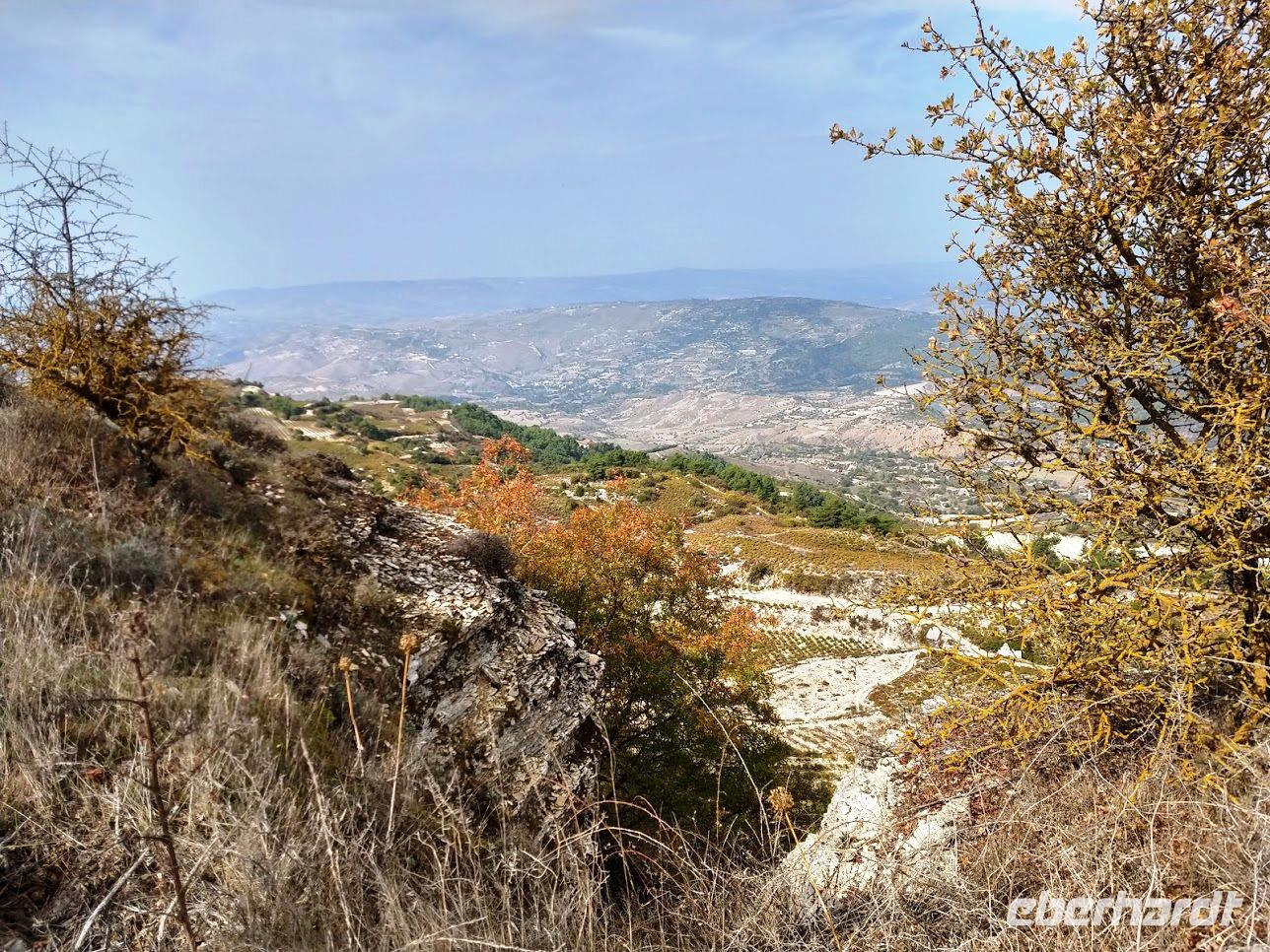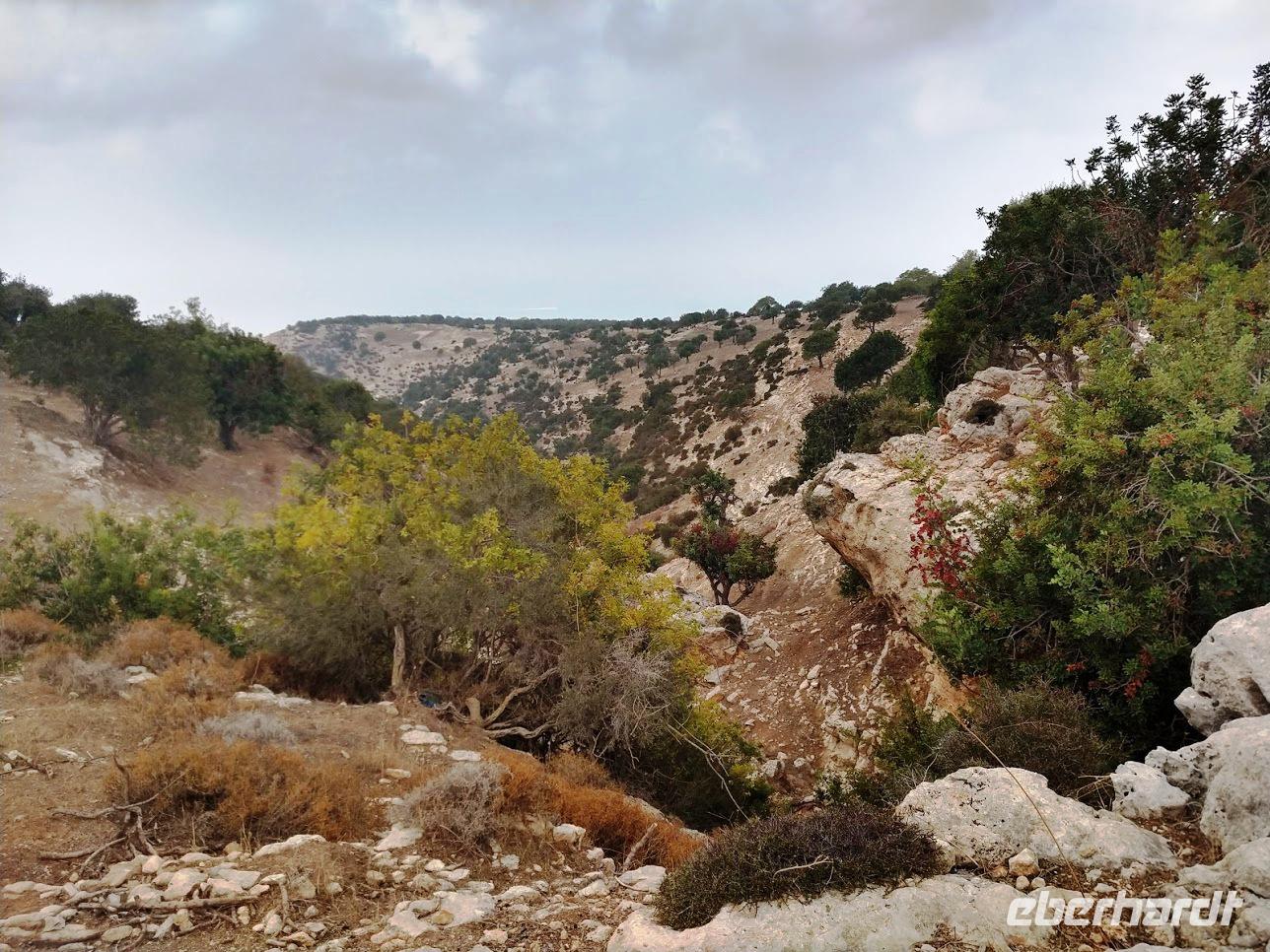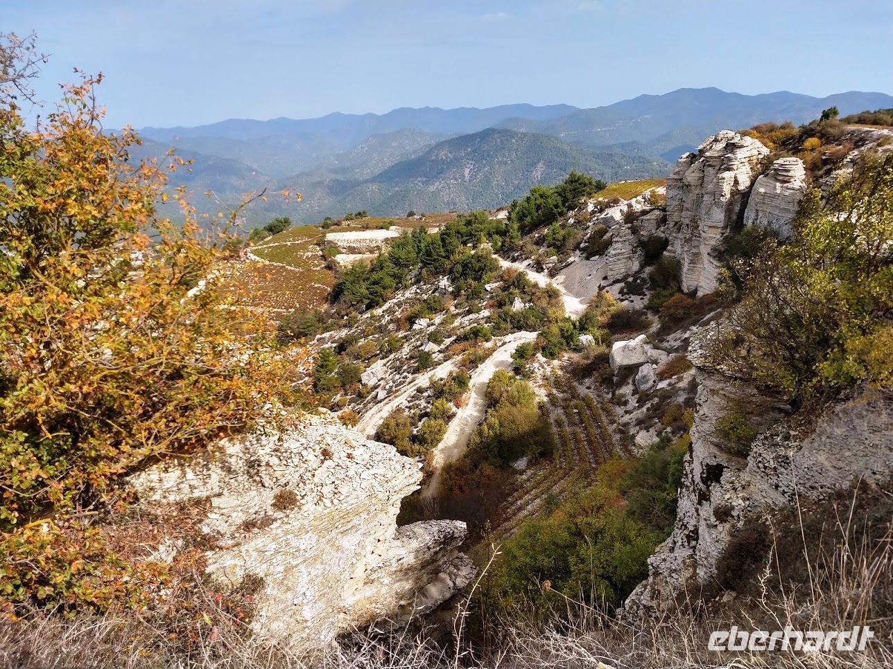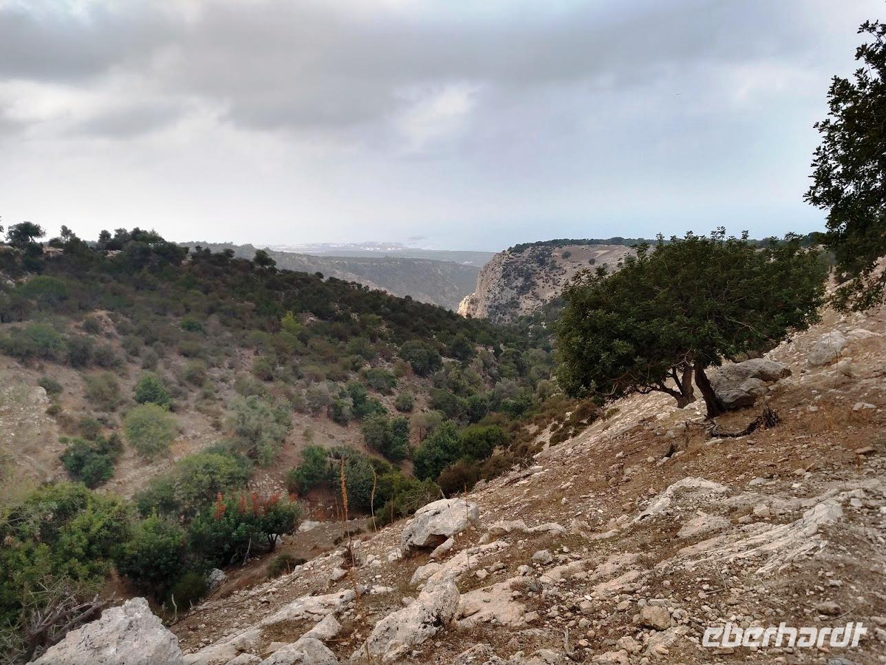 Vom Kalksteinplateau von Laona ist Ausgangspunkt unserer Wanderung. Leider bieten sich im ersten Abschnitt durch das trübe Wetter keine perfekten Aussichten auf die eigentlich nahe Küste. Erst durch Plantagen, dann auf alten Ziegenpfaden nähern wir uns Zyperns bekanntestem Canyon. Der Schluchtbereich ist dann auch sehr interessant. Sowohl die Felsformationen, die Tiefblicke in die Schlucht und als auch die Pflanzenwelt sind sehenswert. Wir identifizieren Herbstblausterne und blühende Meereszwiebeln.